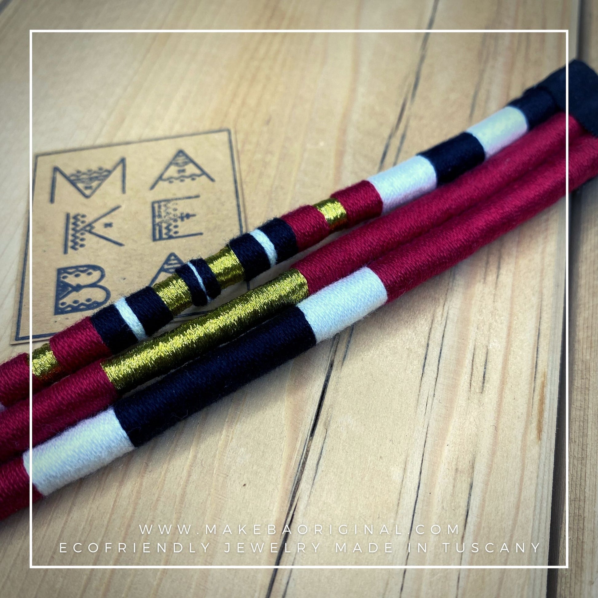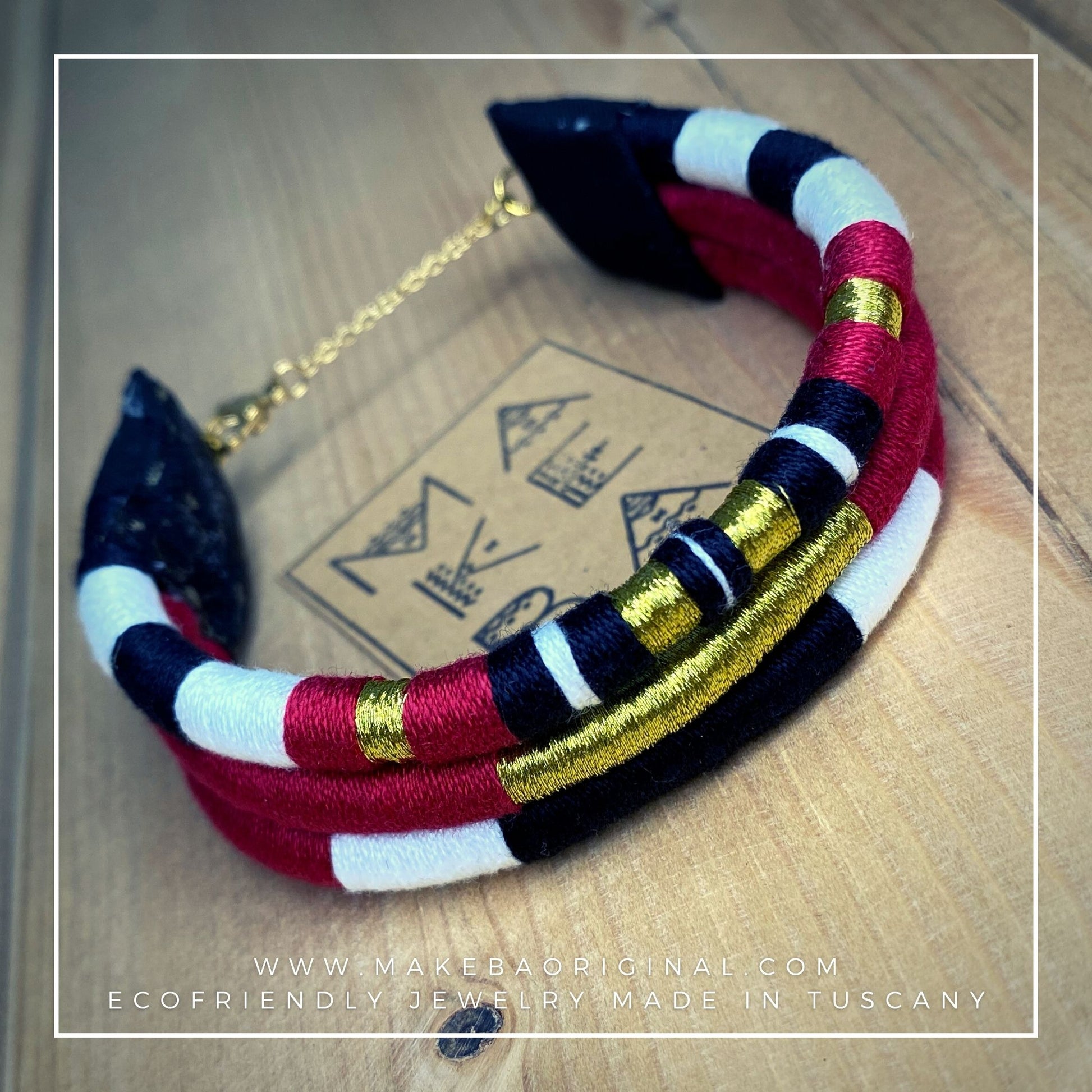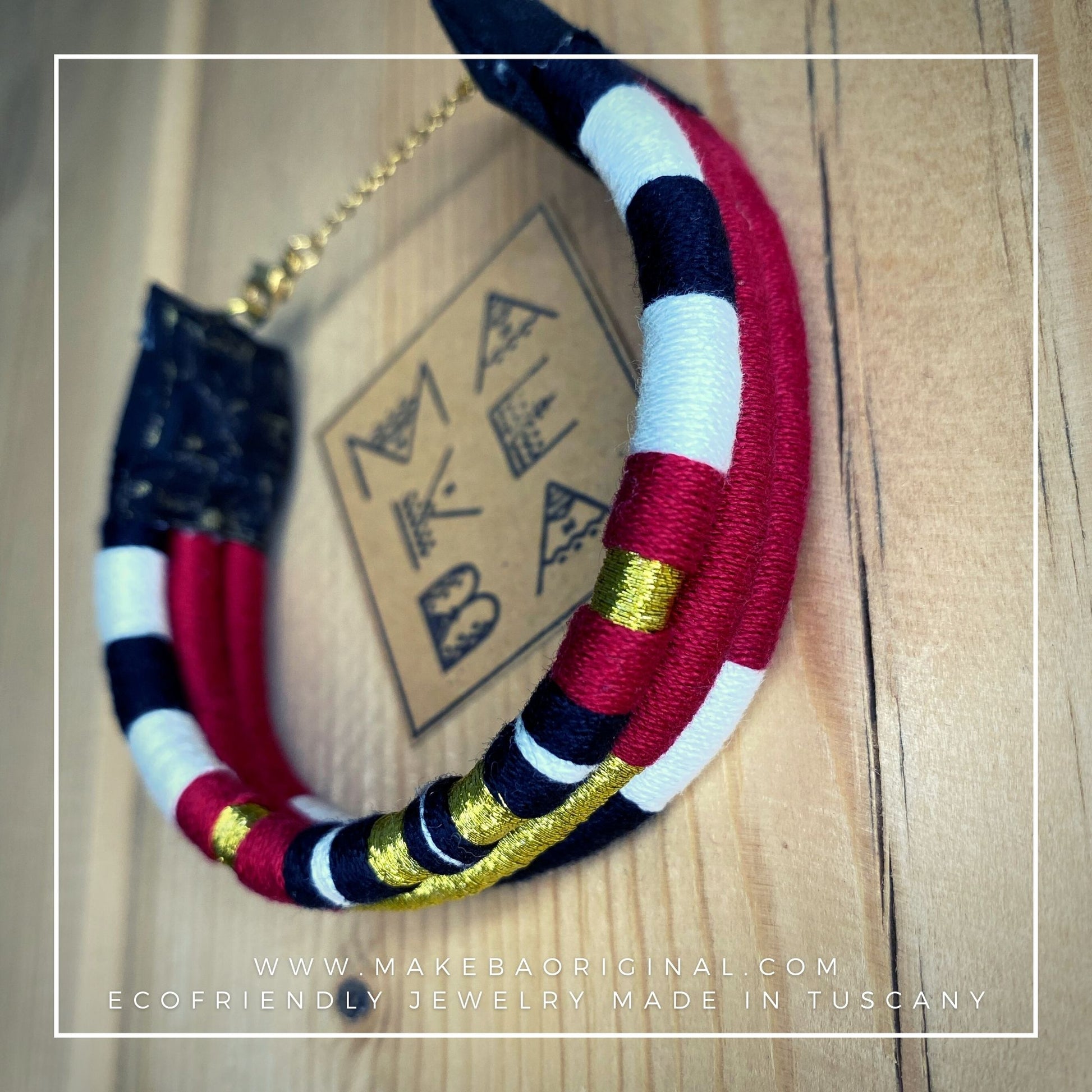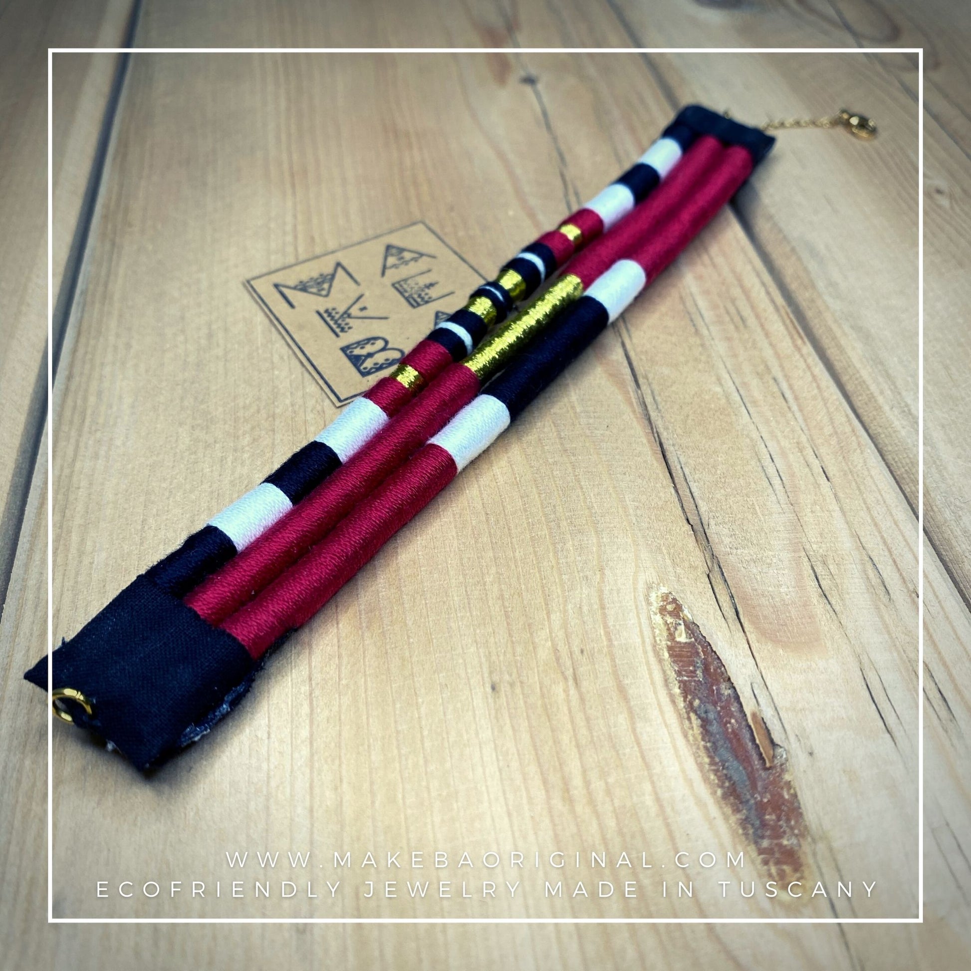 Bracciale semi-rigido con tre elementi in cotone 100% e acciaio anallergico. Chiusura con moschettone e catenella regolabile in 3 lunghezze.