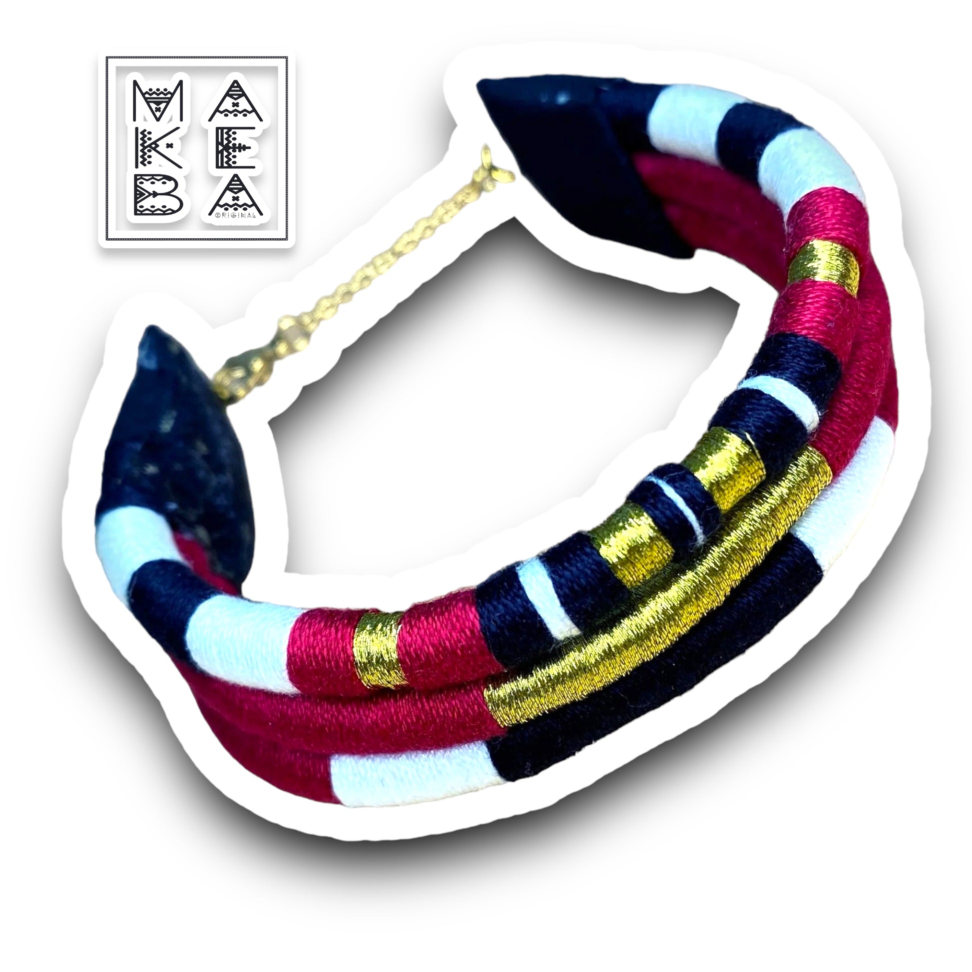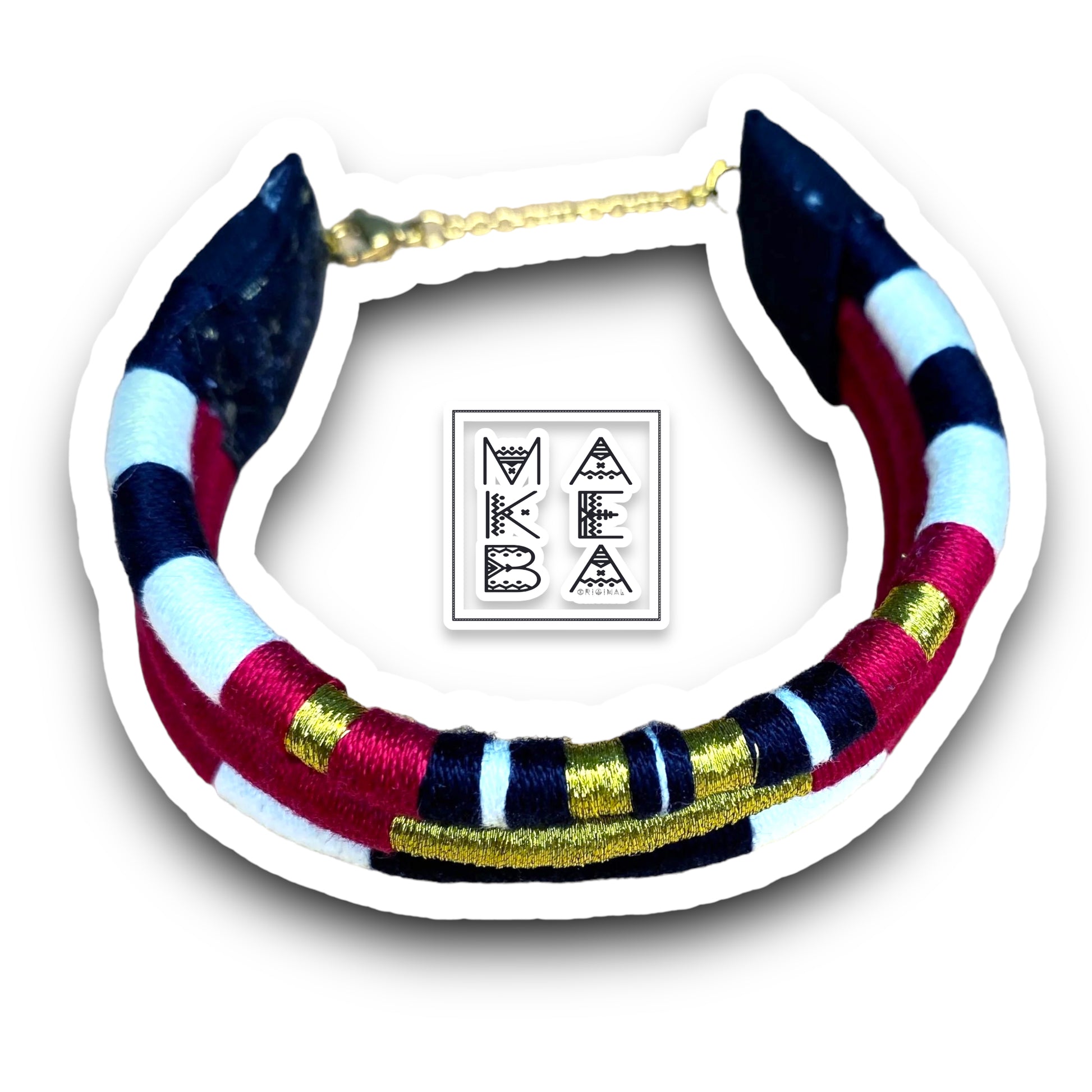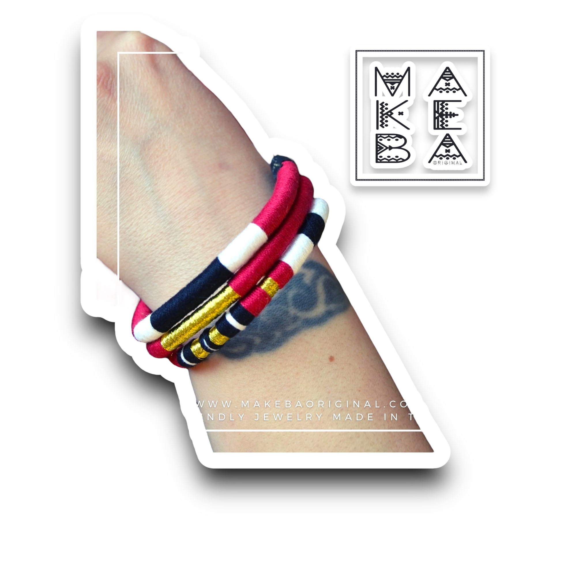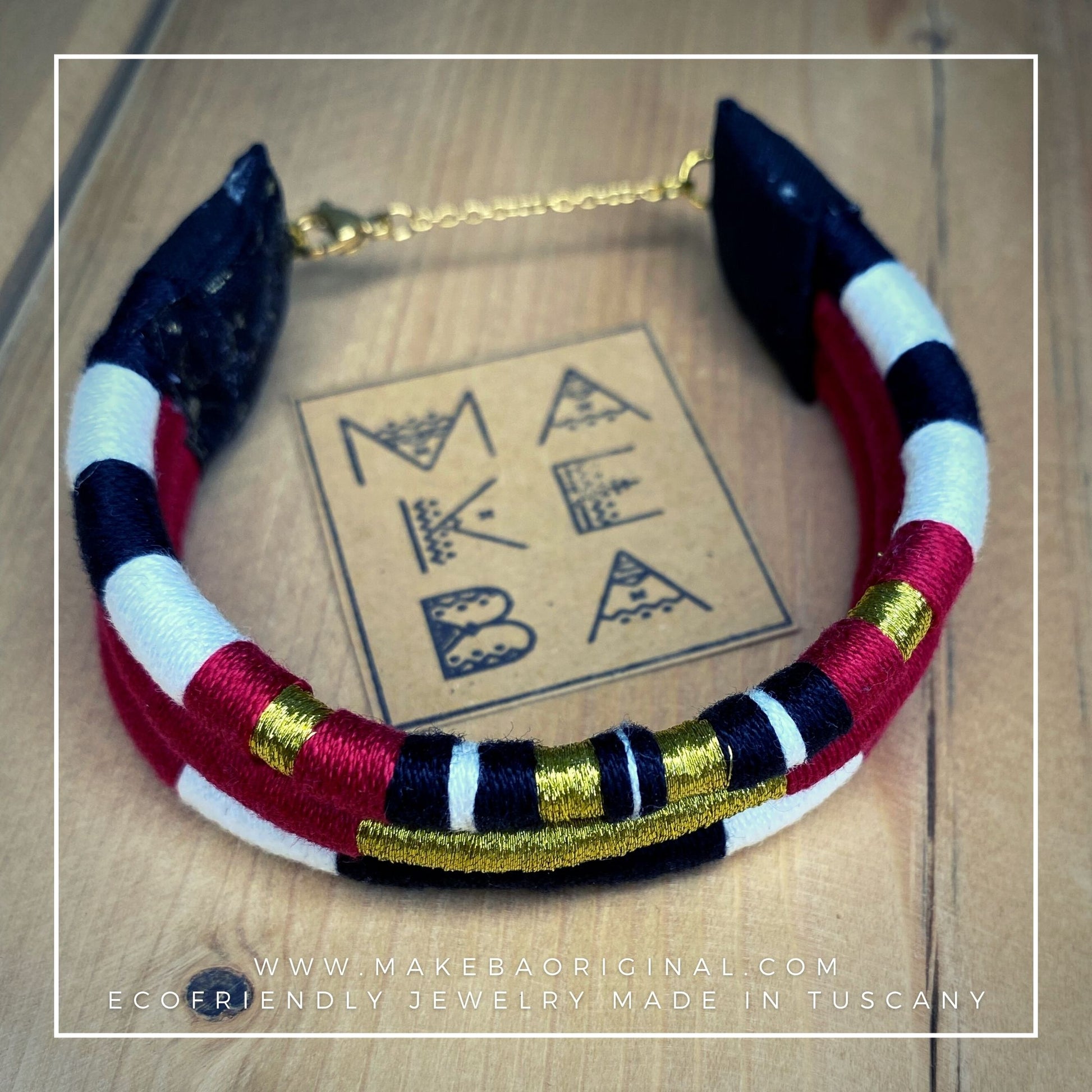 Bracciale semi-rigido con tre elementi in cotone 100% e acciaio anallergico. Chiusura con moschettone e catenella regolabile in 3 lunghezze.