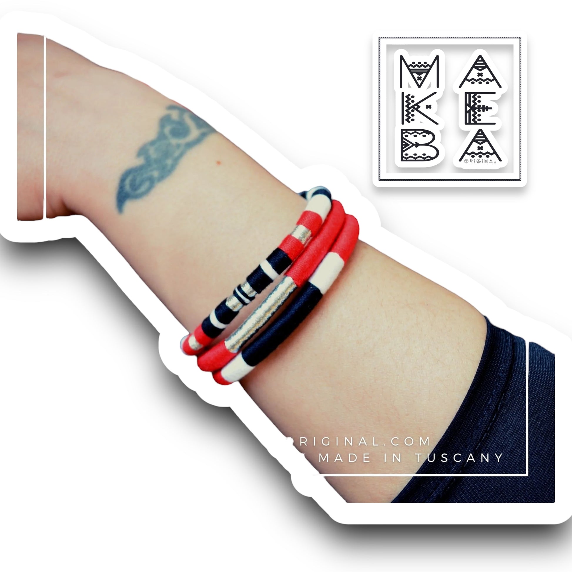 Bracciale semi-rigido con tre elementi in cotone 100% e acciaio anallergico. Chiusura con moschettone e catenella regolabile in 3 lunghezze.