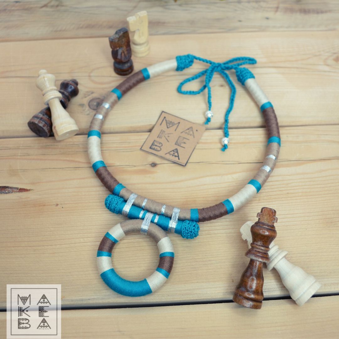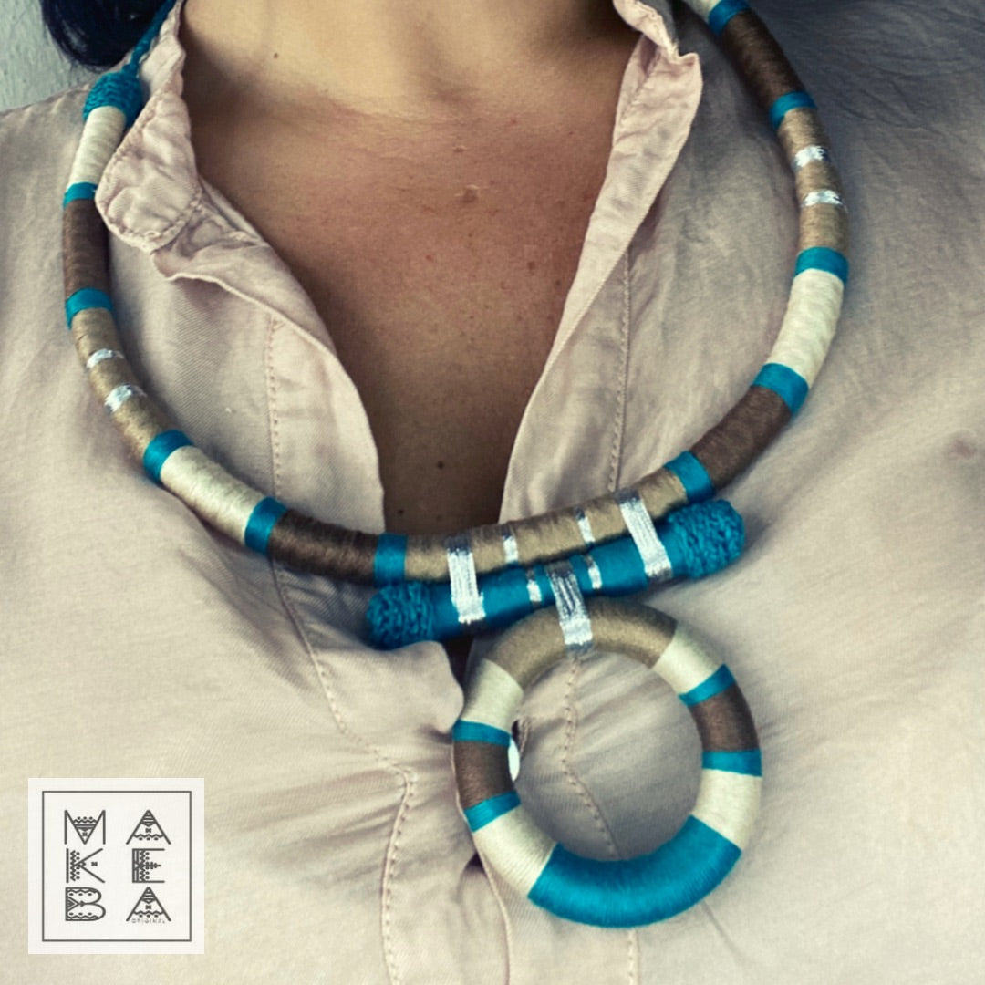 Collana semi-rigida modellabile, formata da un cordino principale ed elementi centrali in legno ricoperti di cotone e filo di lamé argentato.