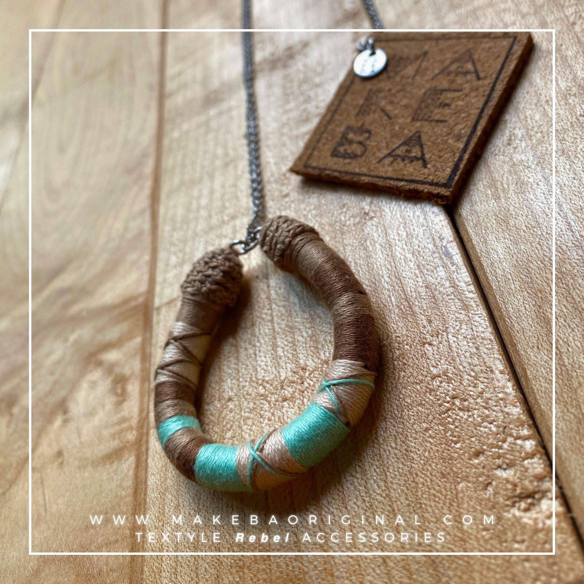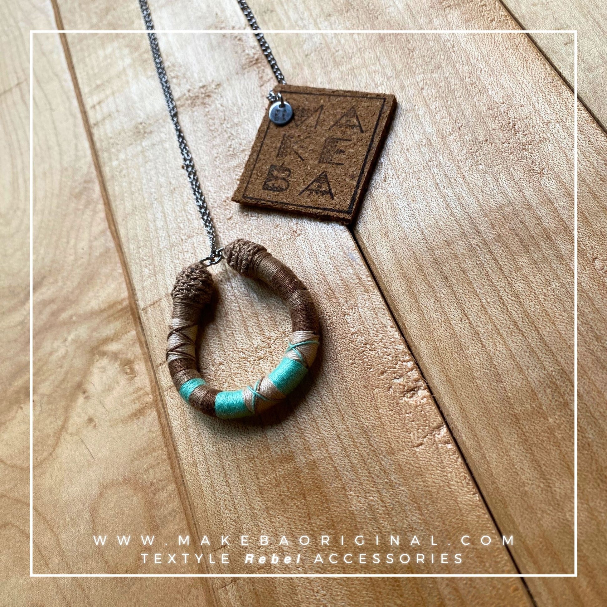 Collana a pendente in cotone organico e acciaio, chiusura a moschettone. La lunghezza della catenella è estensibile, per portarla come più ti piace.