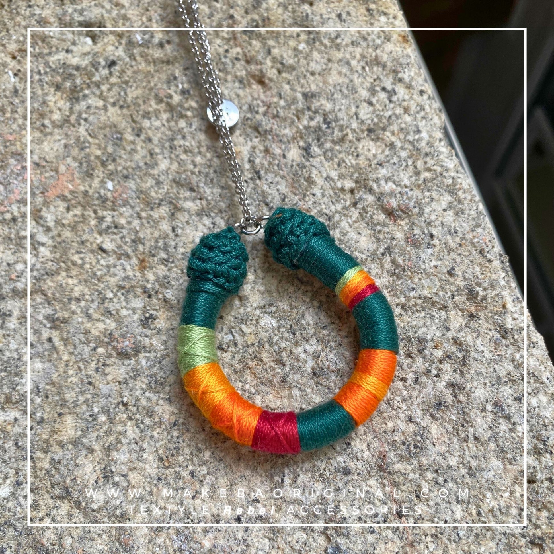 Collana a pendente in cotone organico e acciaio, chiusura a moschettone. La lunghezza della catenella è estensibile, per portarla come più ti piace.