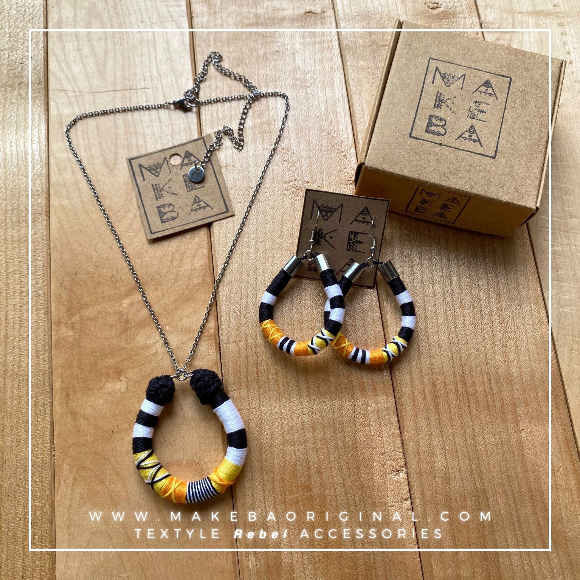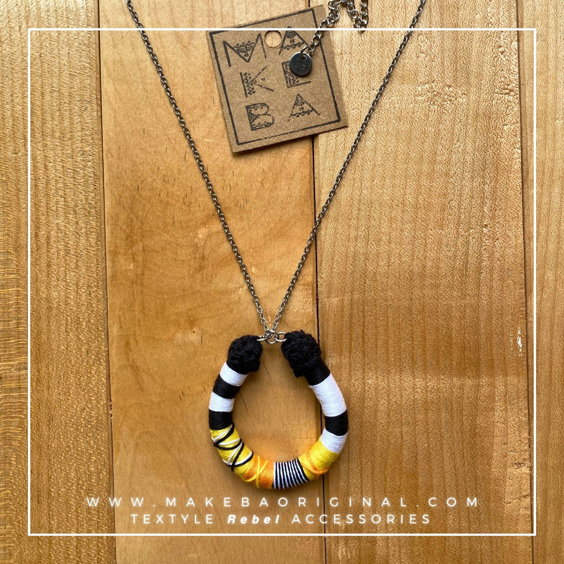 Collana a pendente in cotone organico e acciaio, chiusura a moschettone. La lunghezza della catenella è estensibile, per portarla come più ti piace.