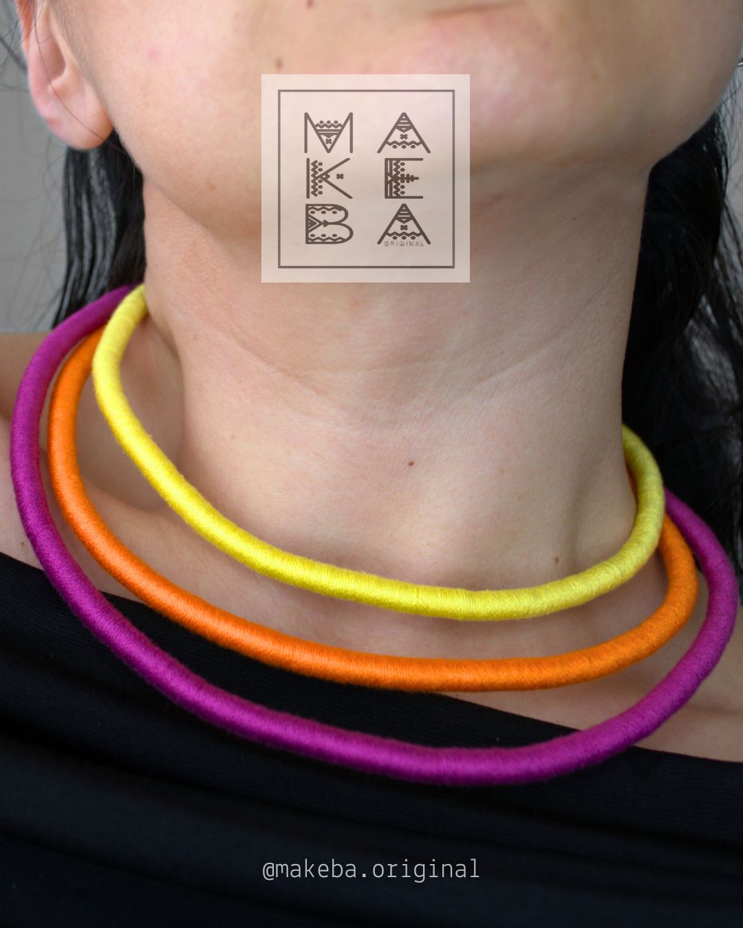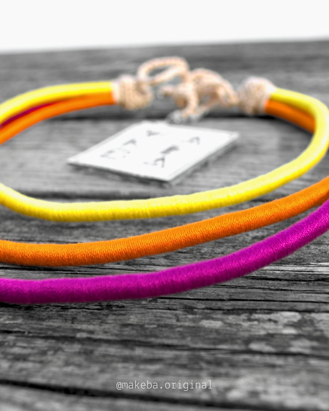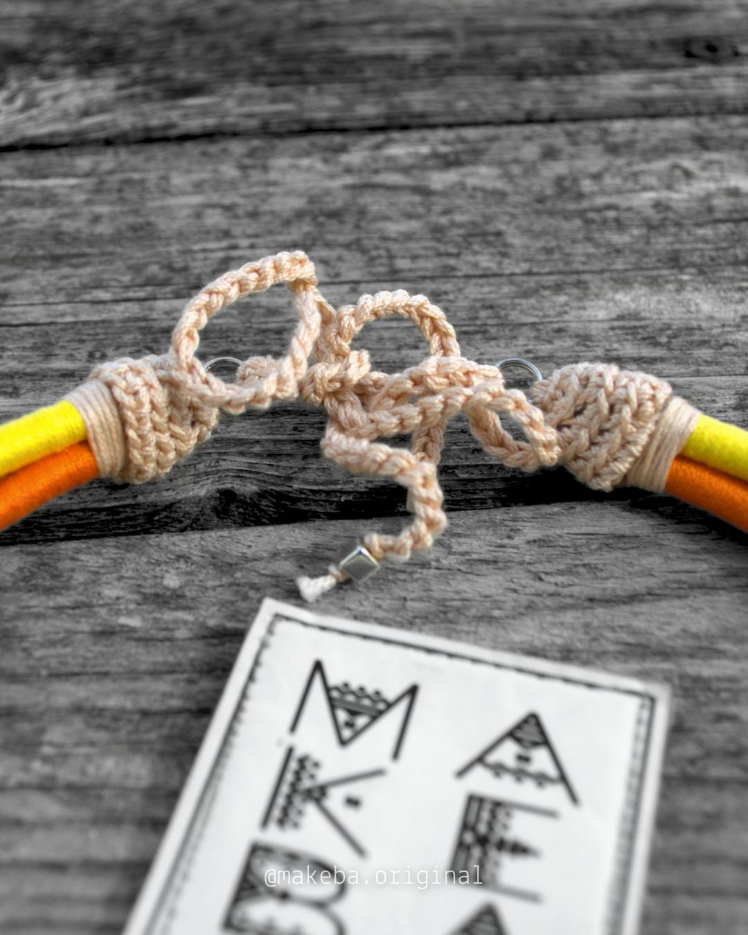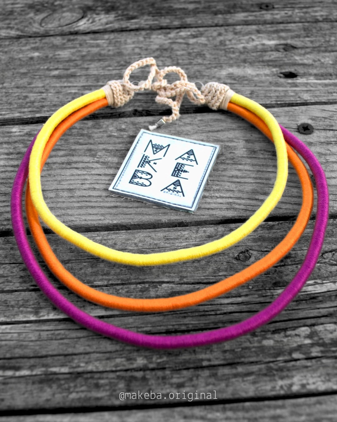 Collana artigianale in cotone 100% con anima in plastica riciclata: modellabile, leggera e irresistibilmente versatile.