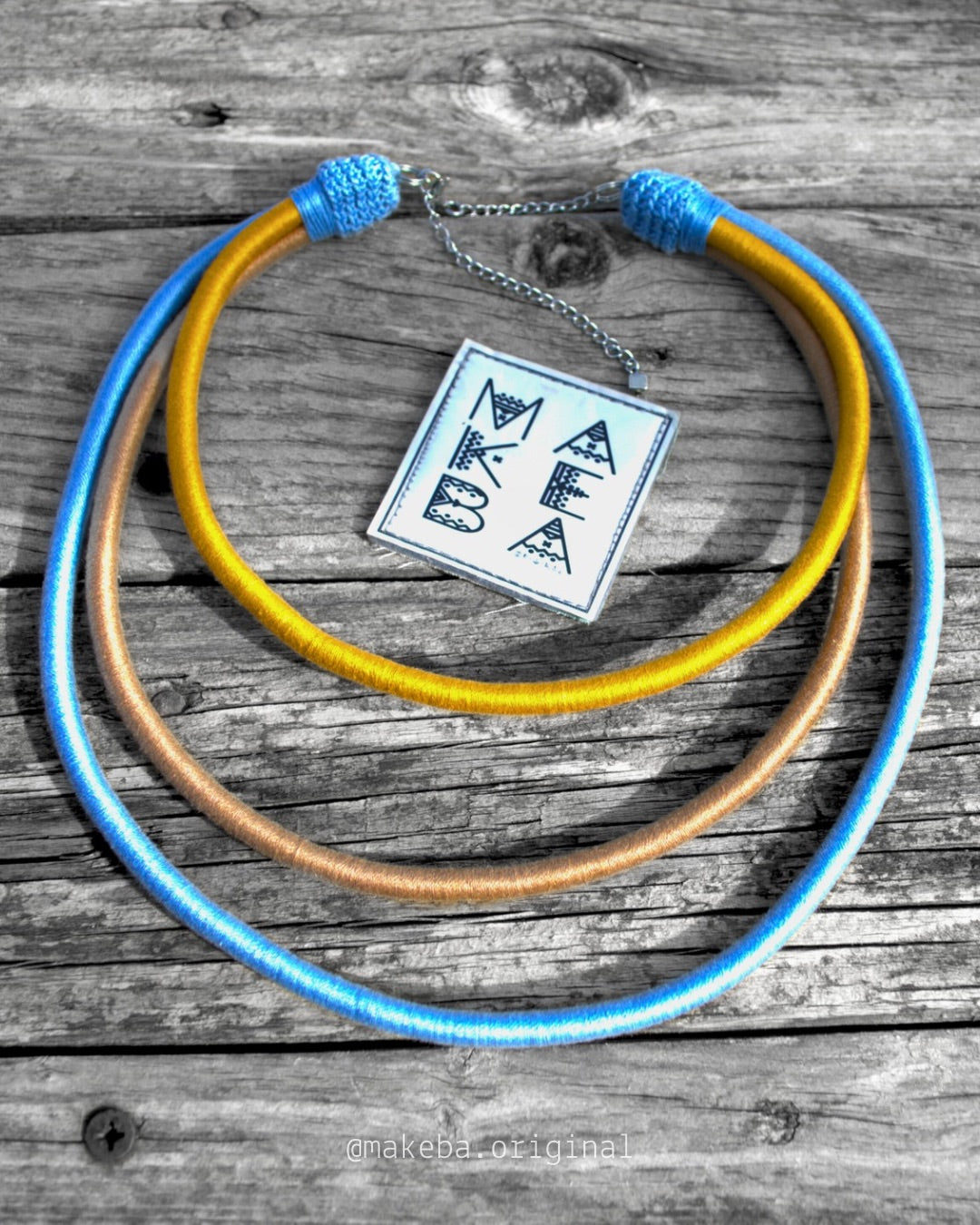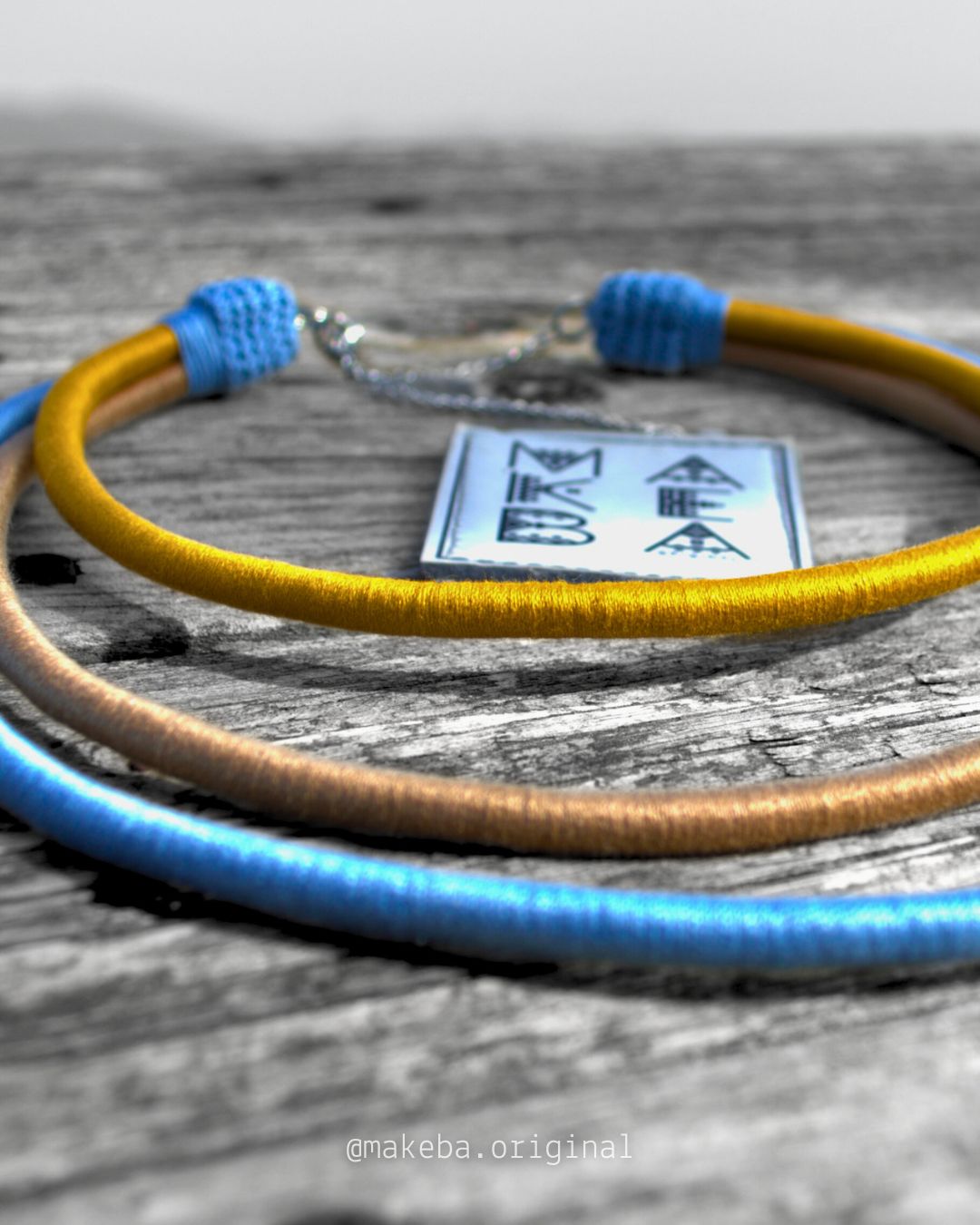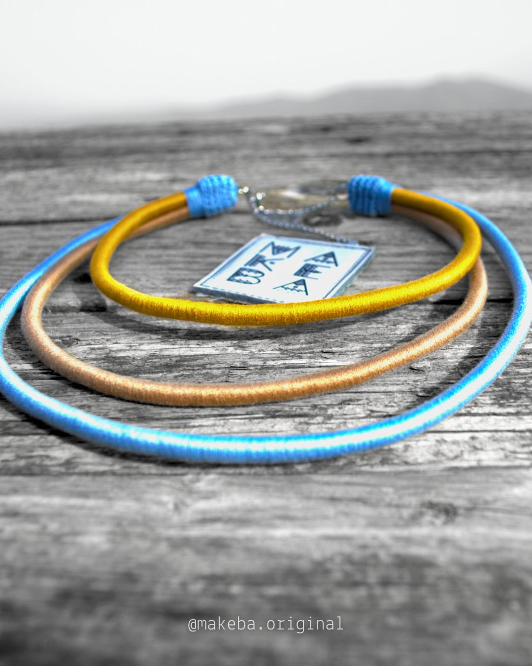 Collana artigianale in cotone 100% con anima in plastica riciclata: modellabile, leggera e irresistibilmente versatile.