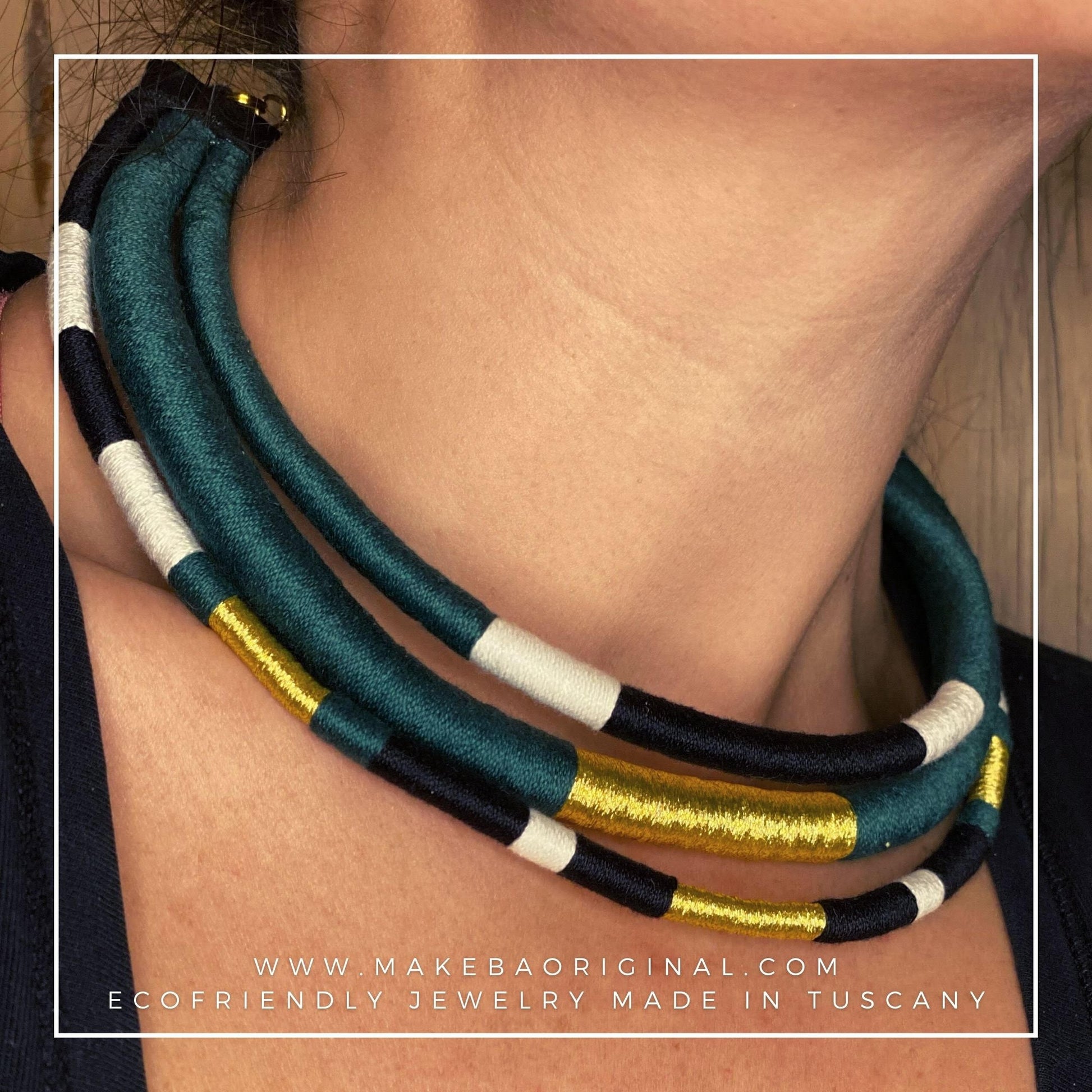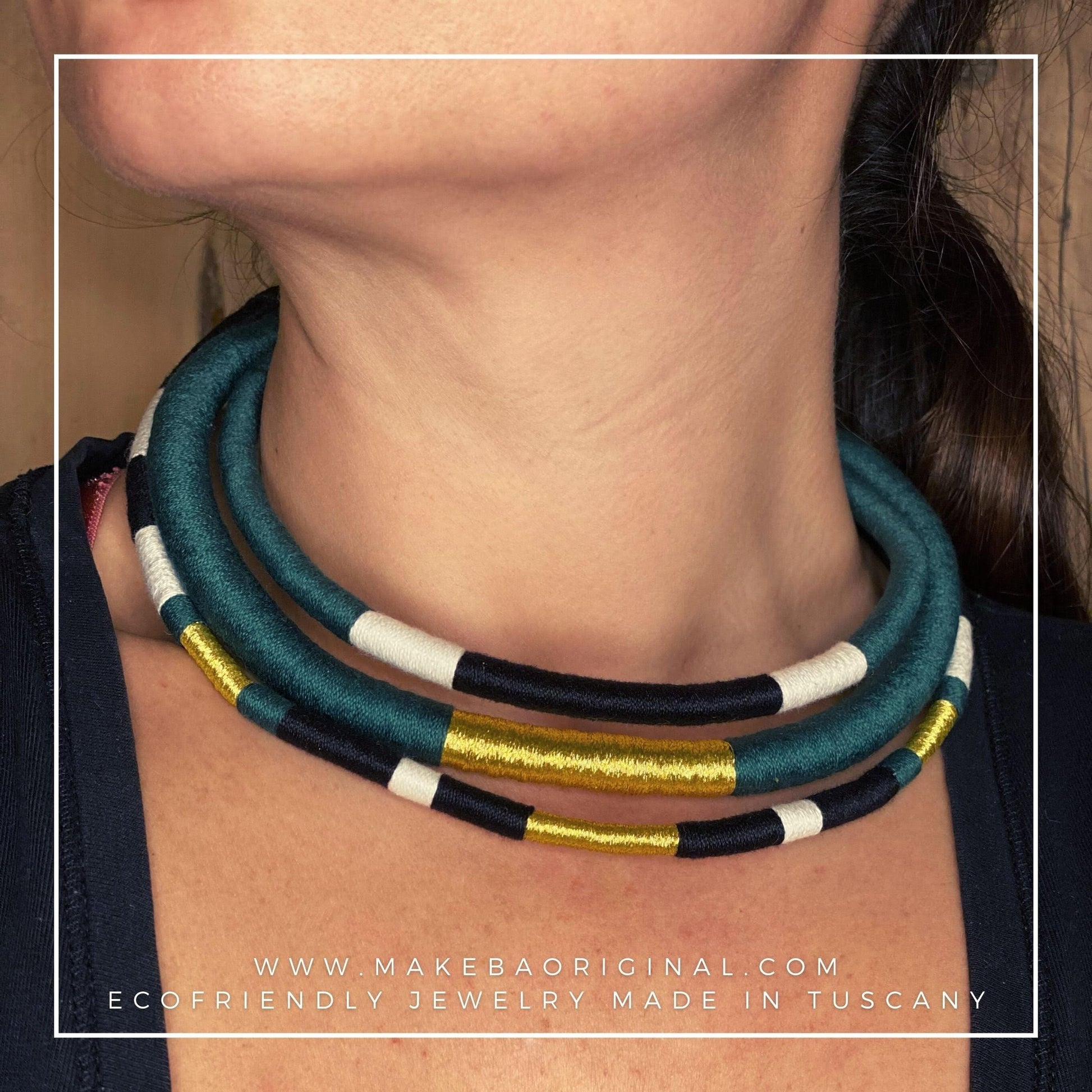 Collana semi-rigida formata da tre cordini di diverso diametro e lunghezza.