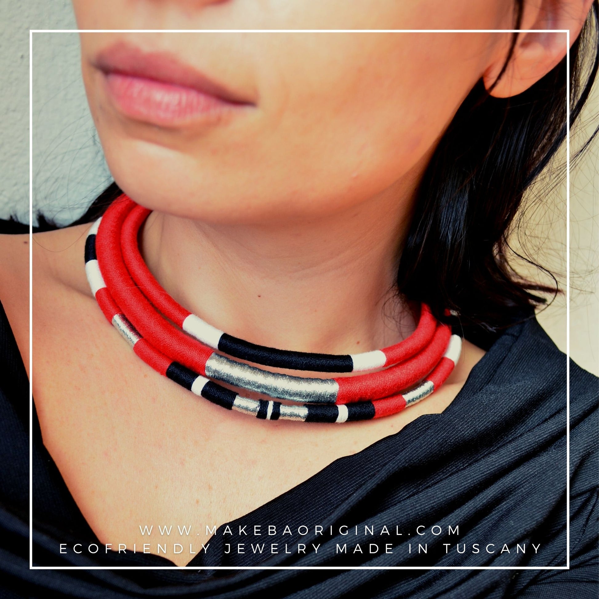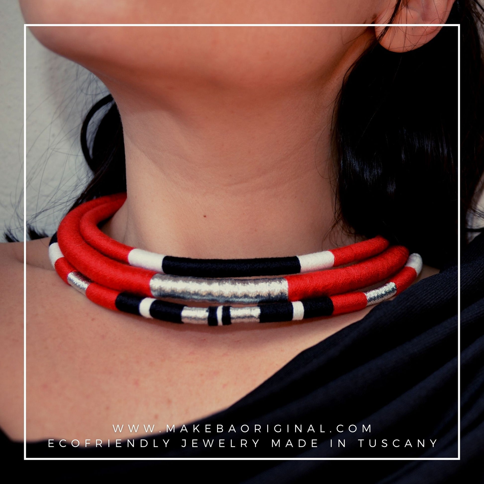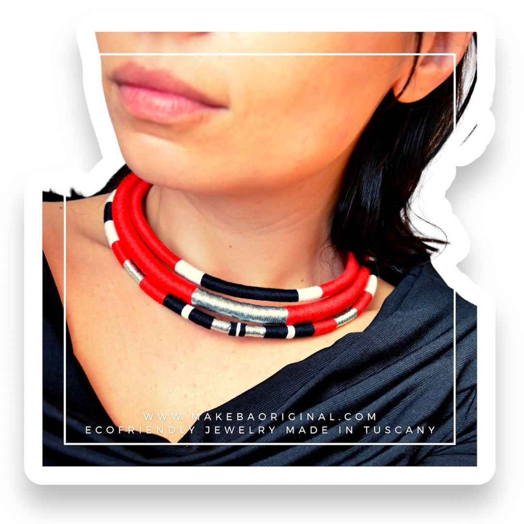 Collana semi-rigida formata da tre cordini di diverso diametro e lunghezza.
