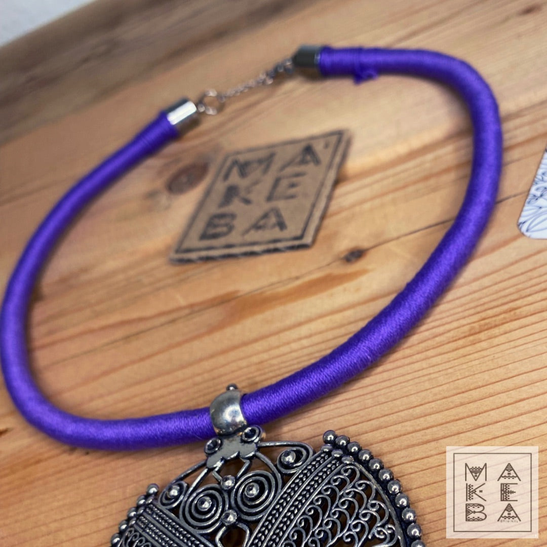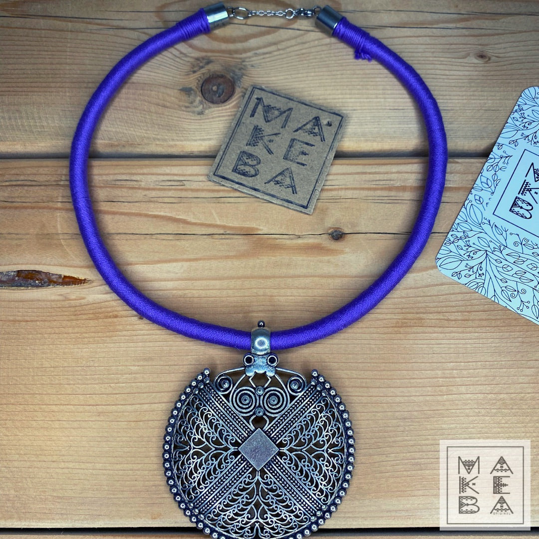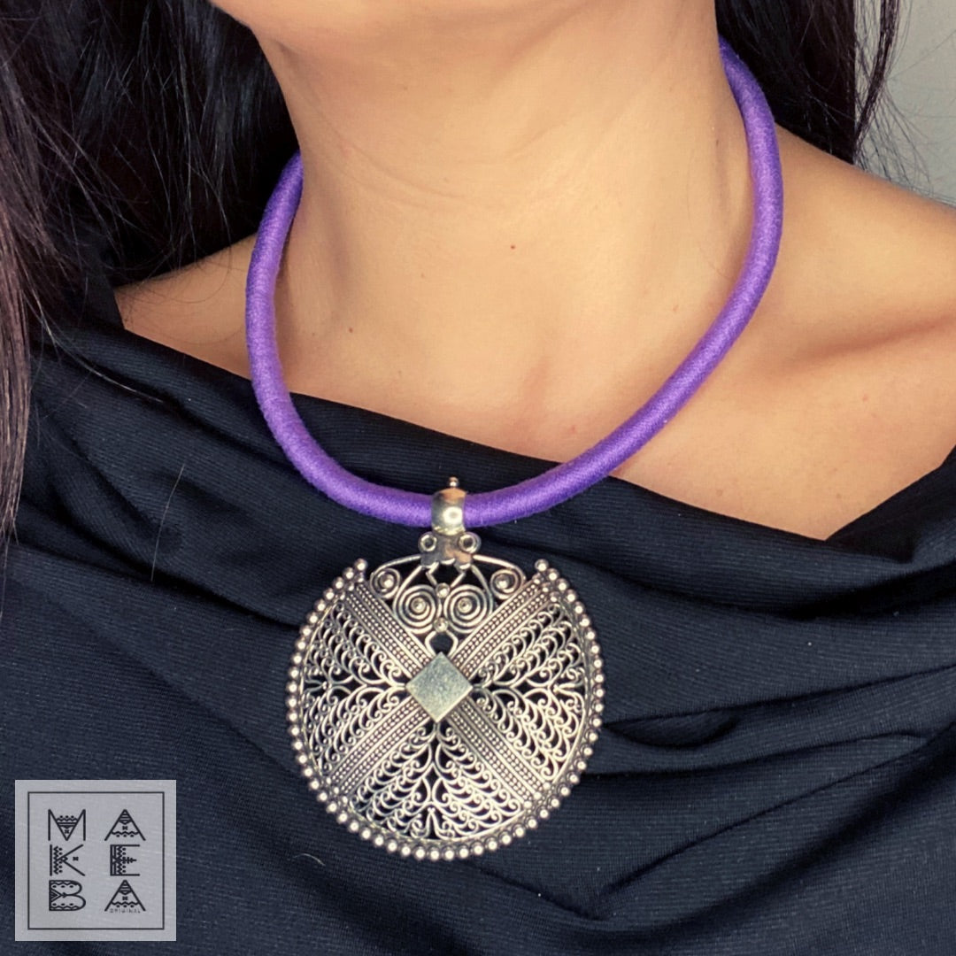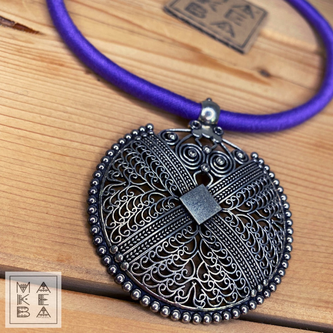 La collana Nina è caratterizzata dal medaglione centrale a cerchio in argento tibetano, con una lavorazione arabesca rifinita nei minimi particolari. Puoi perderti ad osservarne il motivo ipnotico.