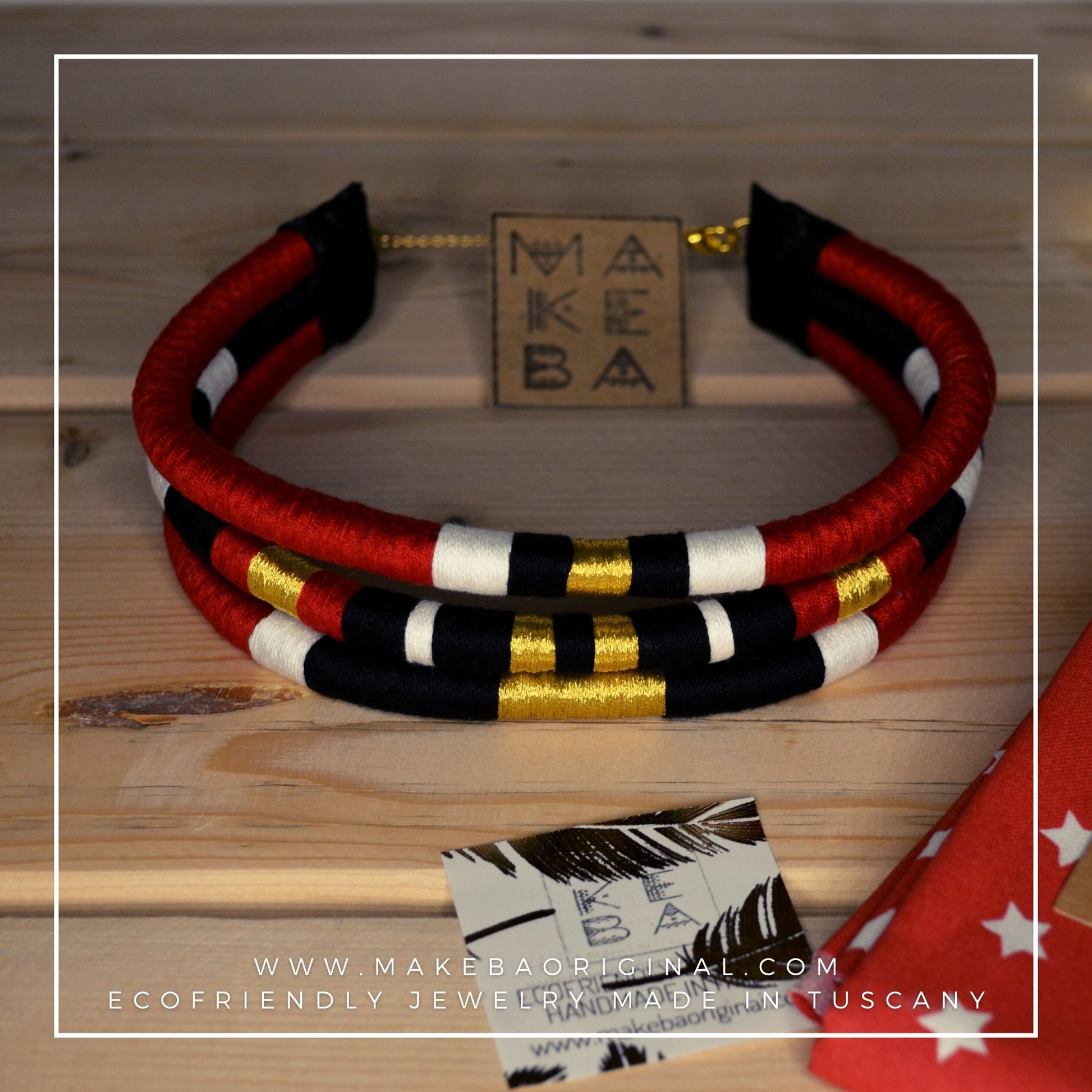 Collarino formato da 3 cordini con lavorazione alternante cotone e lamé color oro.