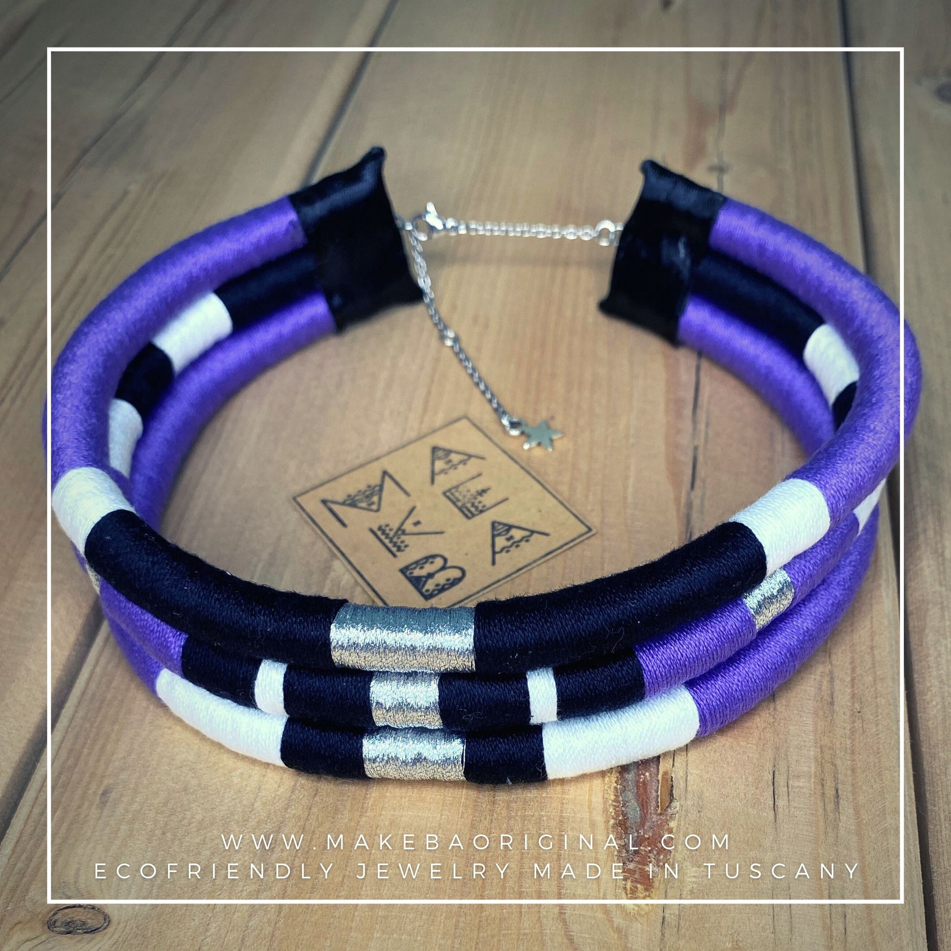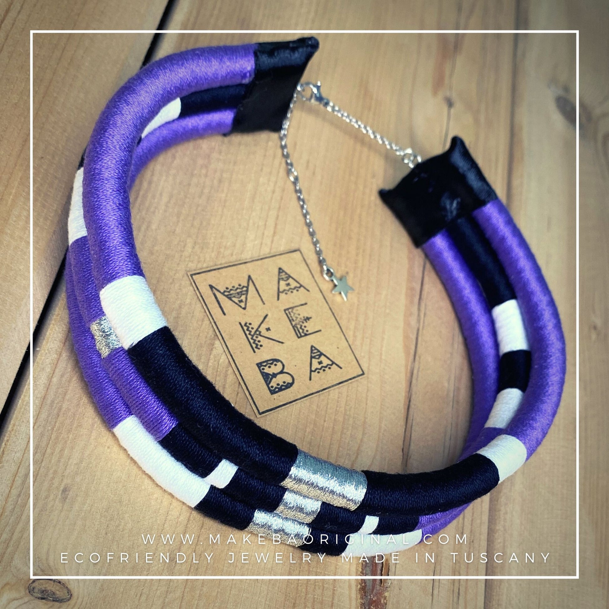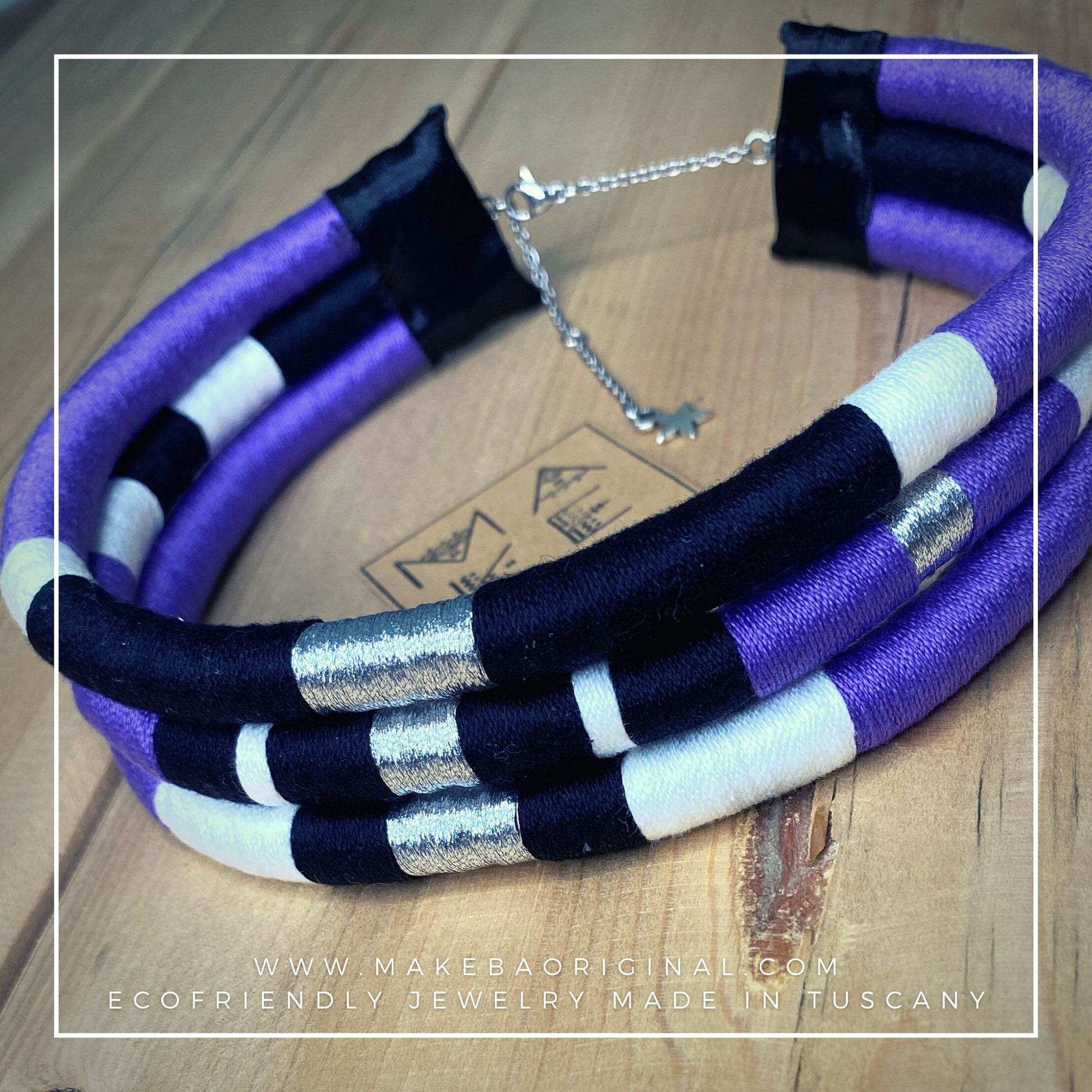 Collarino formato da 3 cordini con lavorazione alternante cotone e lamé color argento.