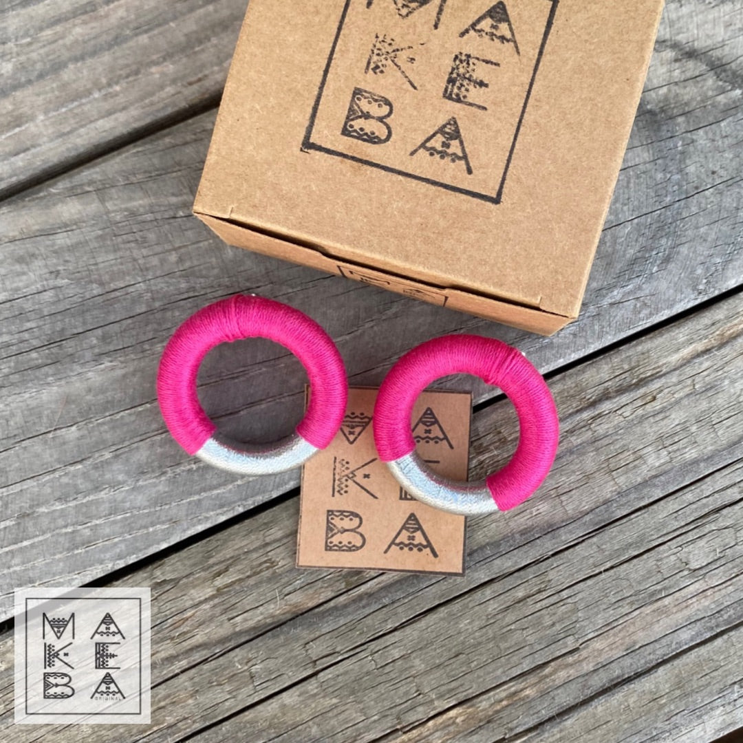 Il cerchietto è in legno, ricoperto di cotone organico con inserto centrale in filo di lamé argentato, che rende l'orecchino leggerissimo e confortevole.