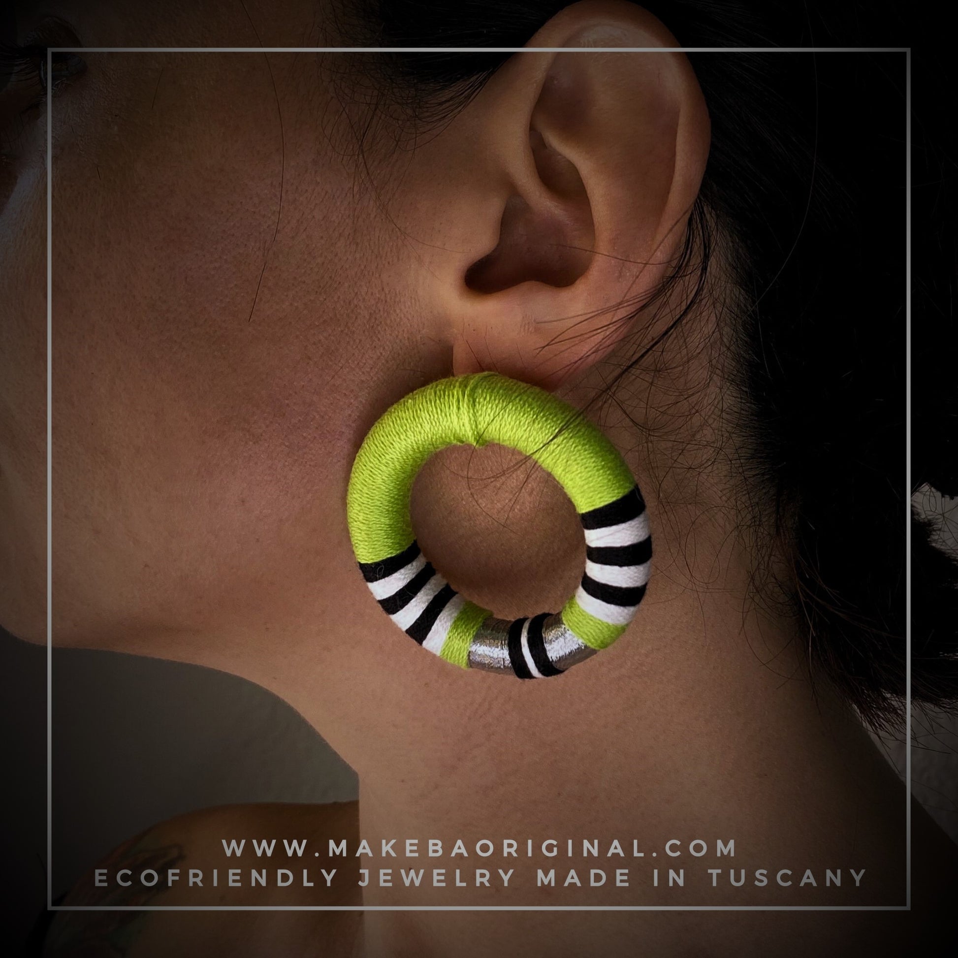Il cerchietto è in legno, ricoperto di cotone organico con inserto centrale in filo di lamé oro, che rende l'orecchino leggerissimo e confortevole.