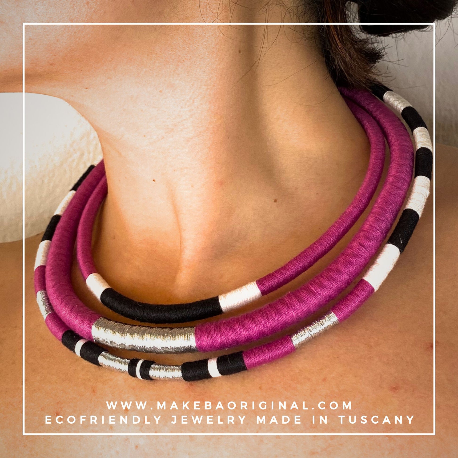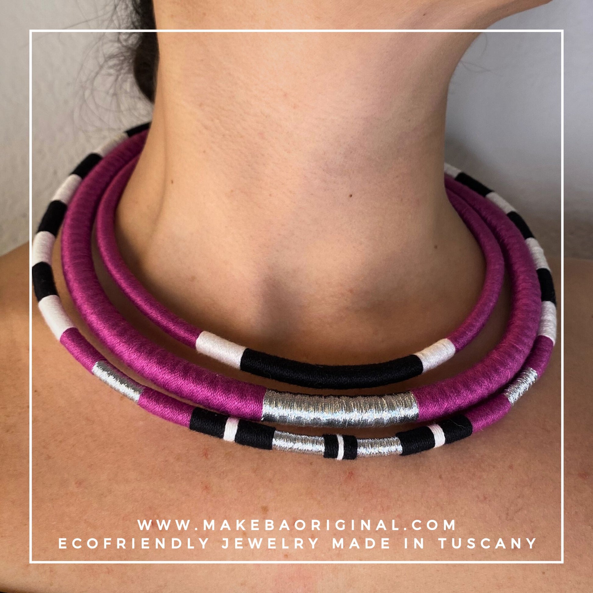 Collana semi-rigida formata da tre cordini di diverso diametro e lunghezza.