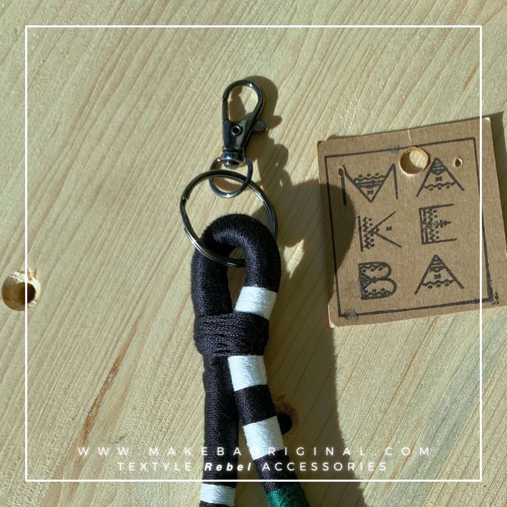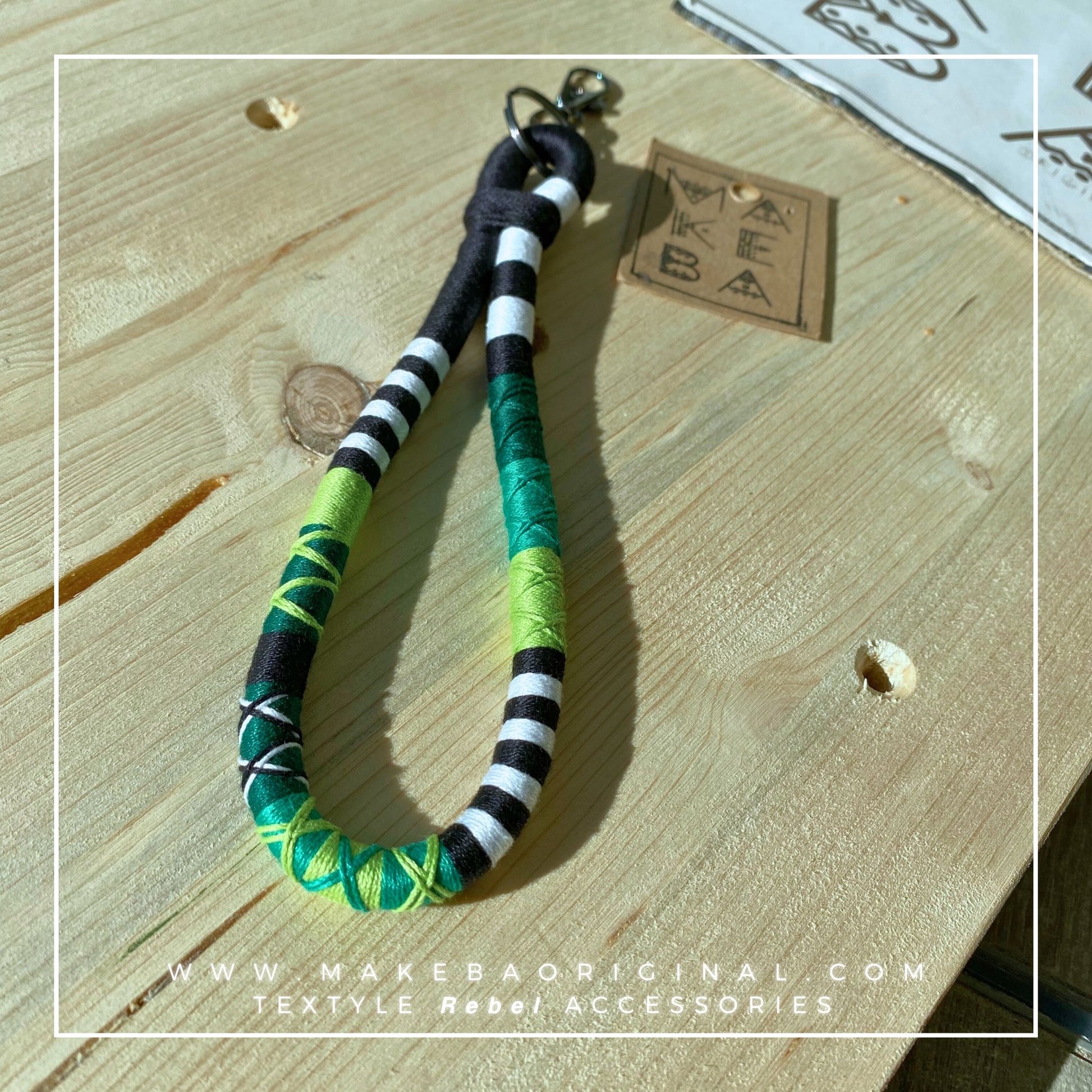 Laccetto multi funzione lavorato a mano, con moschettone finale in metallo.