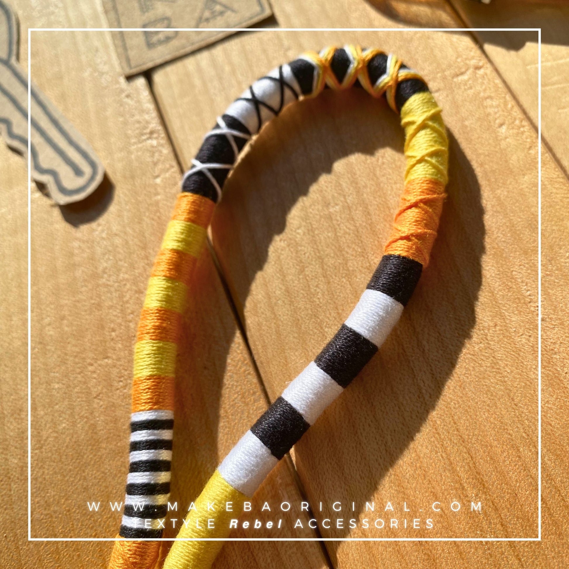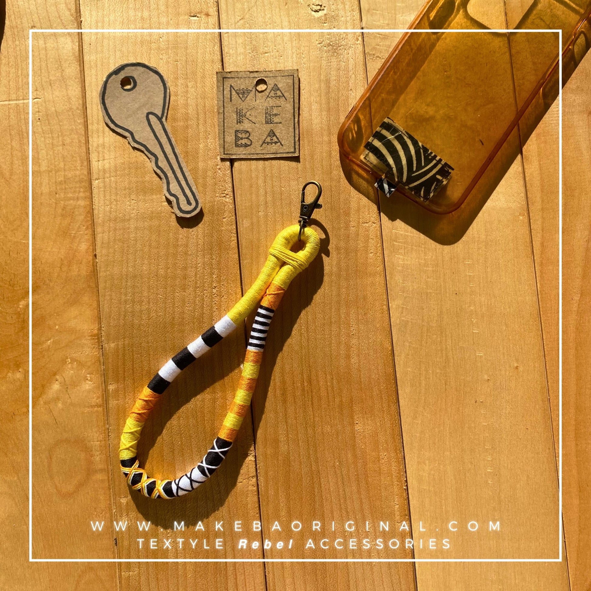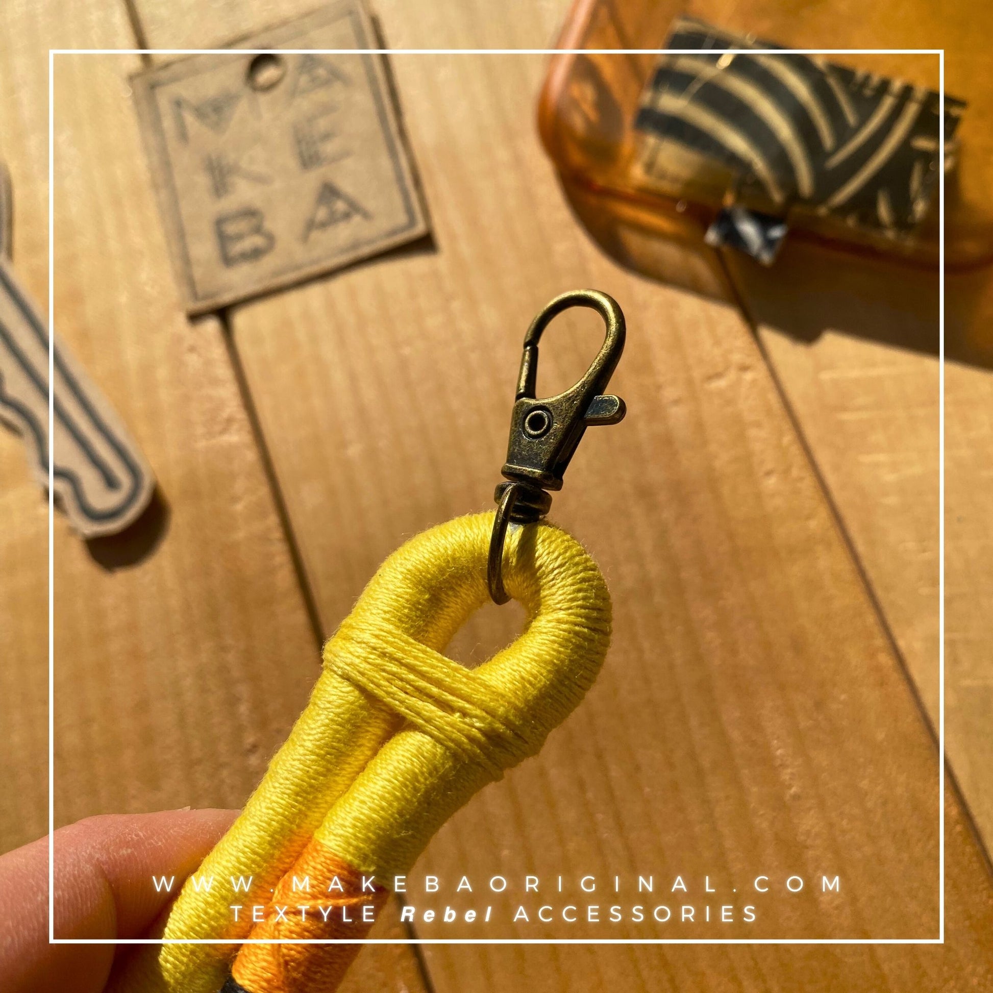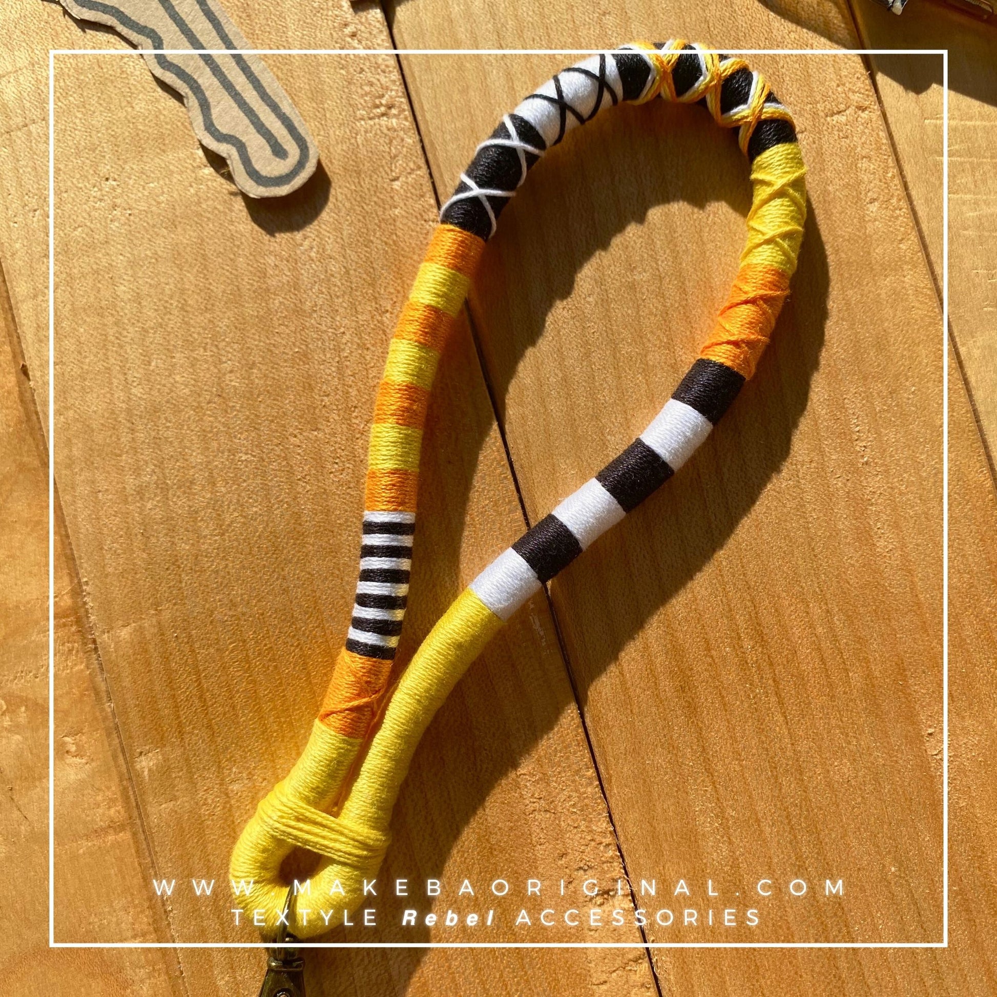 Laccetto multi funzione lavorato a mano, con moschettone finale in metallo.