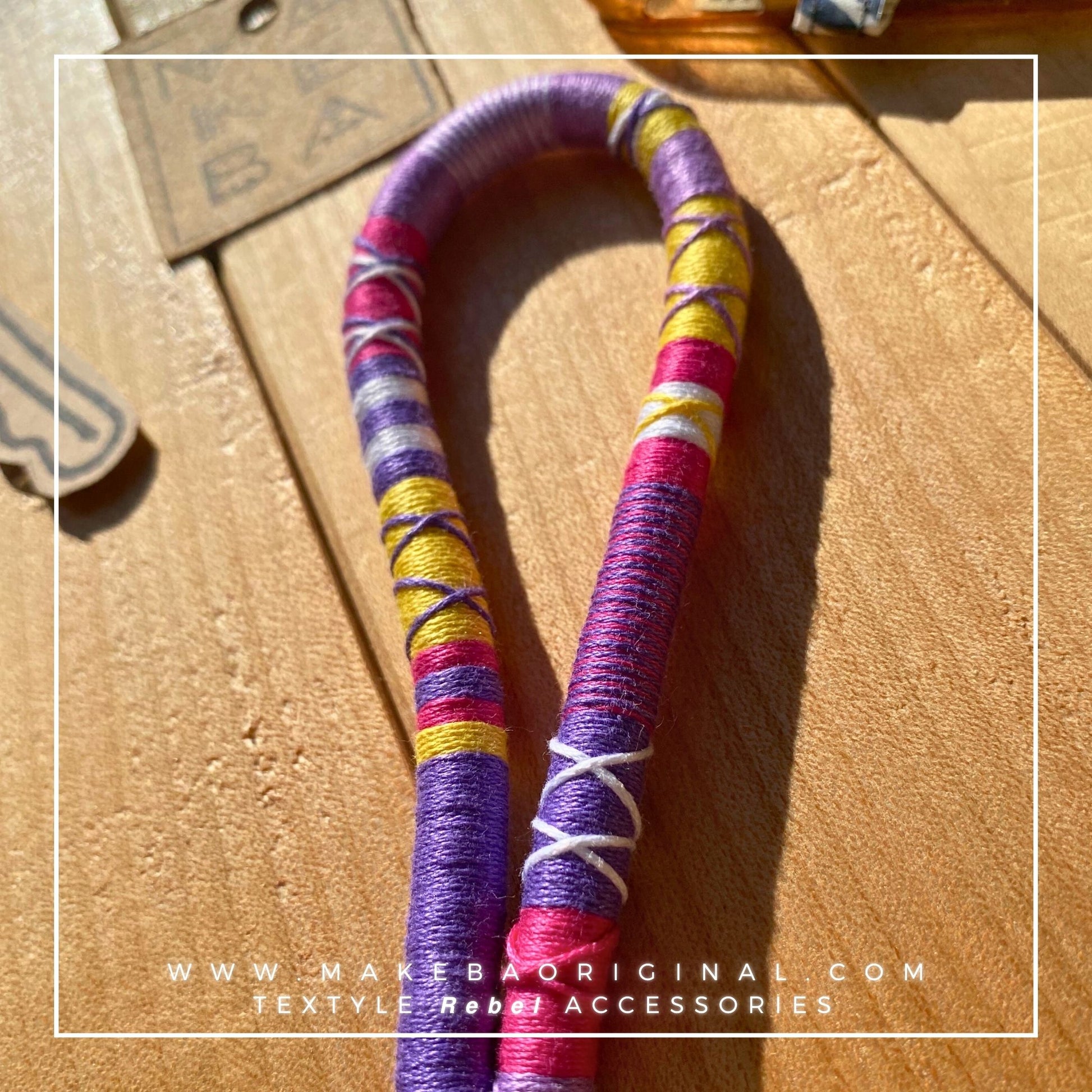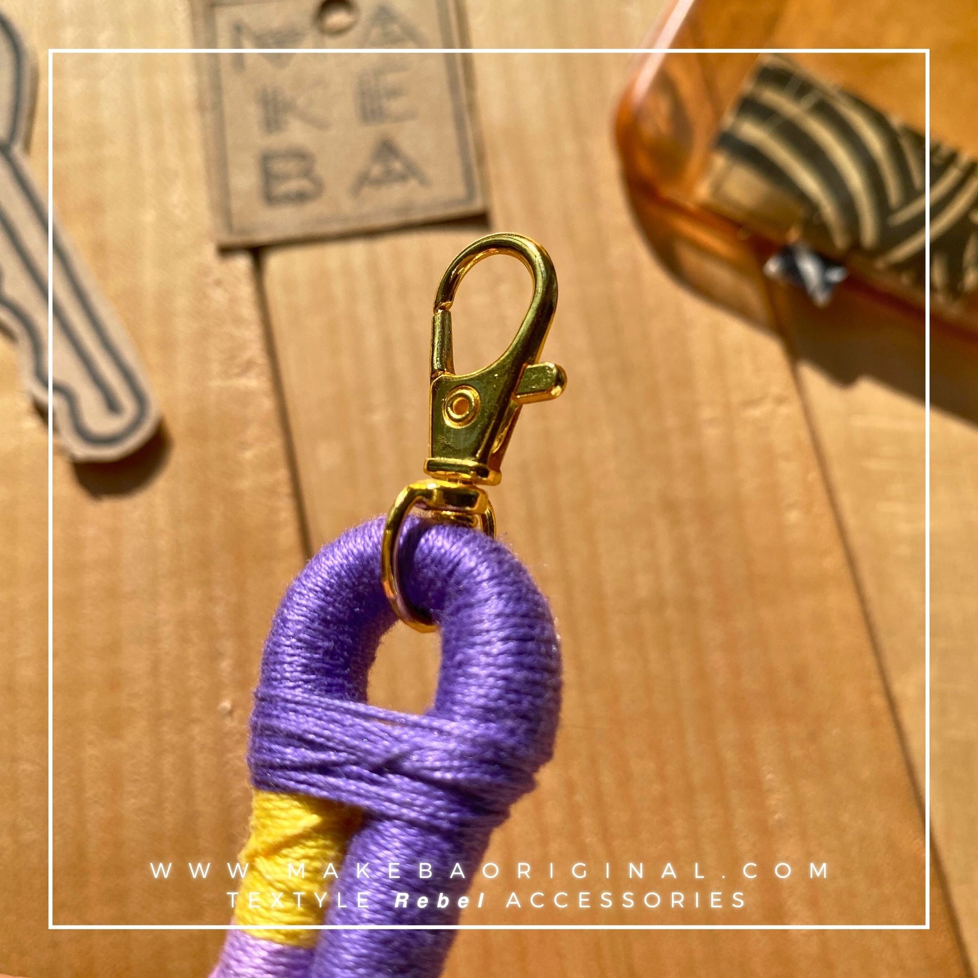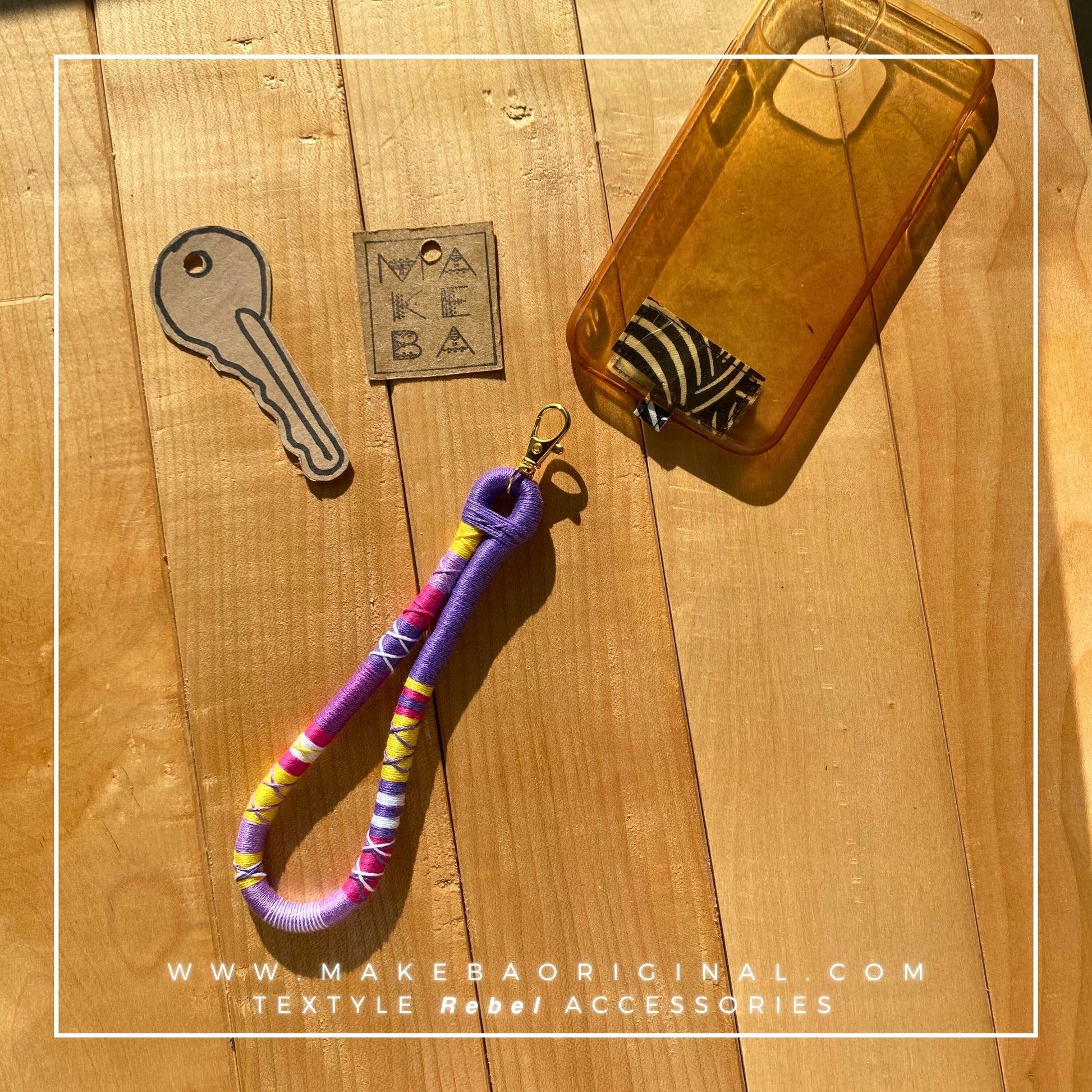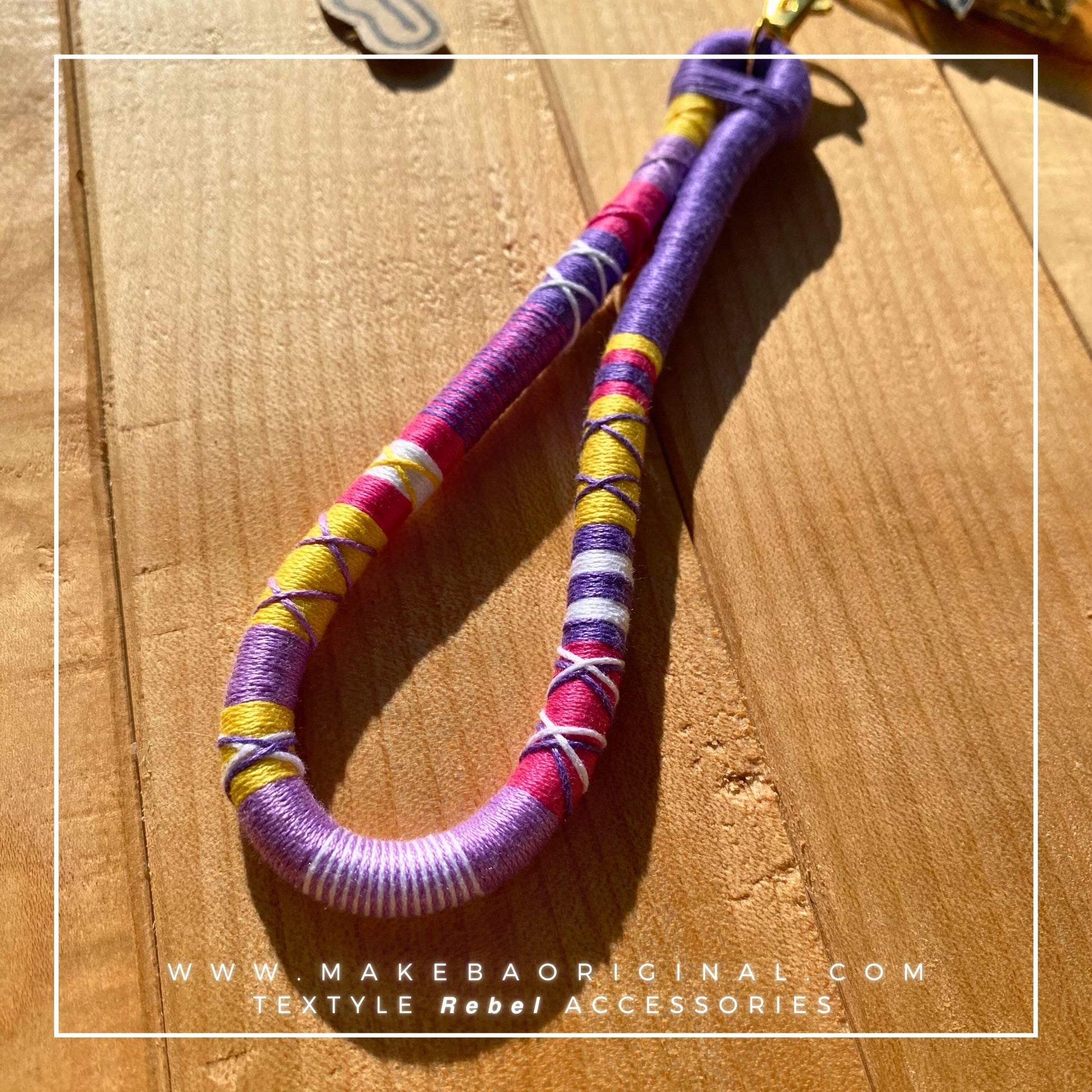 Laccetto multi funzione lavorato a mano, con moschettone finale in metallo.
