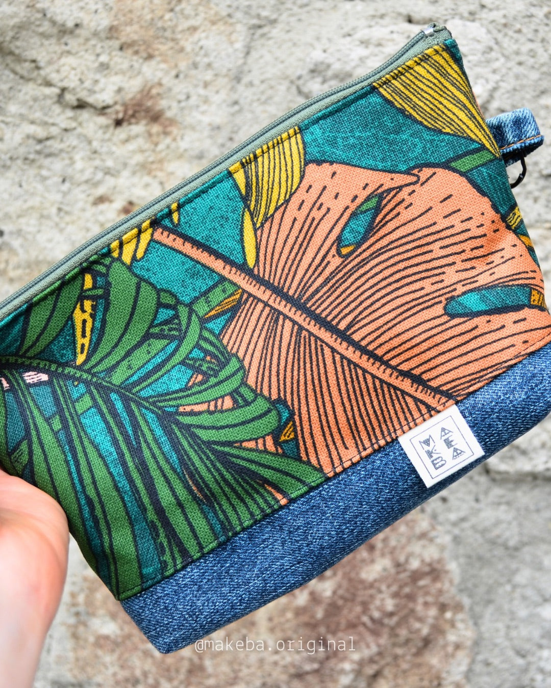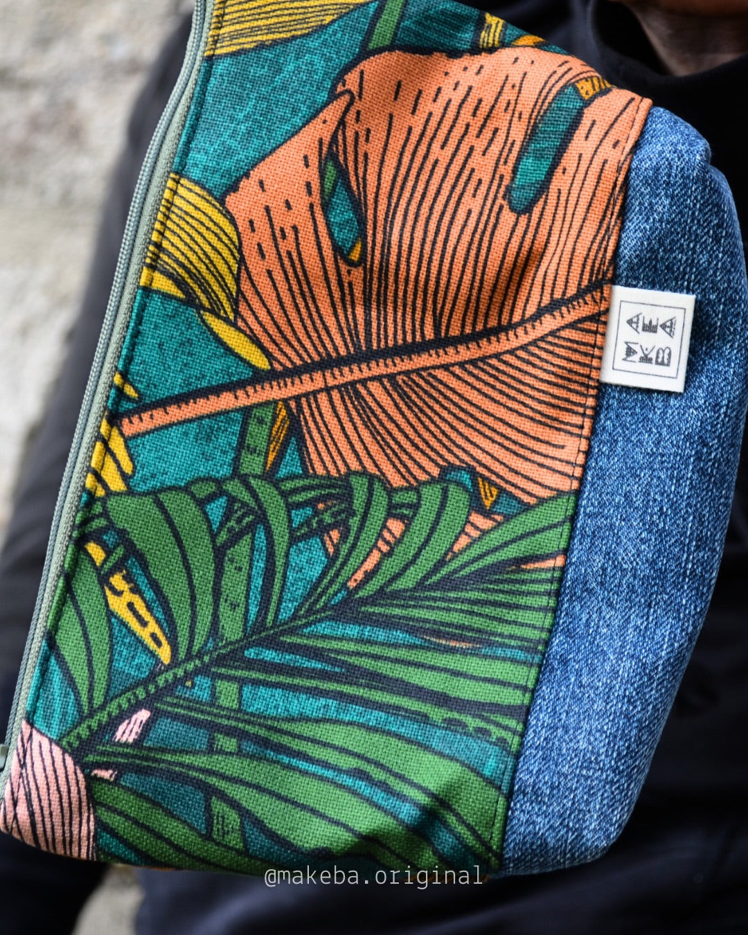 È realizzata con tessuti di recupero e si chiude con una zip. Ha un cerchietto laterale per appendere le chiavi.