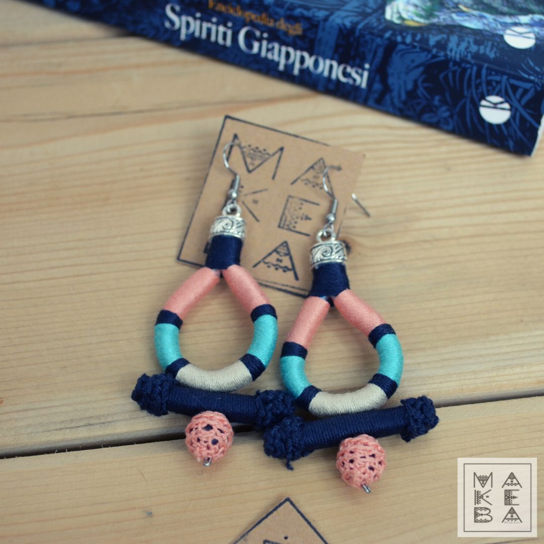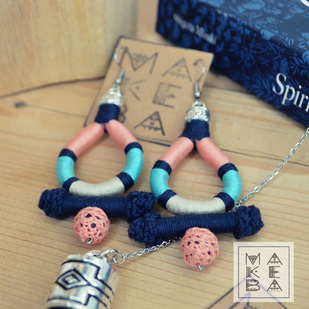Orecchini leggeri a pendente goccia, in cotone ed impreziositi dal finale in argento lavorato con motivo geometrico.