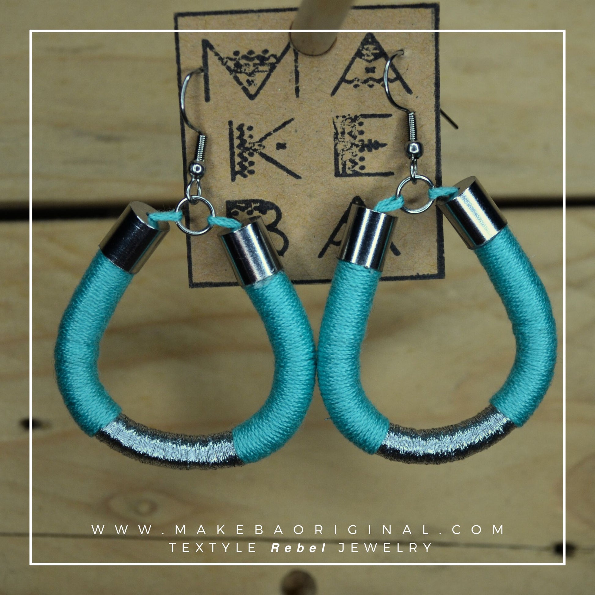 Orecchini leggeri a pendente, in cotone 100% e metallo acciaio anallergico, impreziositi da un centrale in filo argentato.