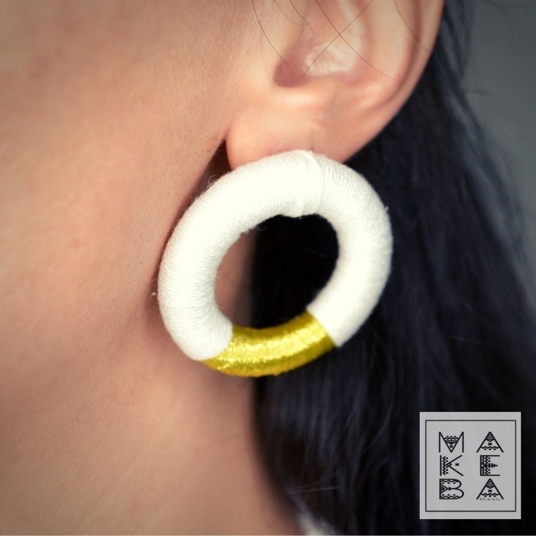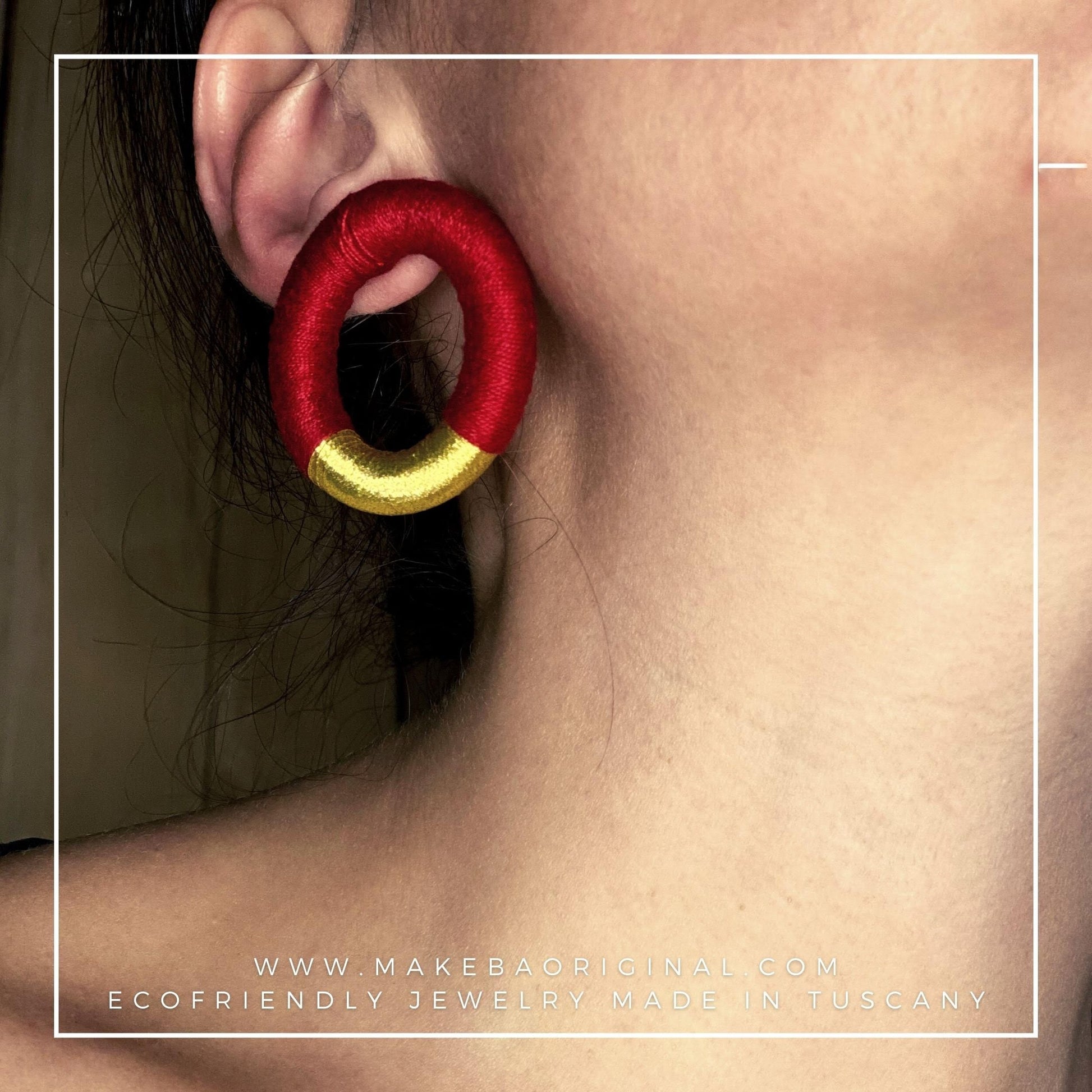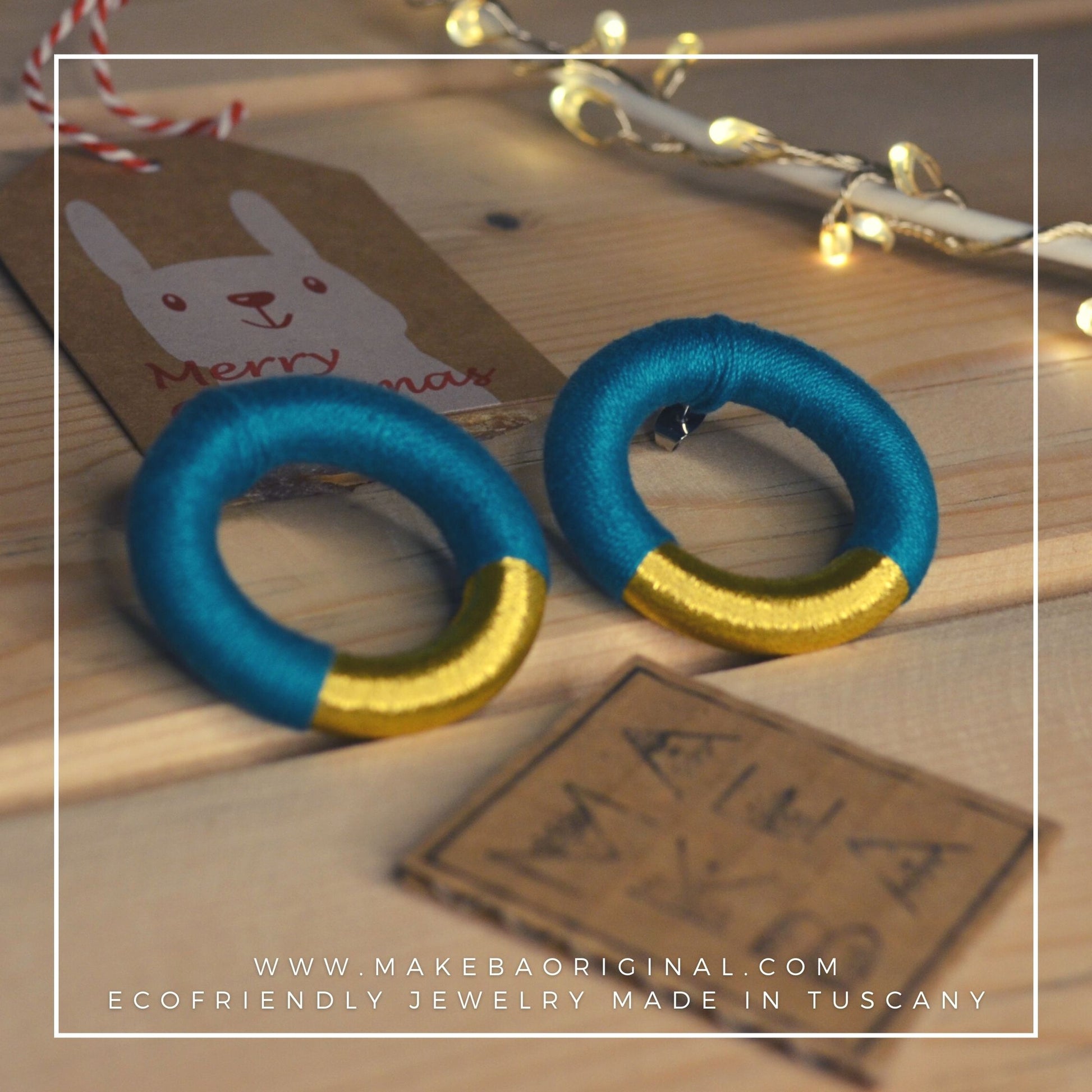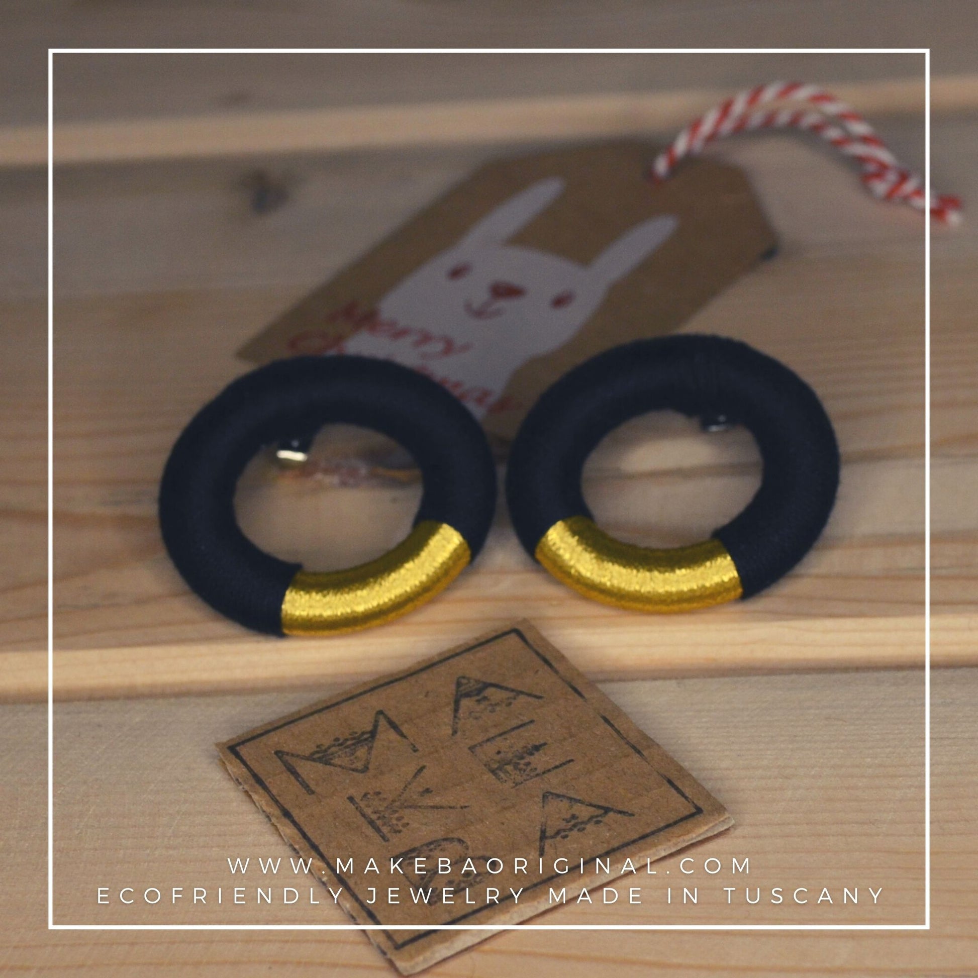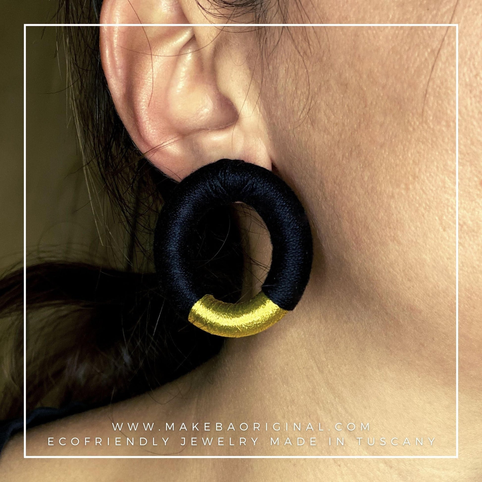 Il cerchietto è in legno, ricoperto di cotone organico con inserto centrale in filo di lamé oro, che rende l'orecchino leggerissimo e confortevole.