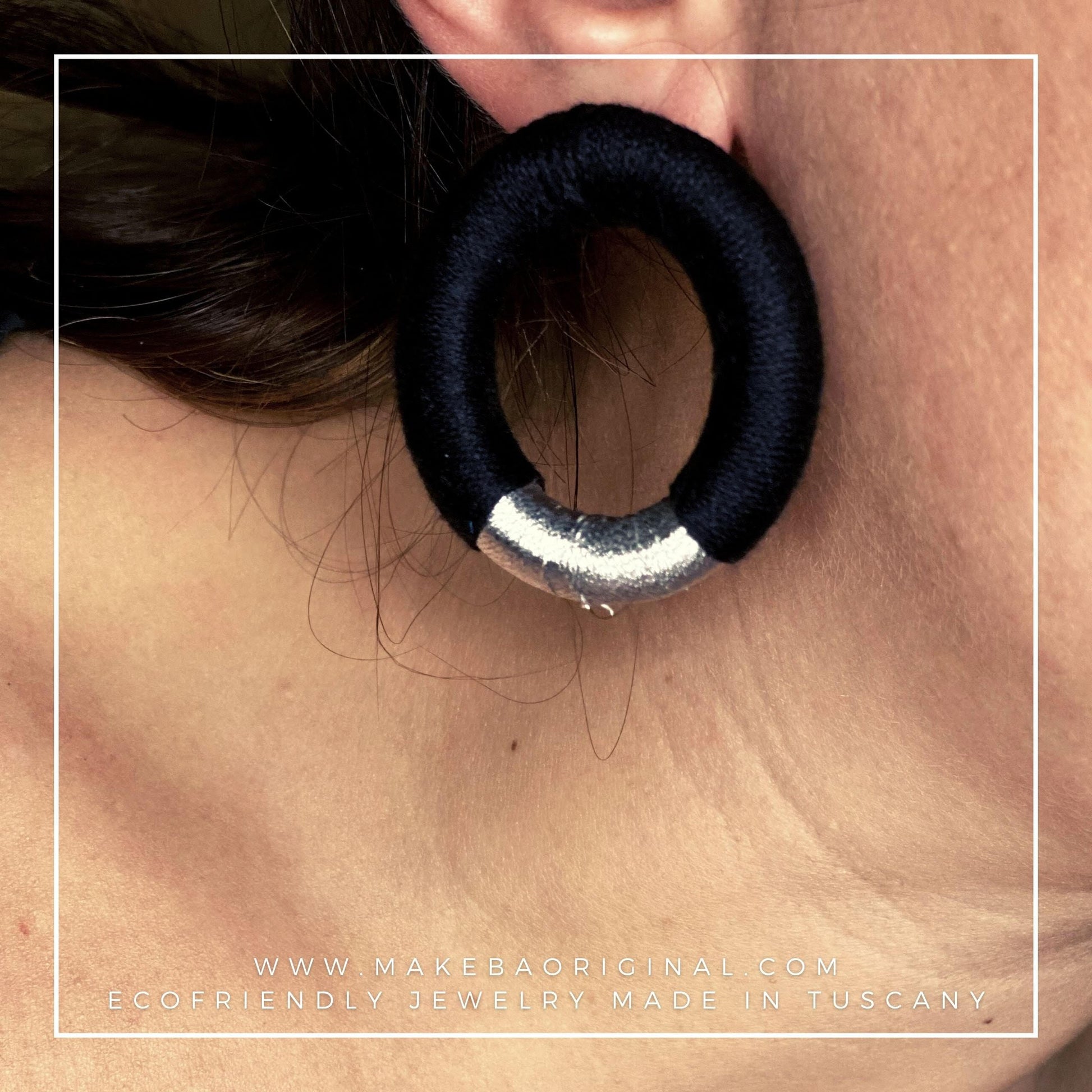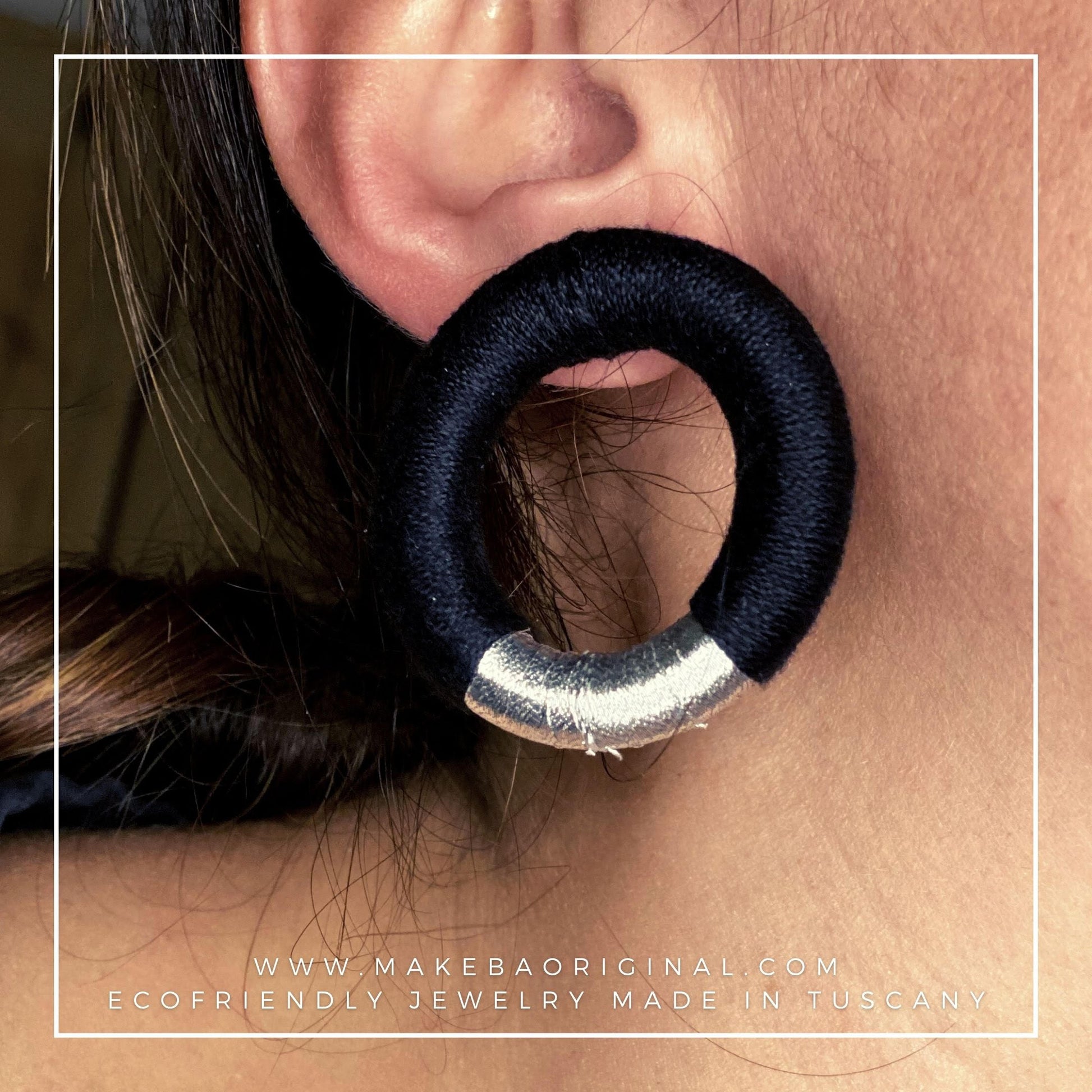 Il cerchietto è in legno, ricoperto di cotone organico con inserto centrale in filo di lamé argentato, che rende l'orecchino leggerissimo e confortevole.