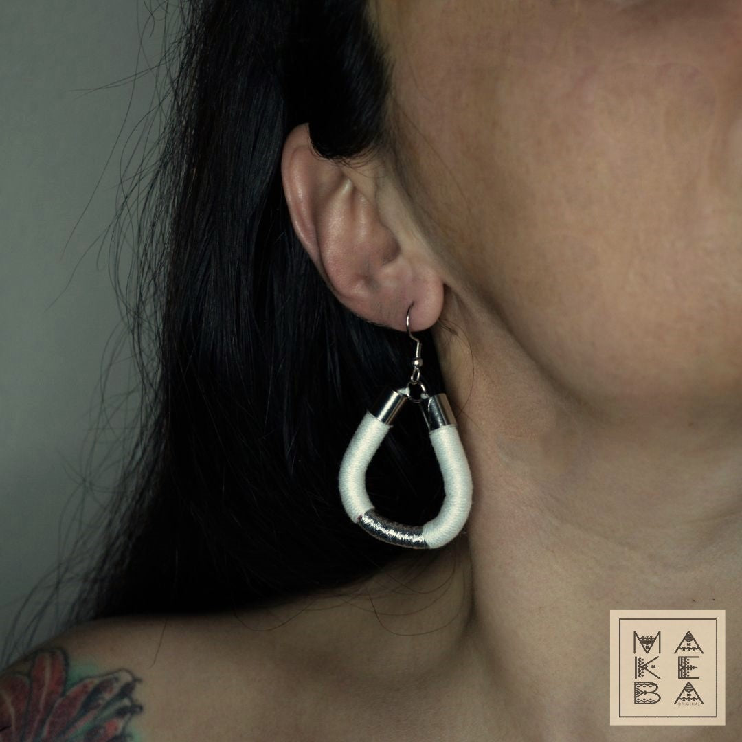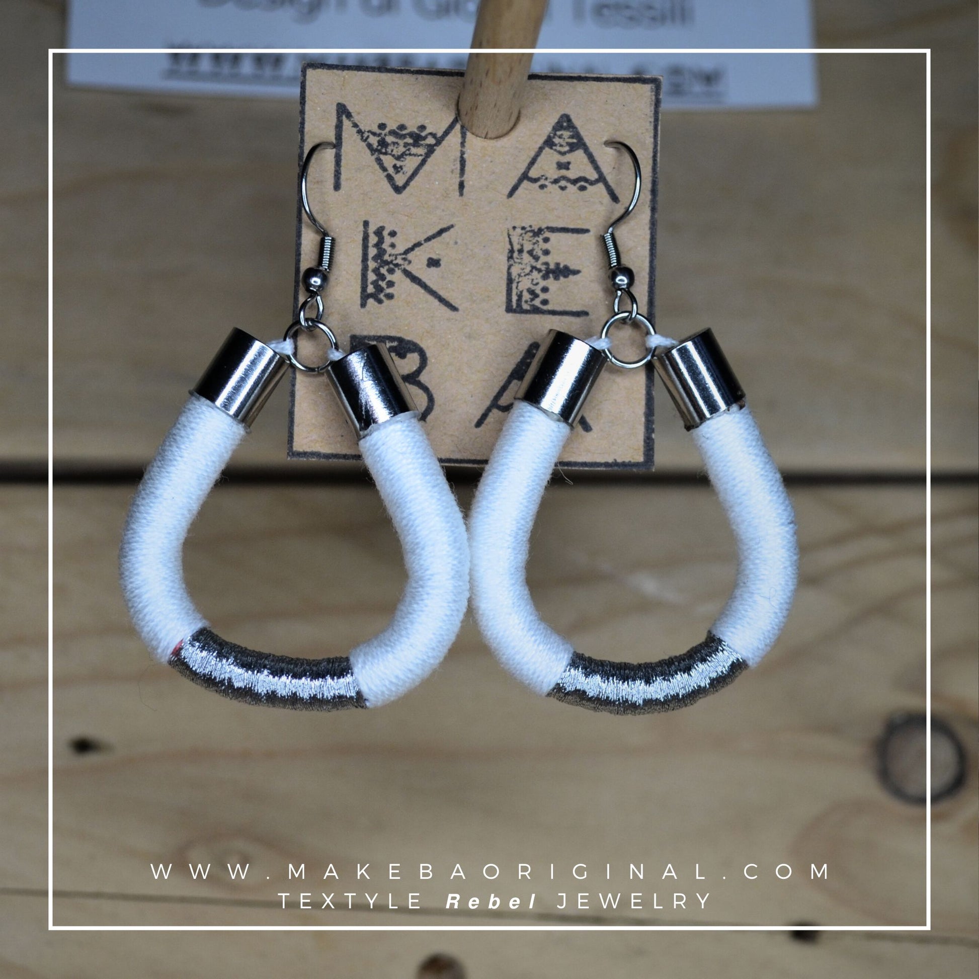 Orecchini leggeri a pendente, in cotone 100% e metallo acciaio anallergico, impreziositi da un centrale in filo argentato.