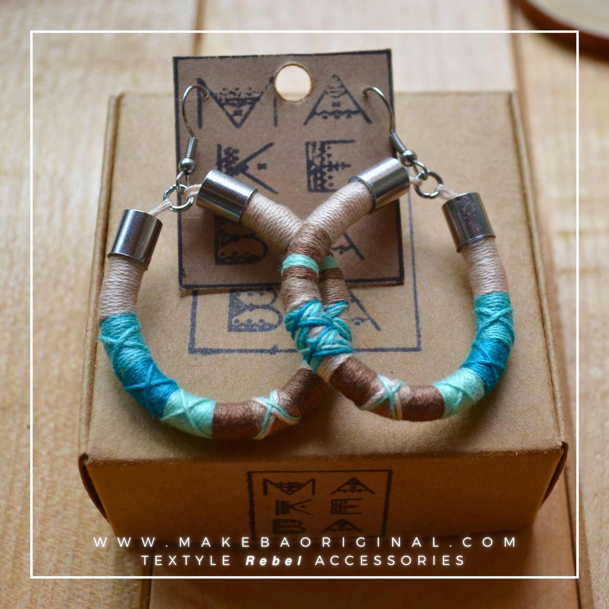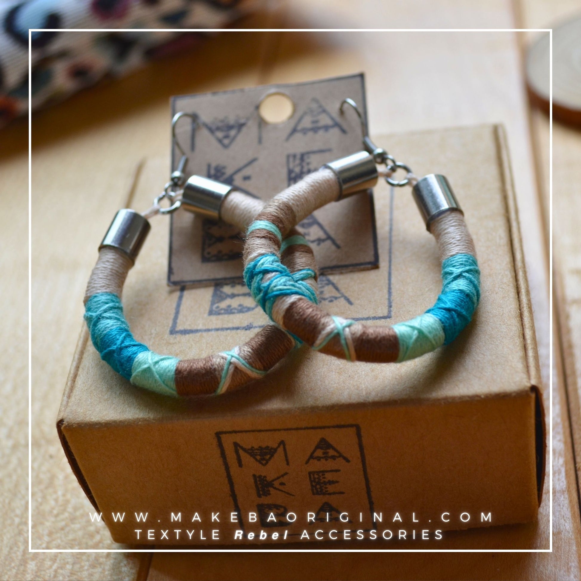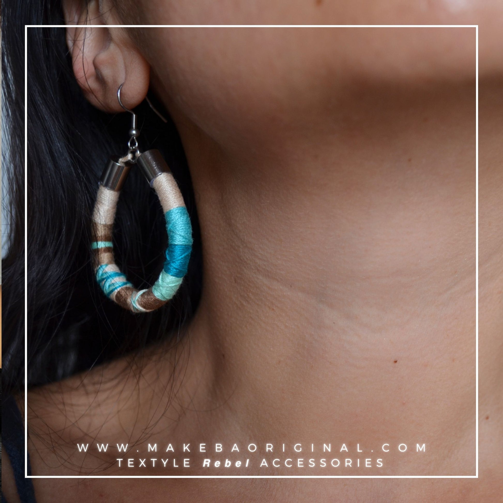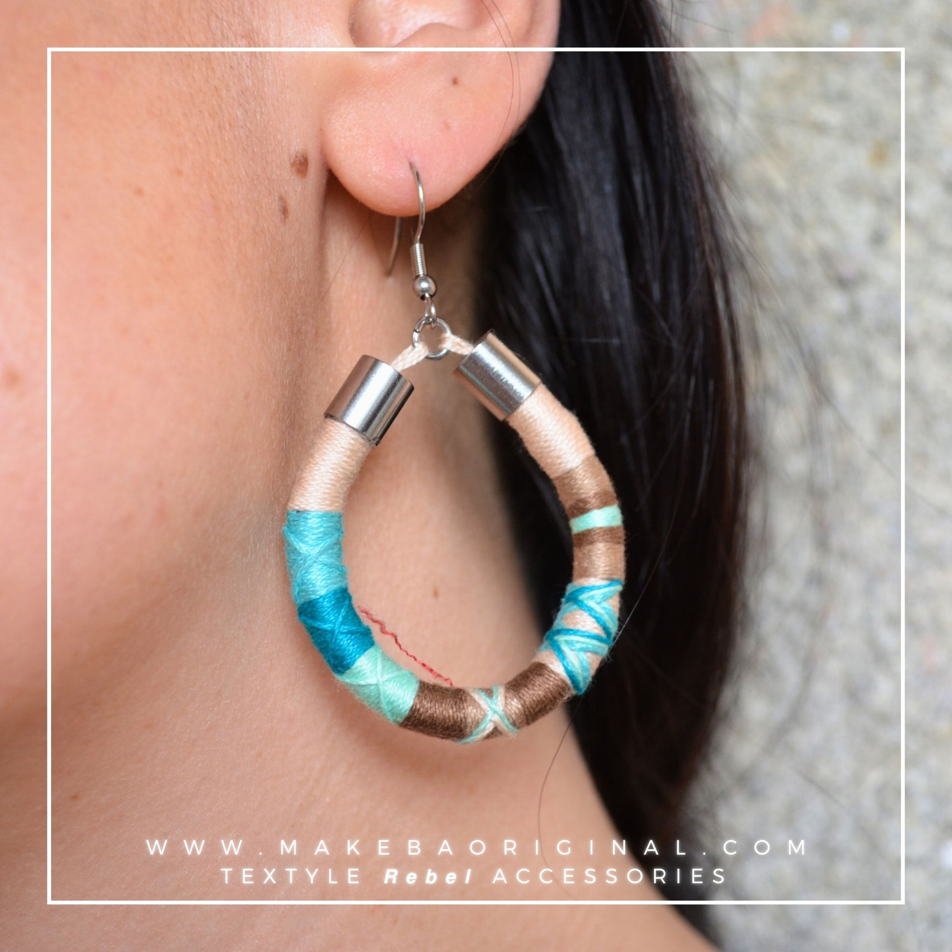Orecchini leggeri a pendente, in cotone 100% e acciaio anallergico.