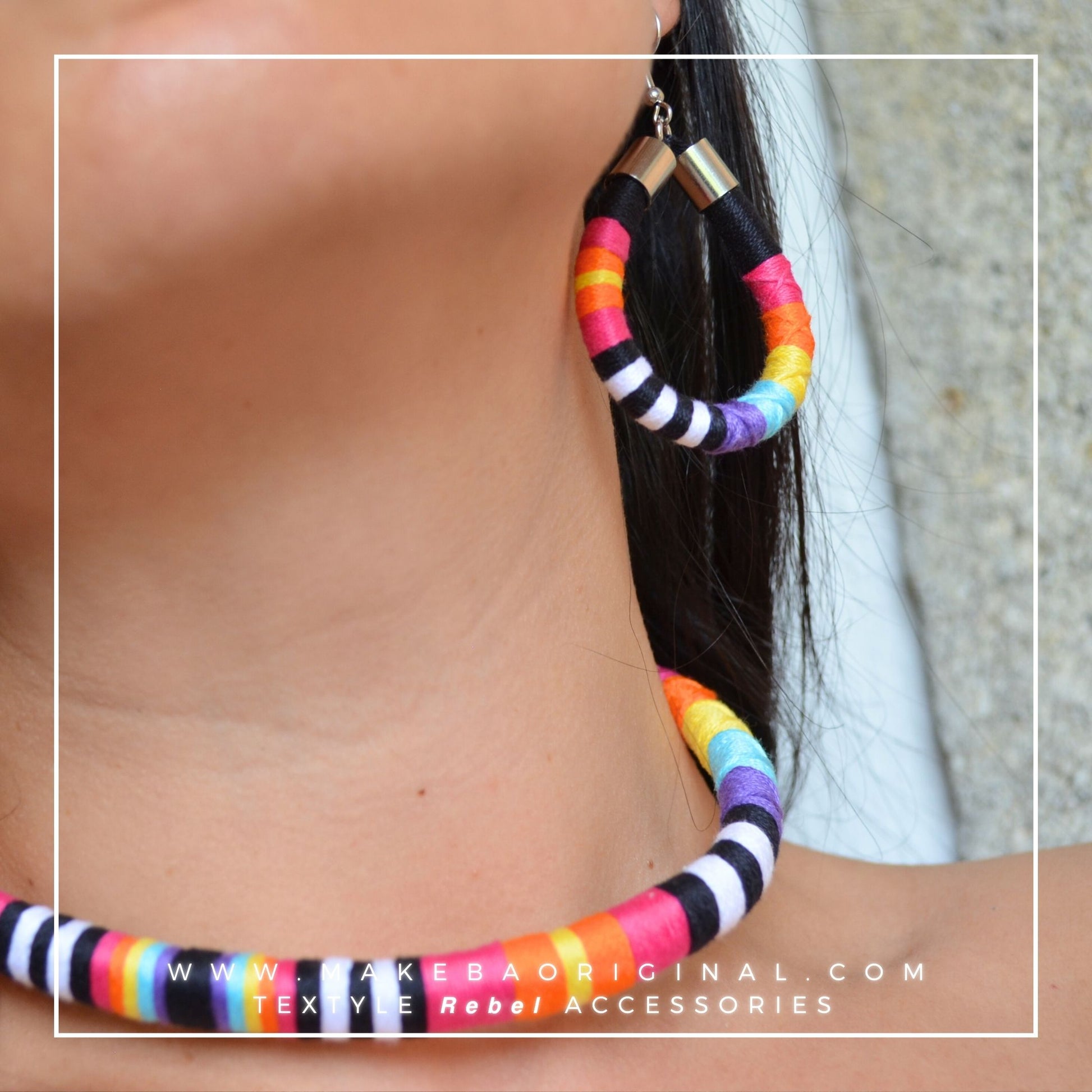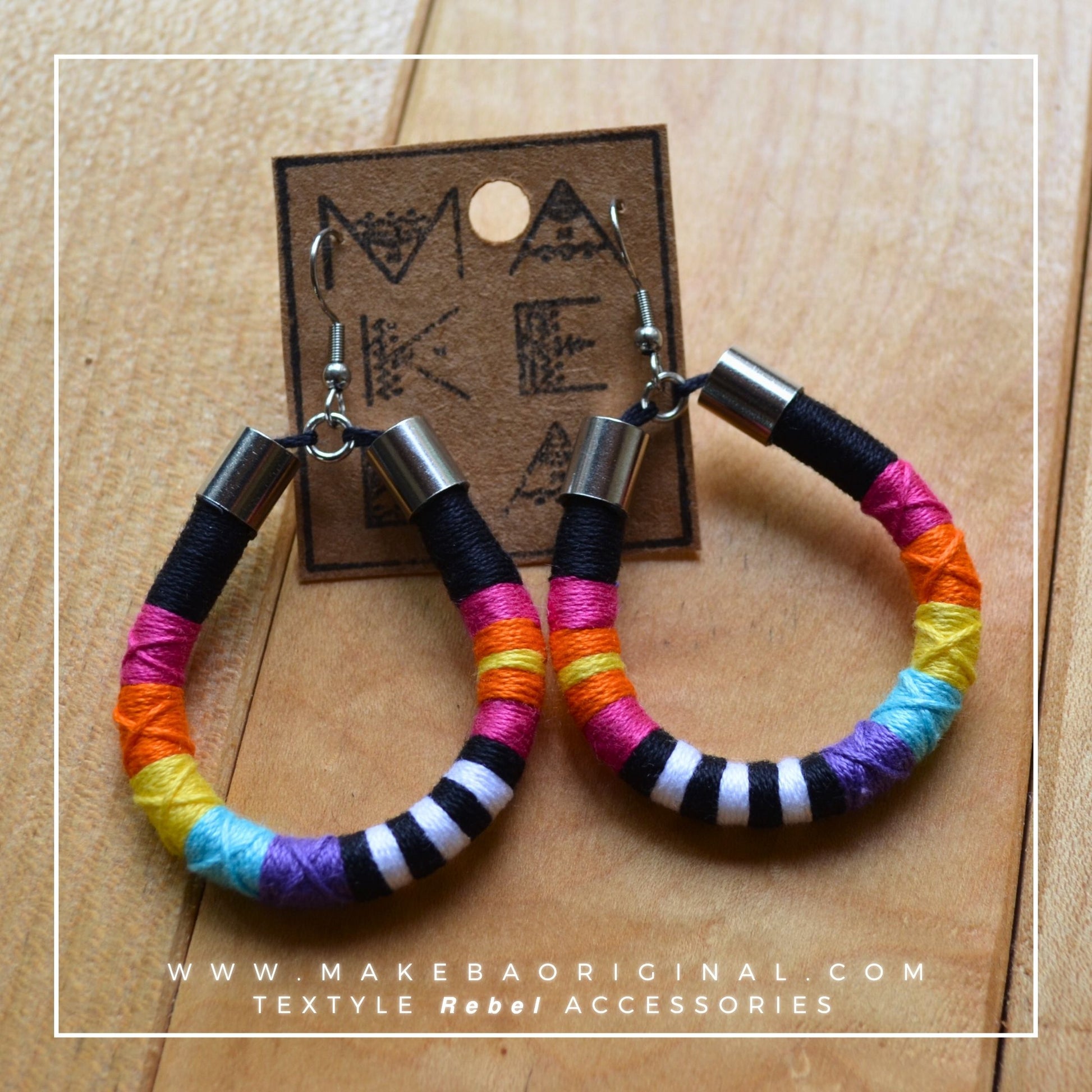 Orecchini leggeri a pendente, in cotone 100% e acciaio anallergico.