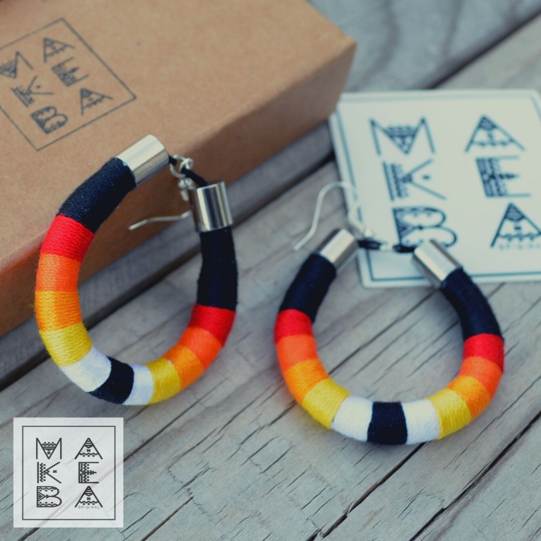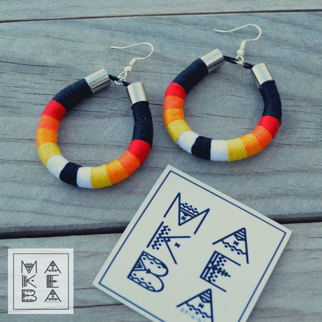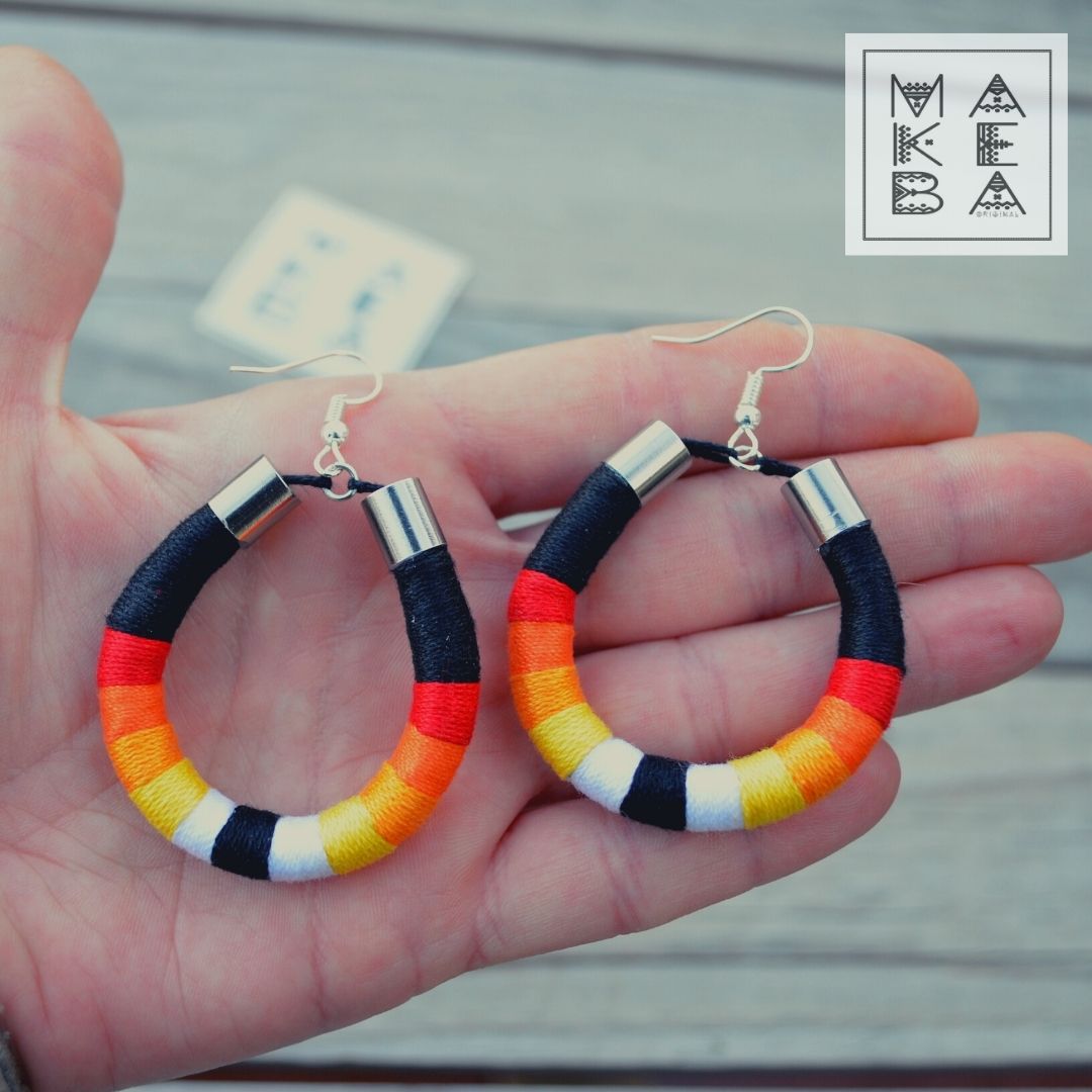 Orecchini leggeri a pendente, in cotone 100% e metallo acciaio anallergico, impreziositi da una lavorazione a gradiente di colore.