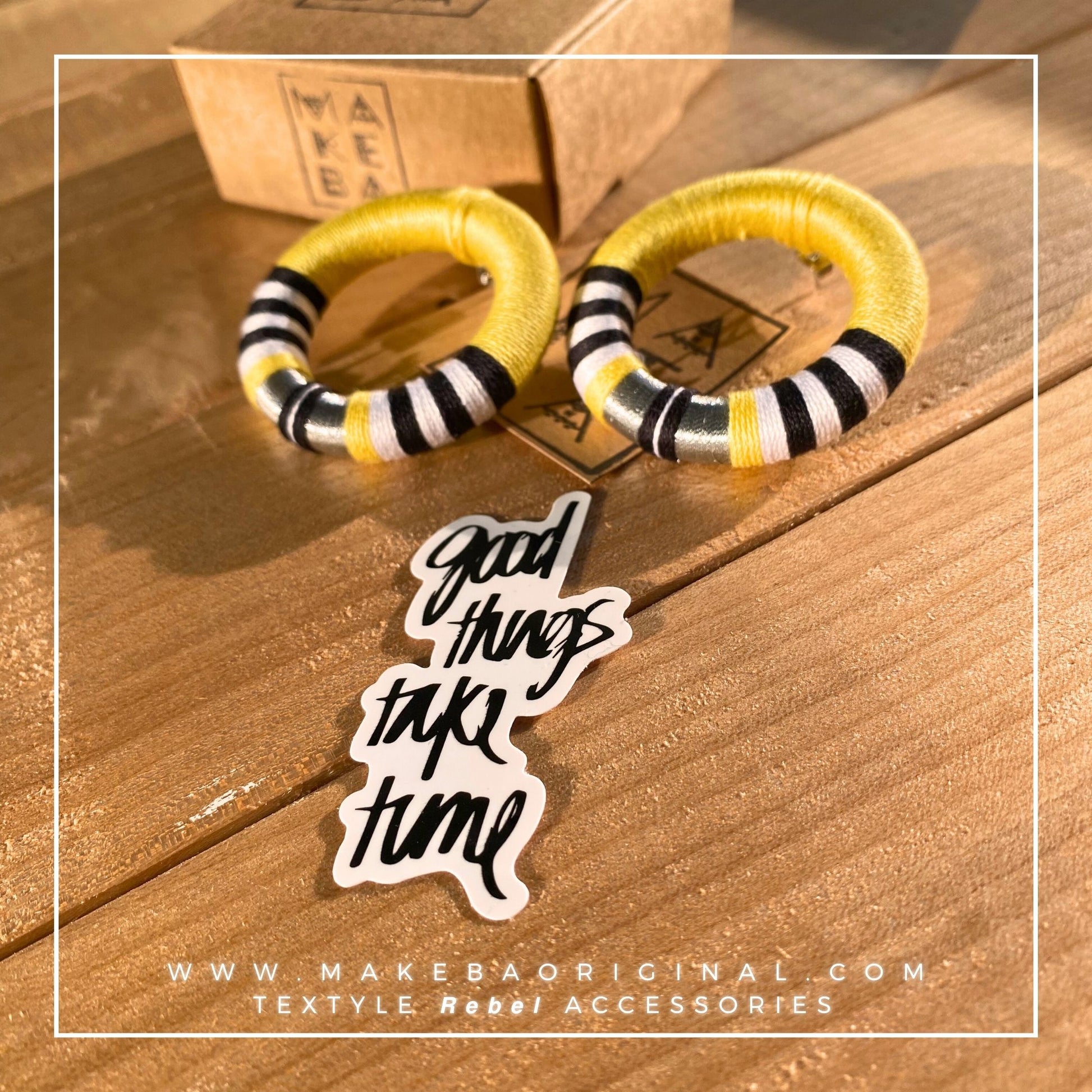 Il cerchietto è in legno, ricoperto di cotone organico con inserto centrale in filo di lamé, che rende l'orecchino leggerissimo e confortevole.