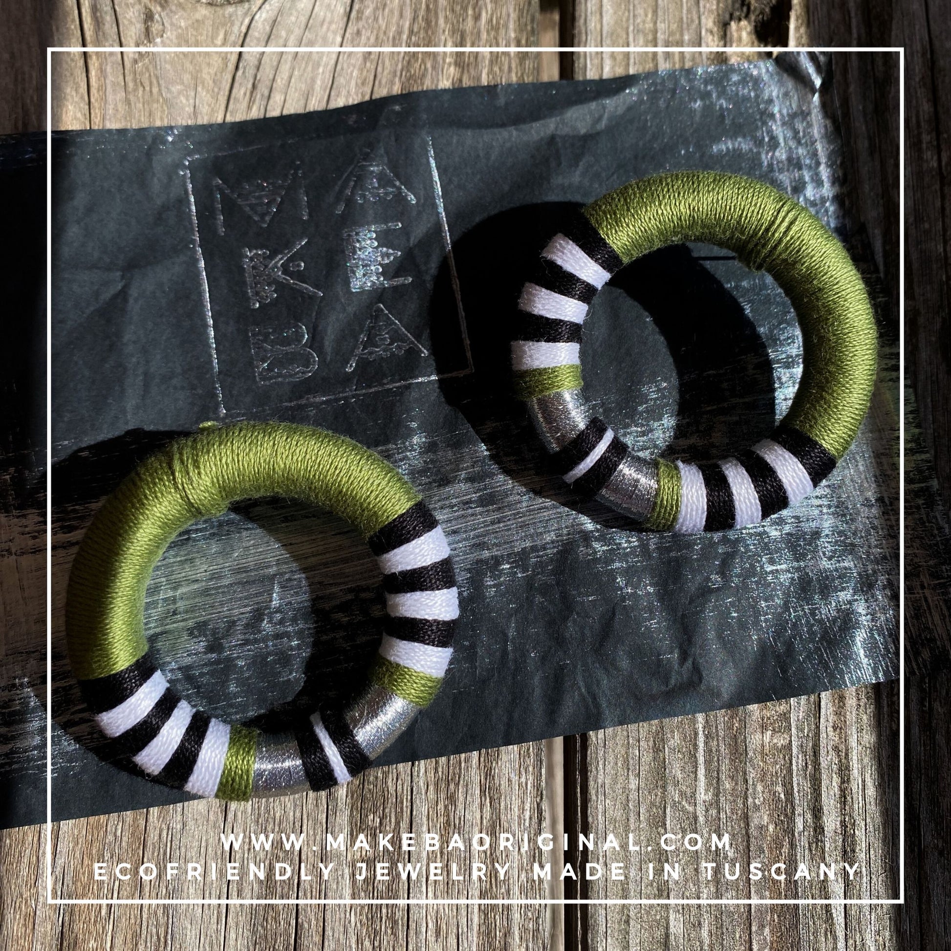 Il cerchietto è in legno, ricoperto di cotone organico con inserto centrale in filo di lamé oro, che rende l'orecchino leggerissimo e confortevole.