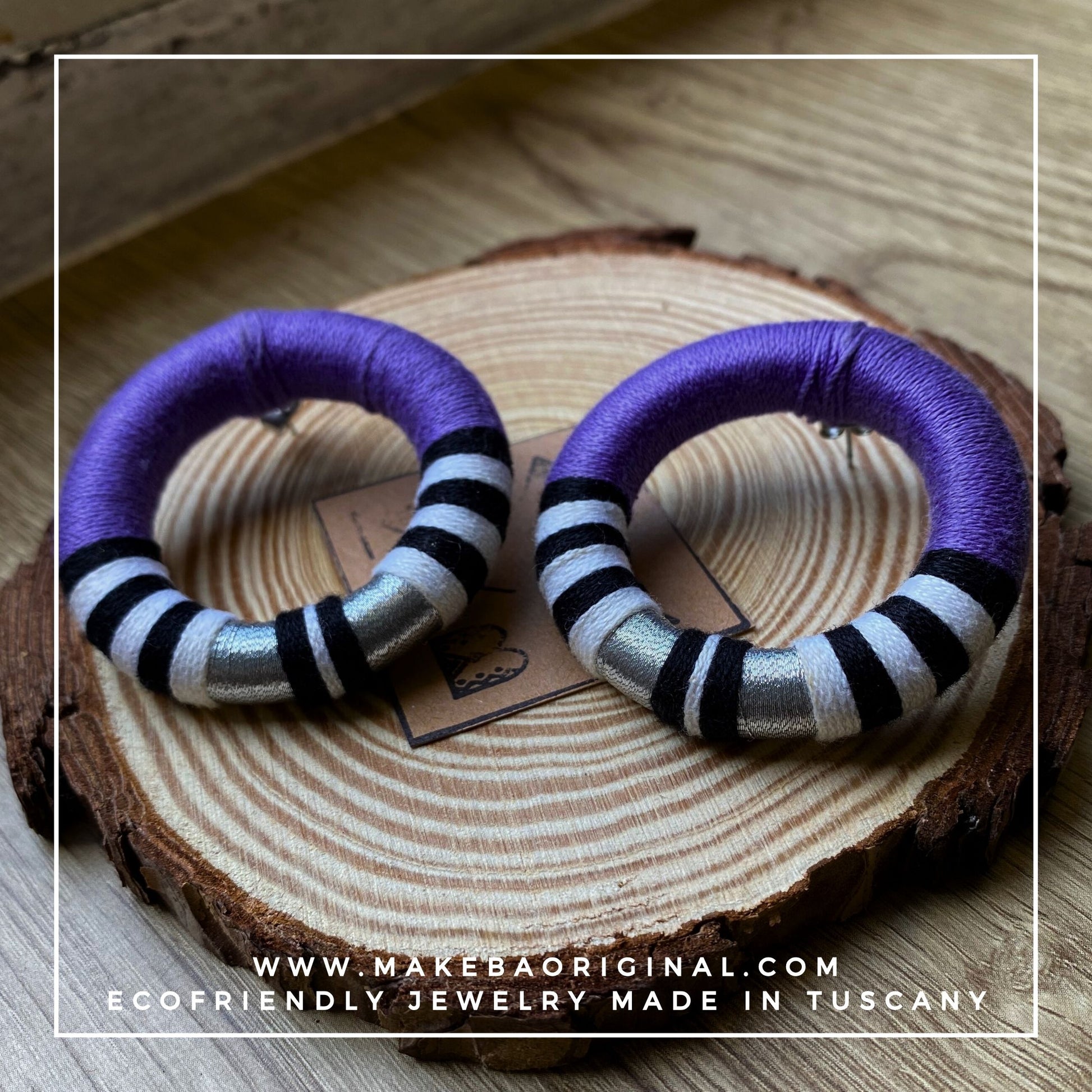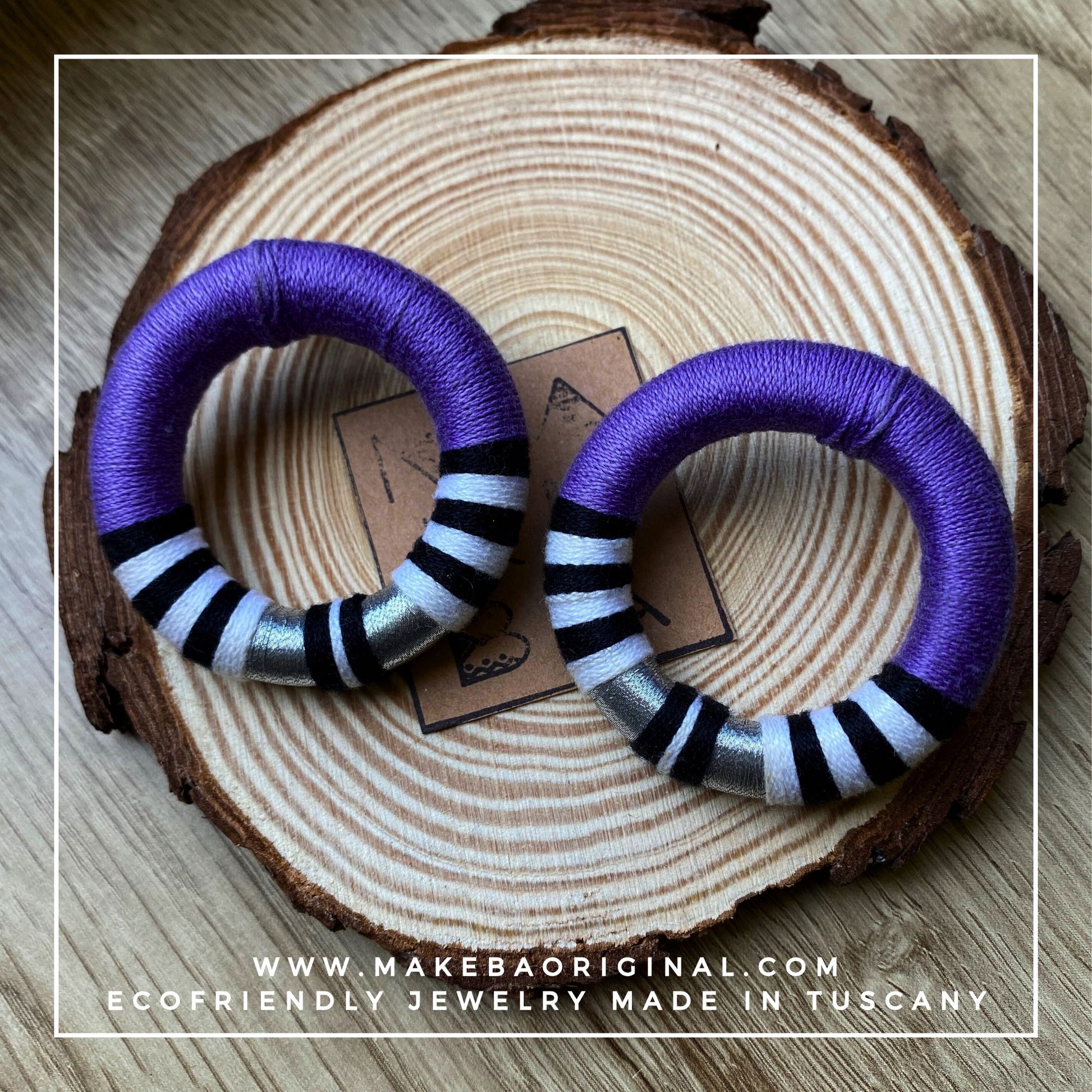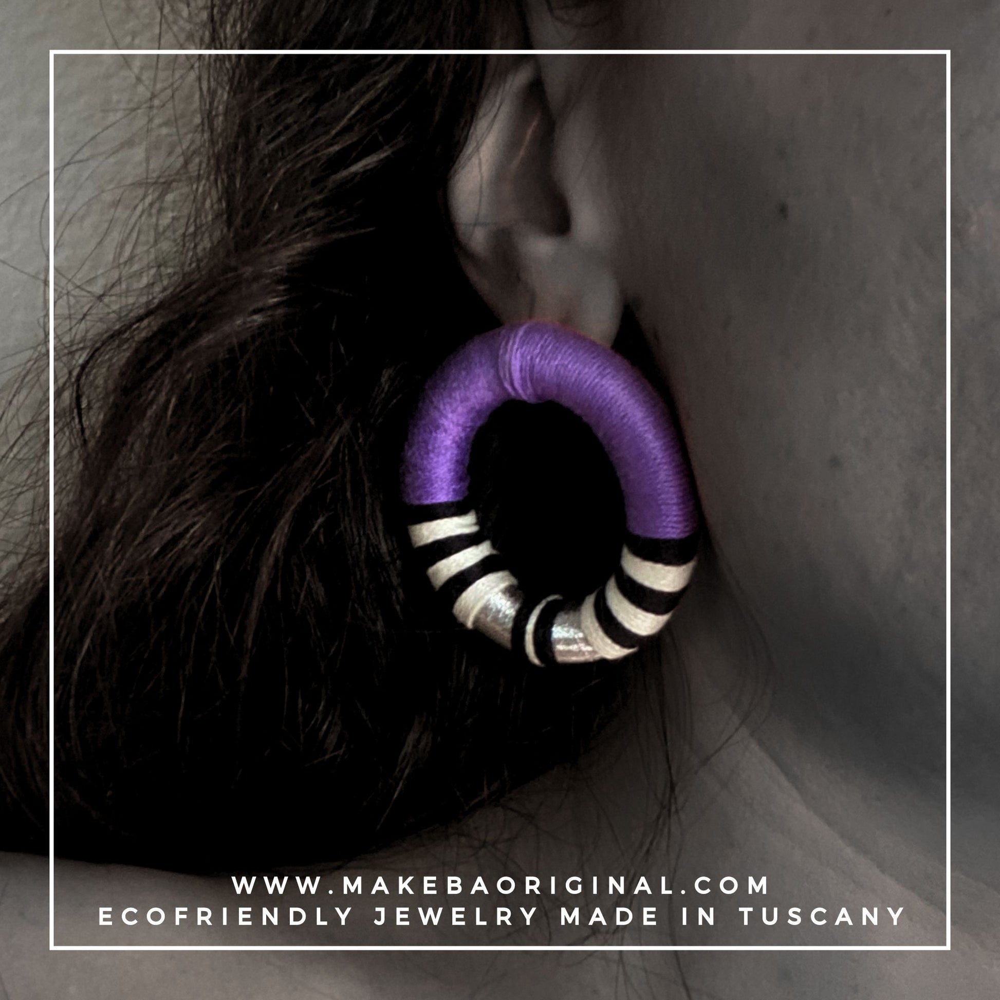 Il cerchietto è in legno, ricoperto di cotone organico con inserto centrale in filo di lamé, che rende l'orecchino leggerissimo e confortevole.