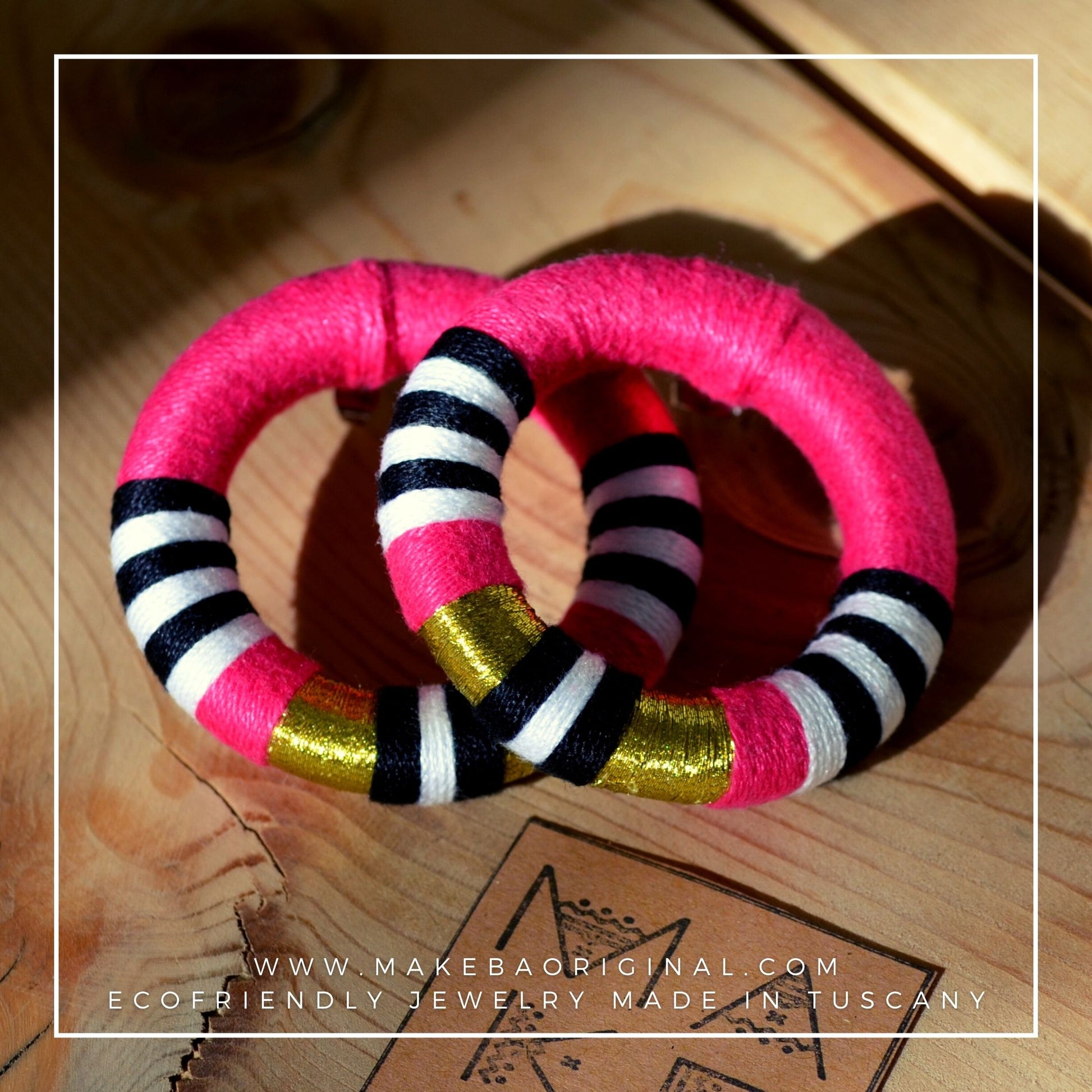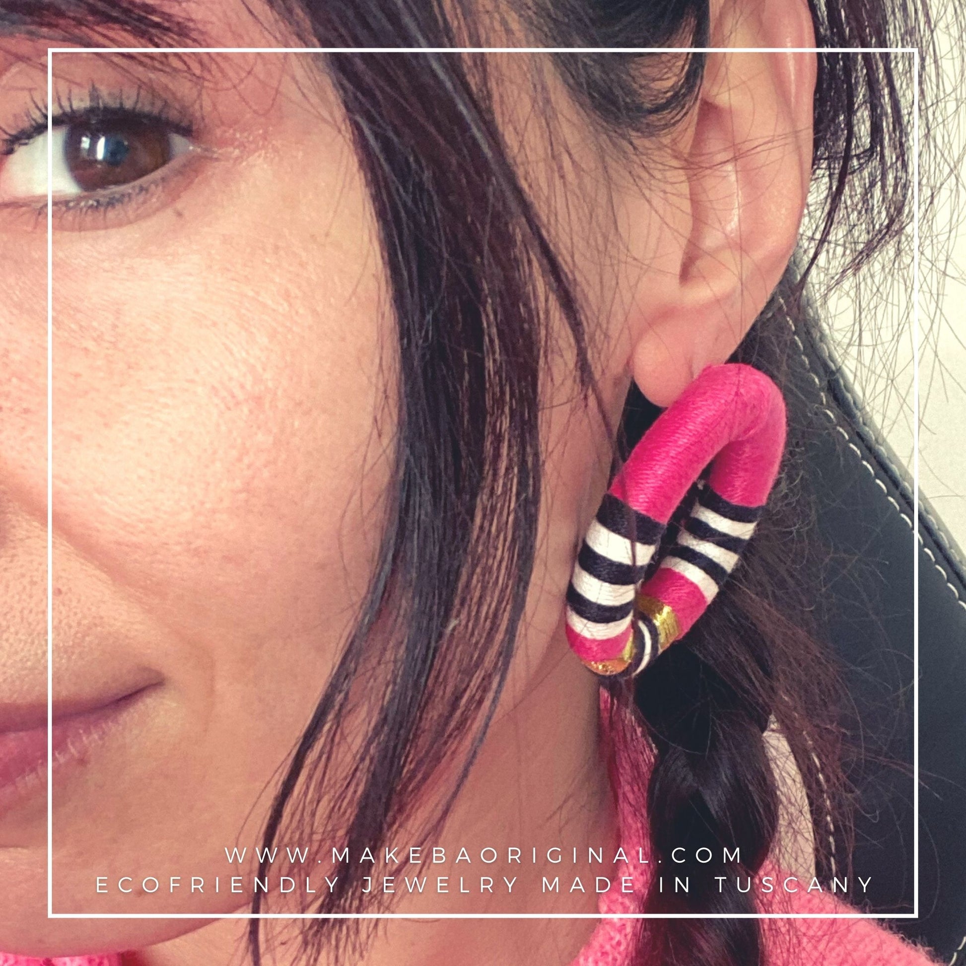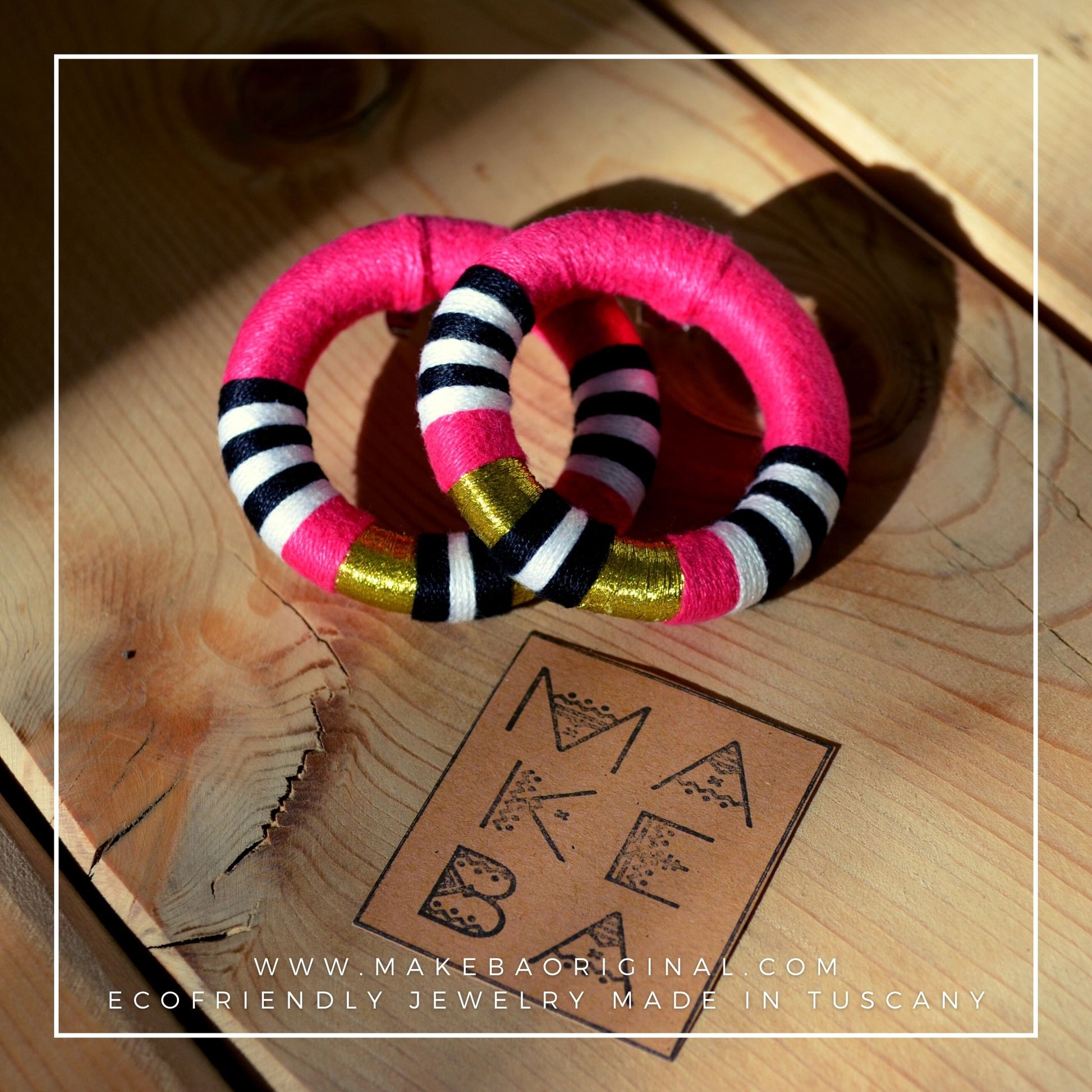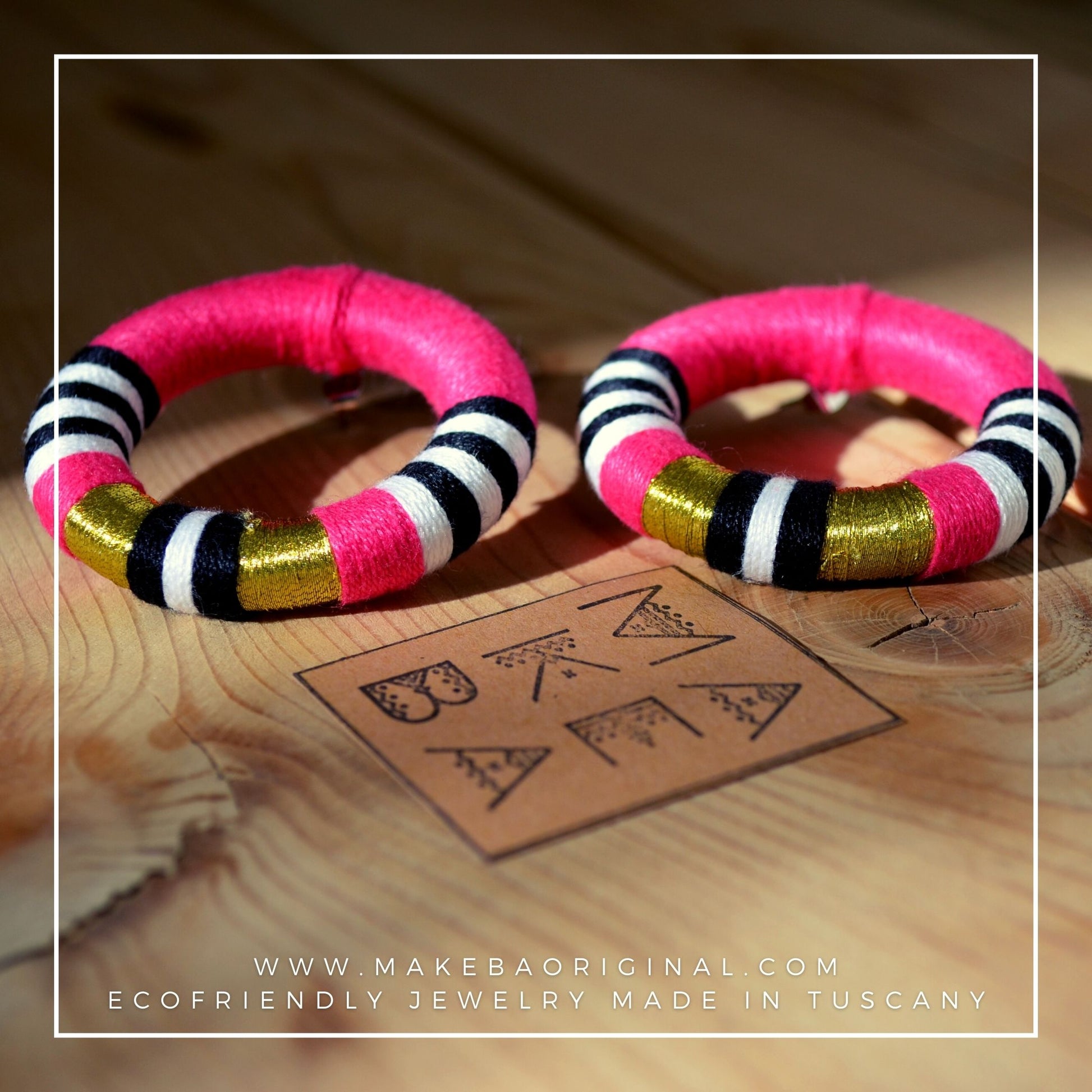 Il cerchietto è in legno, ricoperto di cotone organico con inserto centrale in filo di lamé oro, che rende l'orecchino leggerissimo e confortevole.