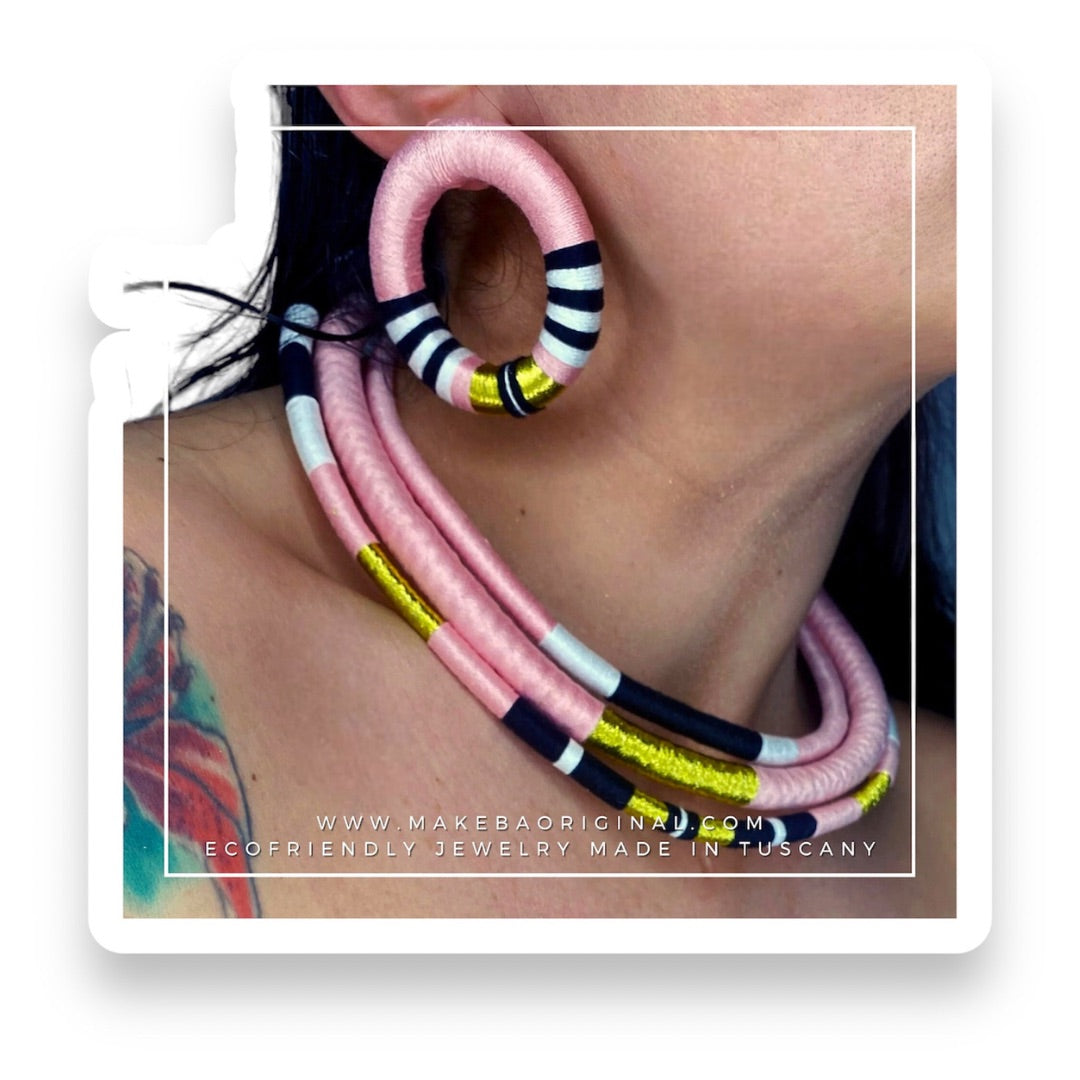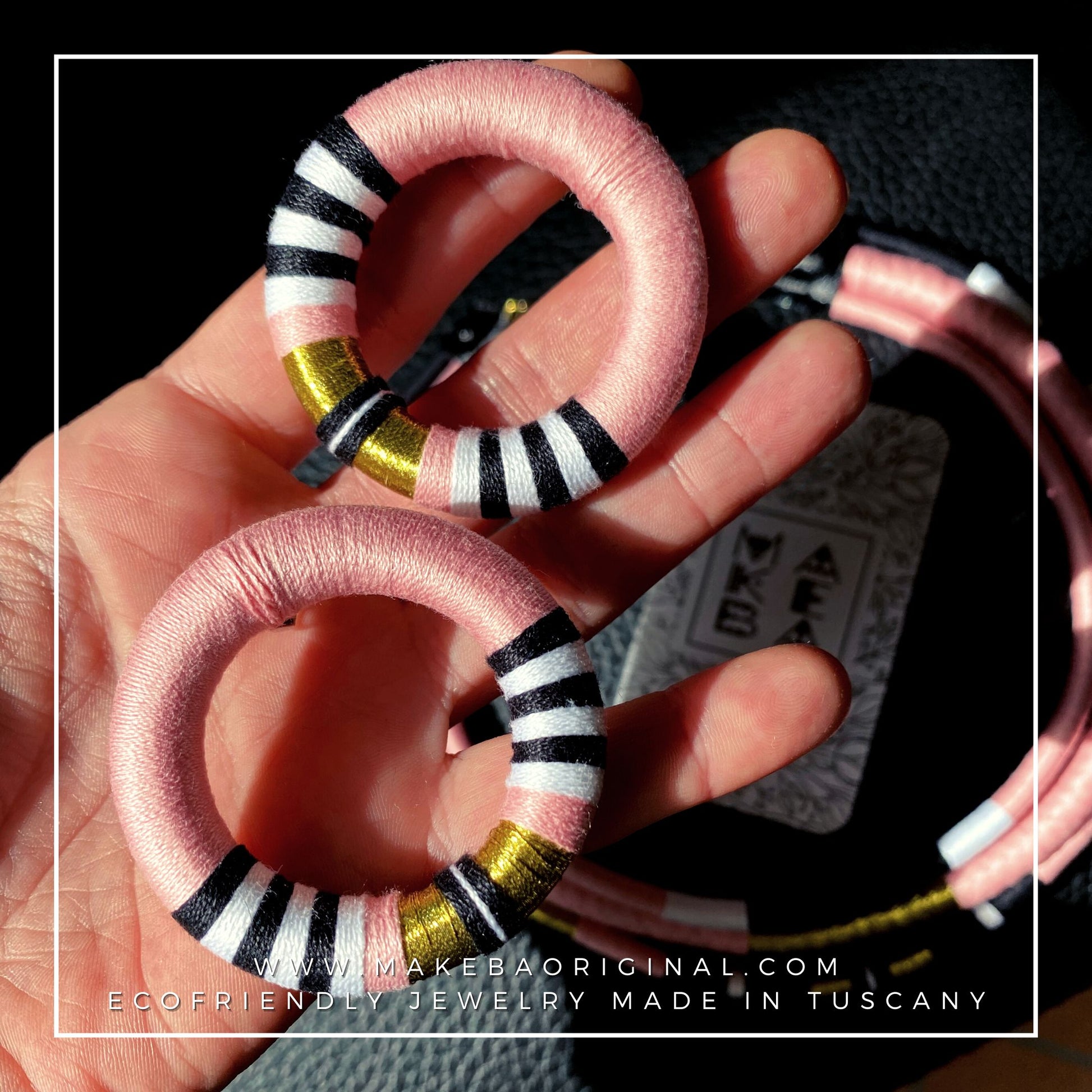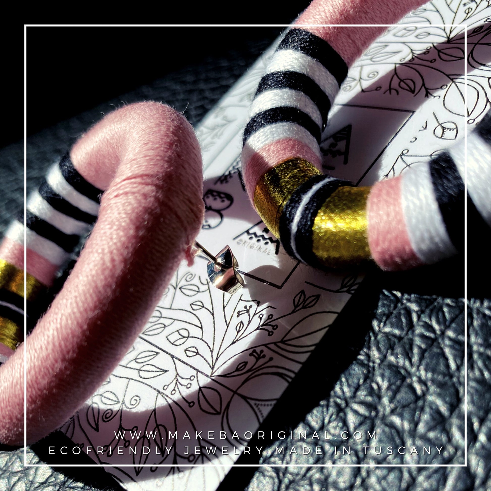 Il cerchietto è in legno, ricoperto di cotone organico con inserto centrale in filo di lamé oro, che rende l'orecchino leggerissimo e confortevole.