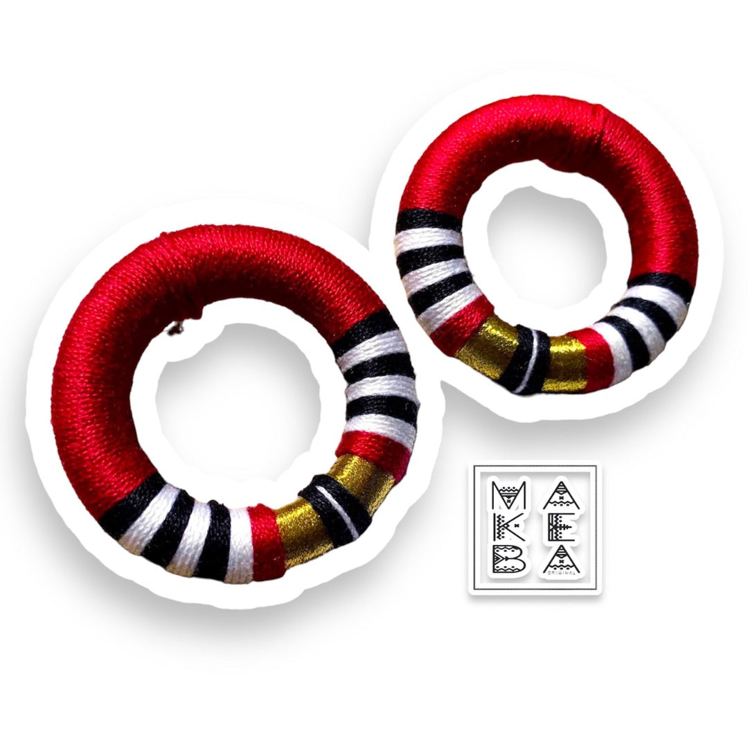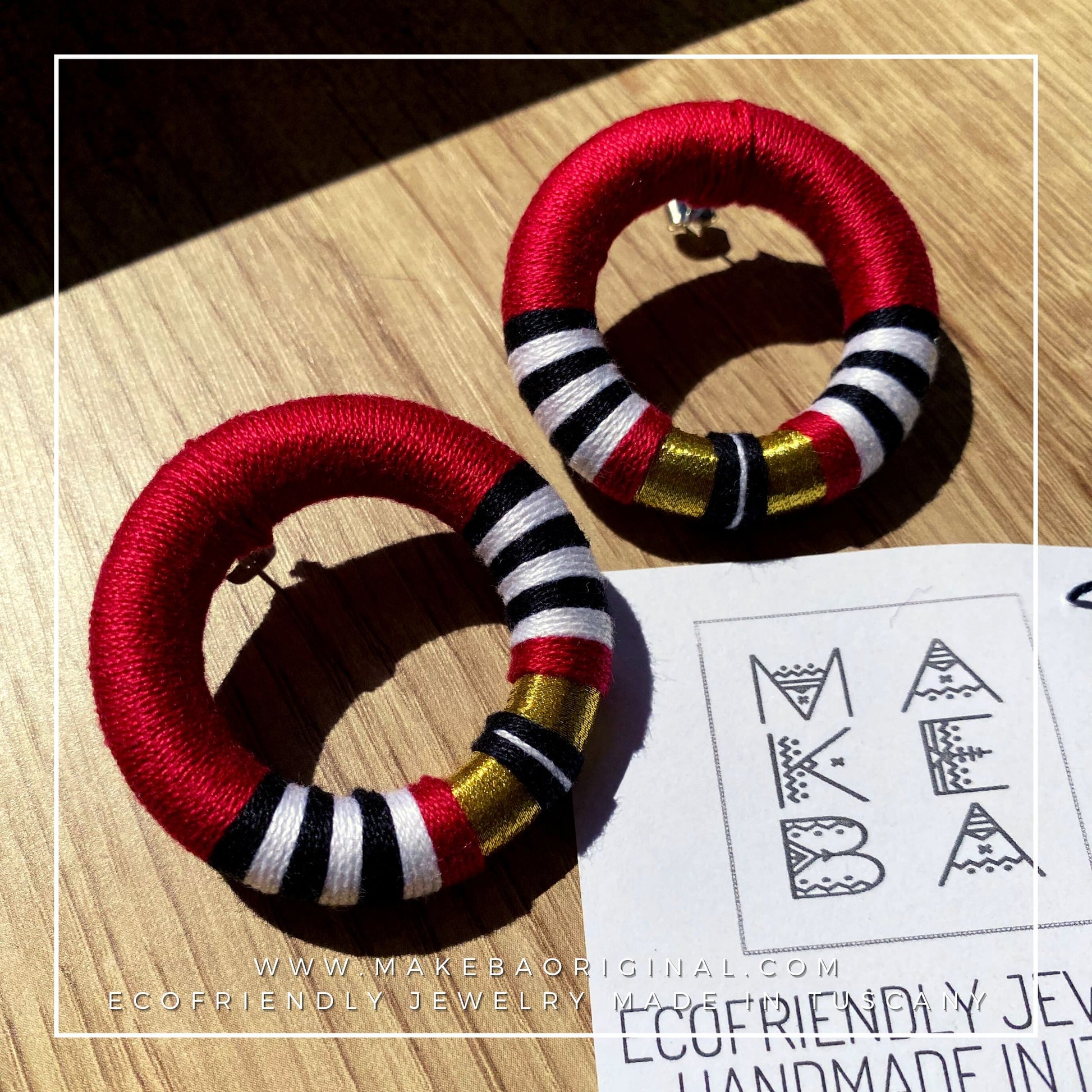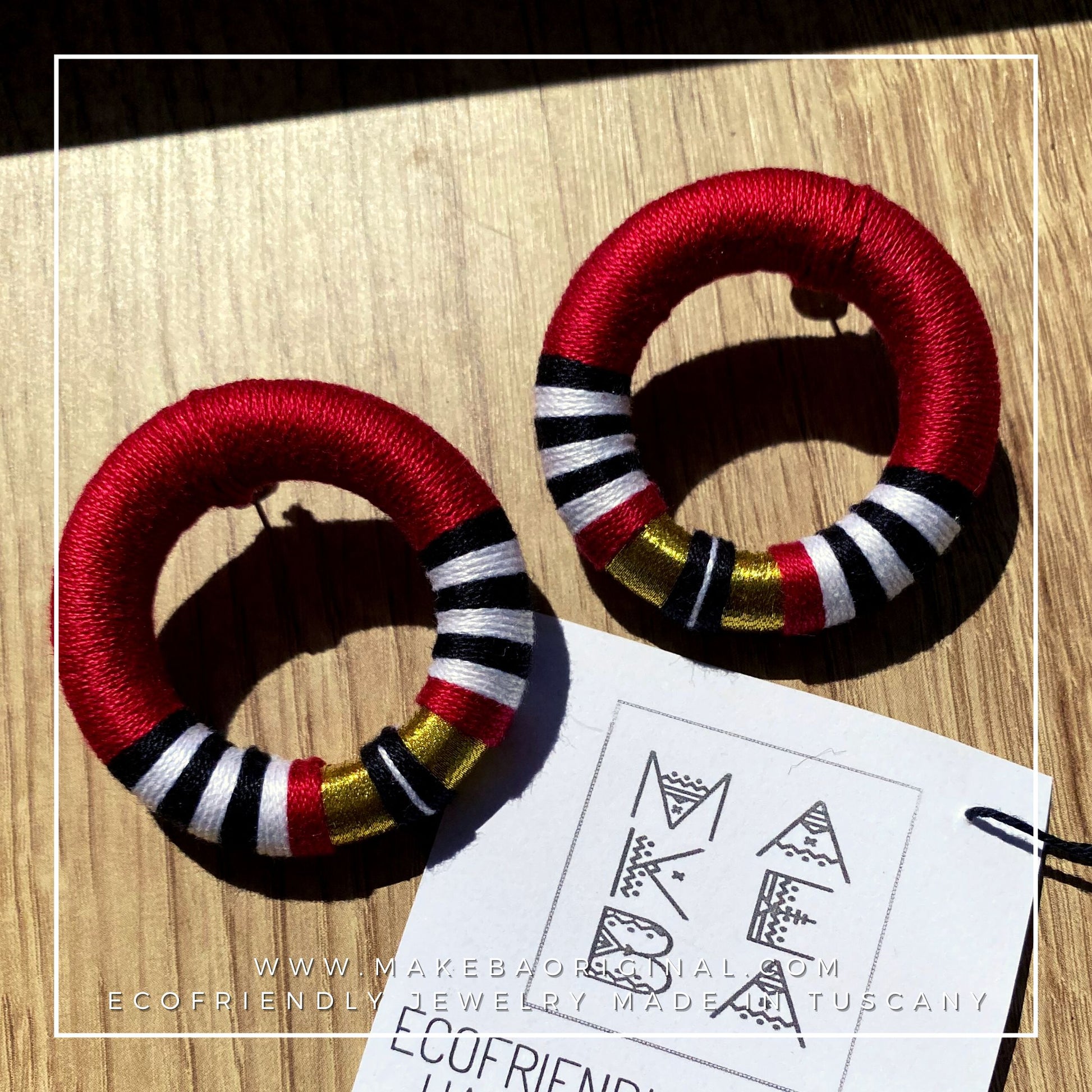Il cerchietto è in legno, ricoperto di cotone organico con inserto centrale in filo di lamé oro, che rende l'orecchino leggerissimo e confortevole.