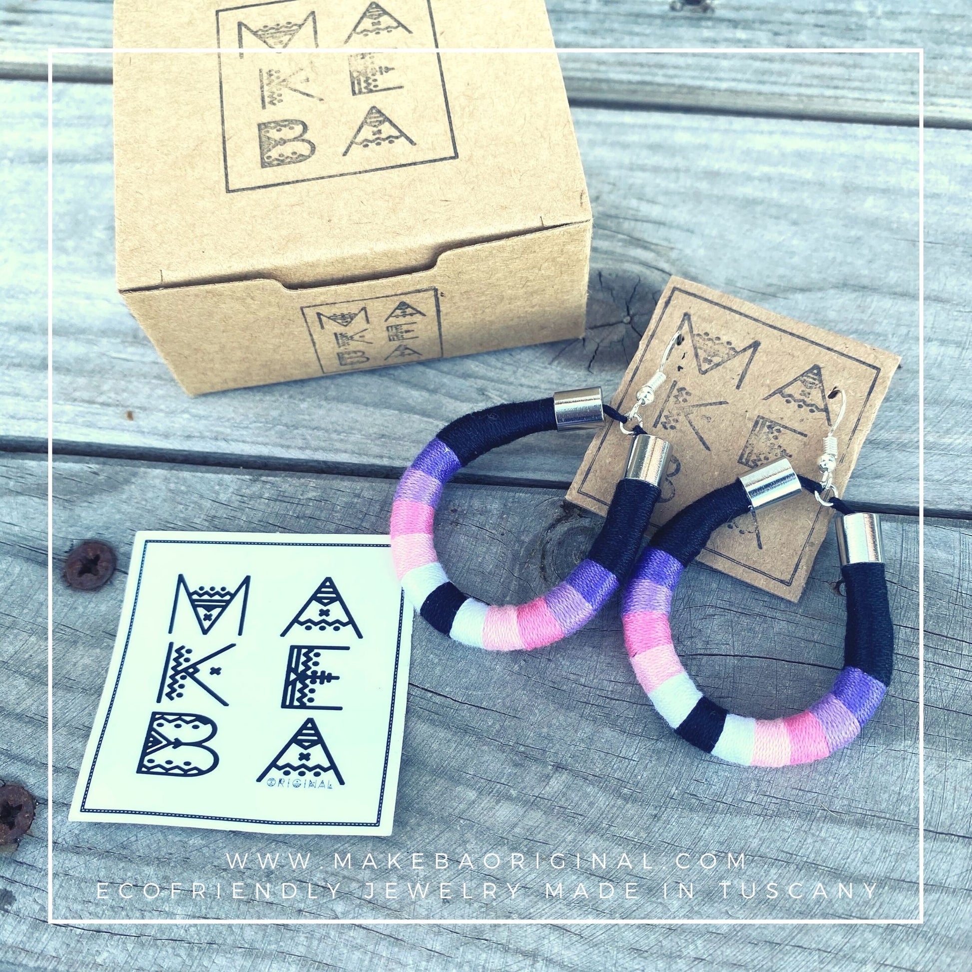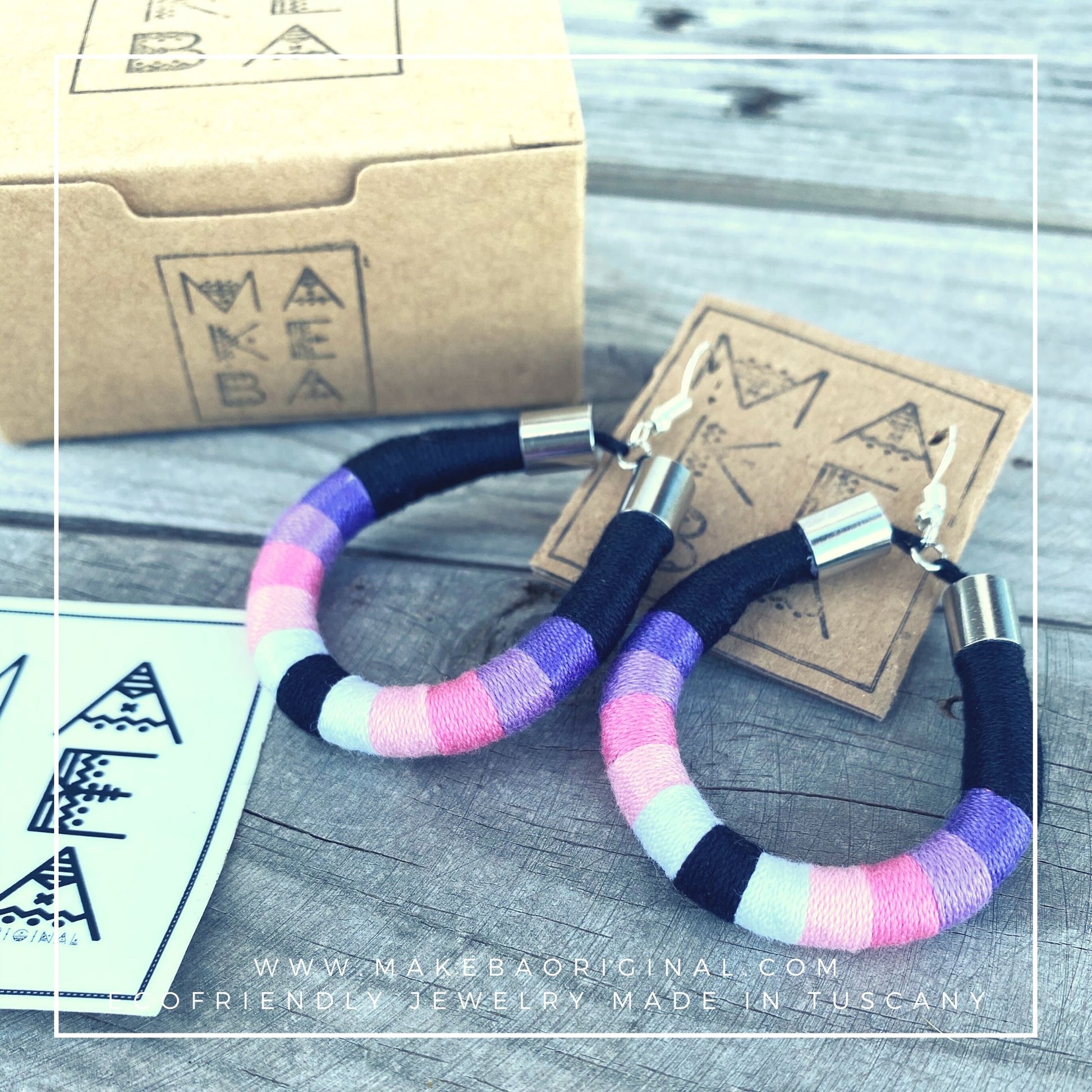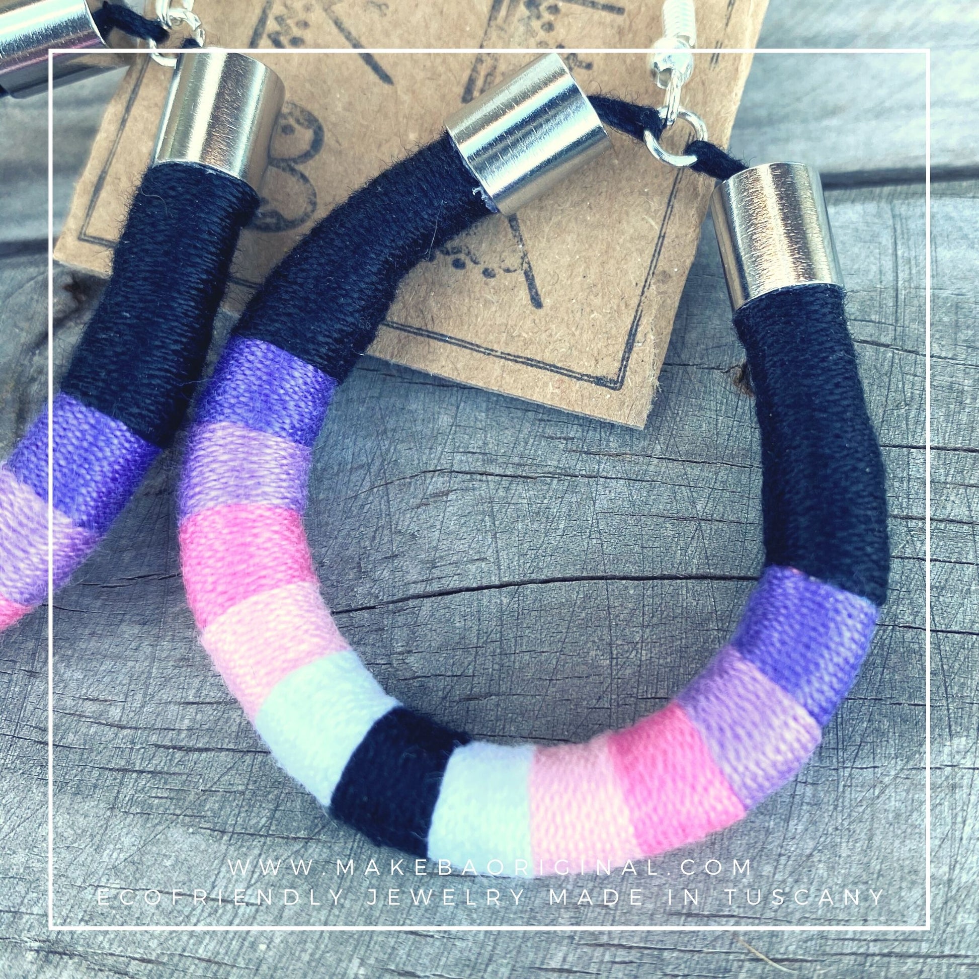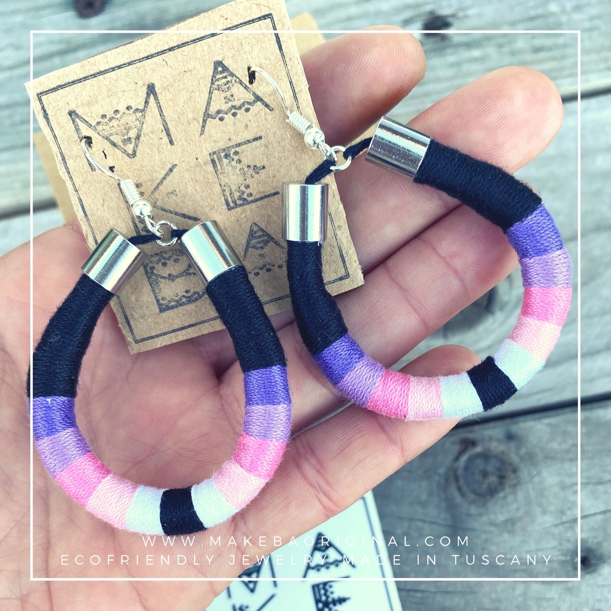 Orecchini leggeri a pendente, in cotone 100% e metallo acciaio anallergico, impreziositi da una lavorazione a gradiente di colore.