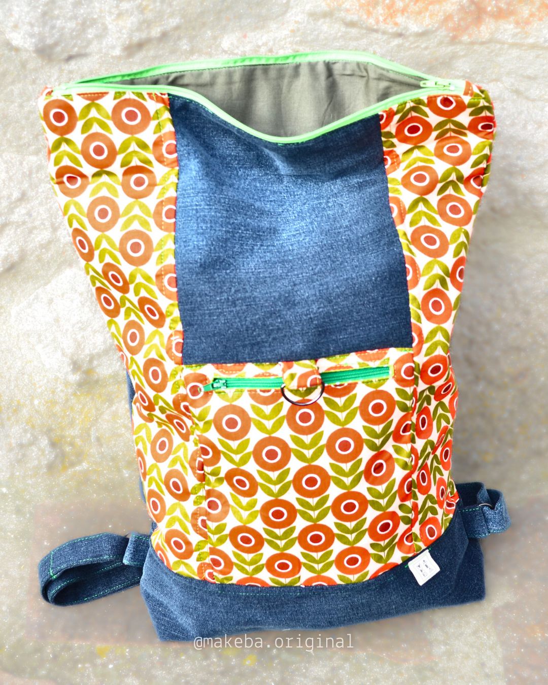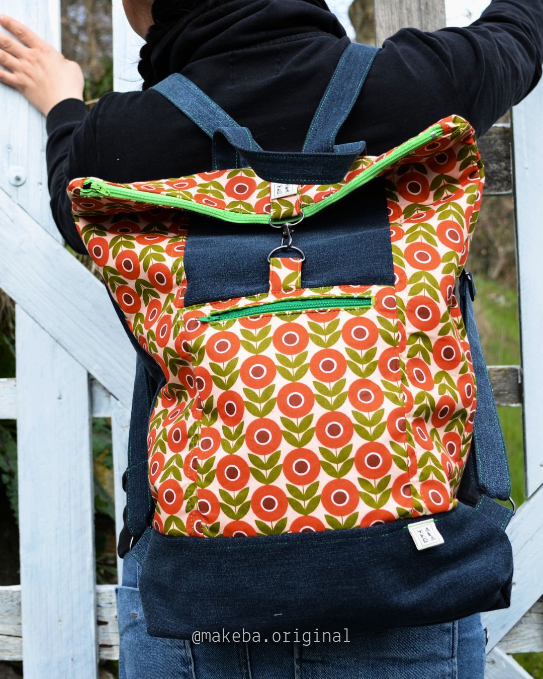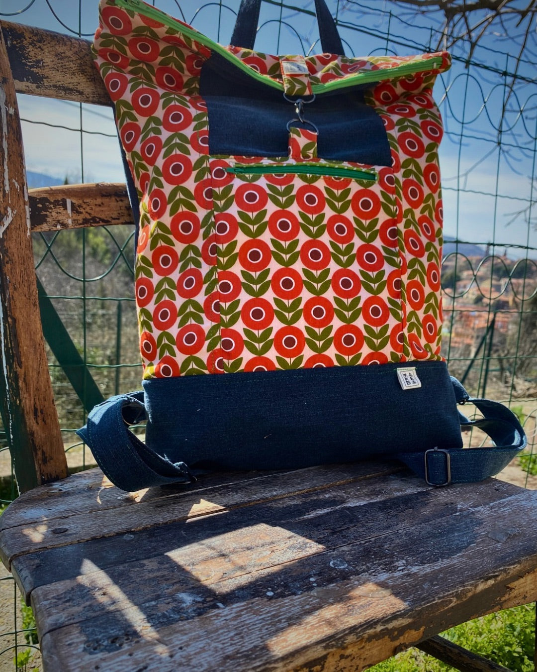 Zaino roll top realizzato con tessuti di recupero. Lo zaino si chiude con una zip. Ha una tasca frontale esterna, anch’essa chiude con zip ed una invece aperta interna, per contenere il tuo pc, libri o quello che vuoi.