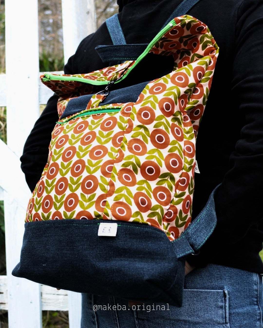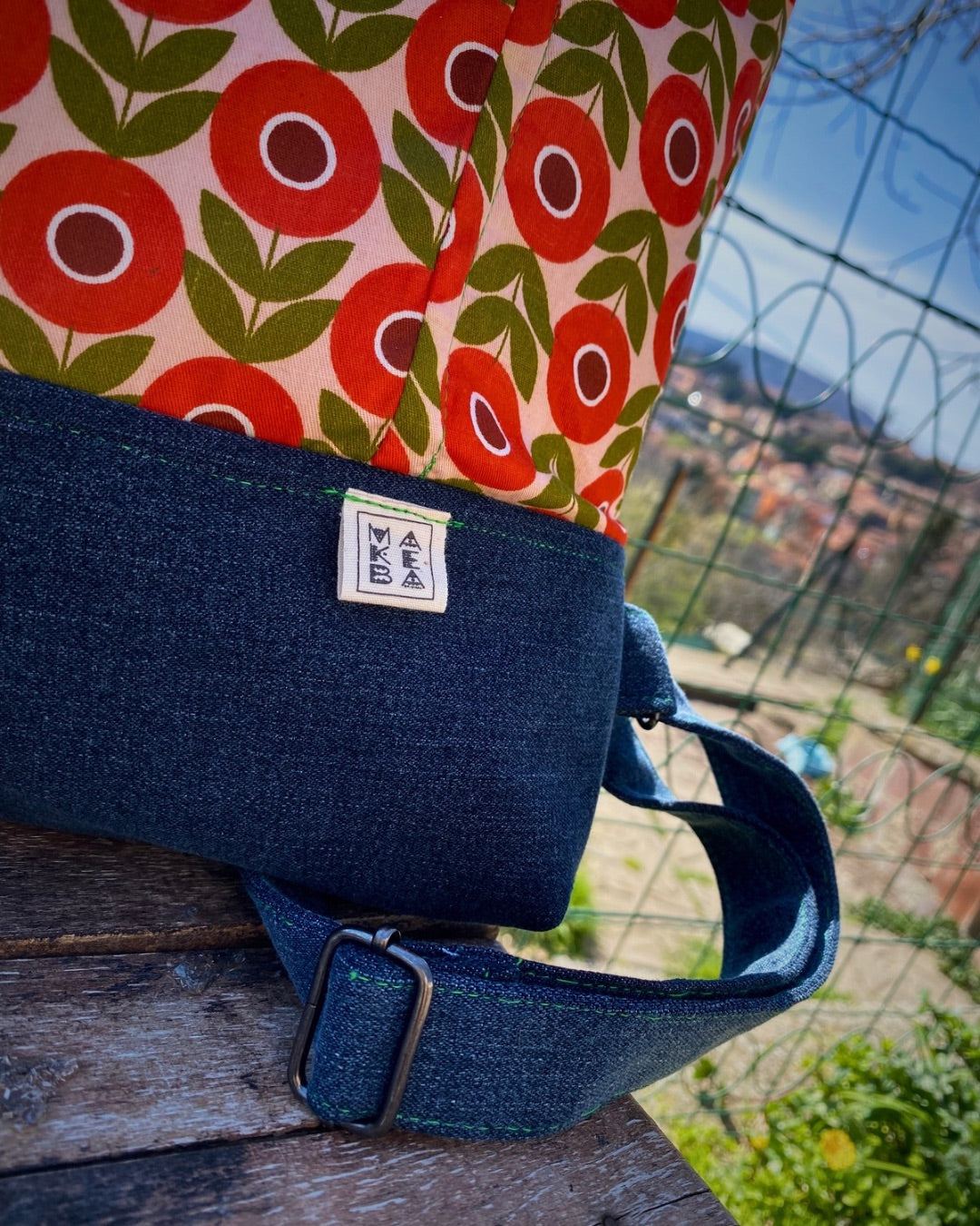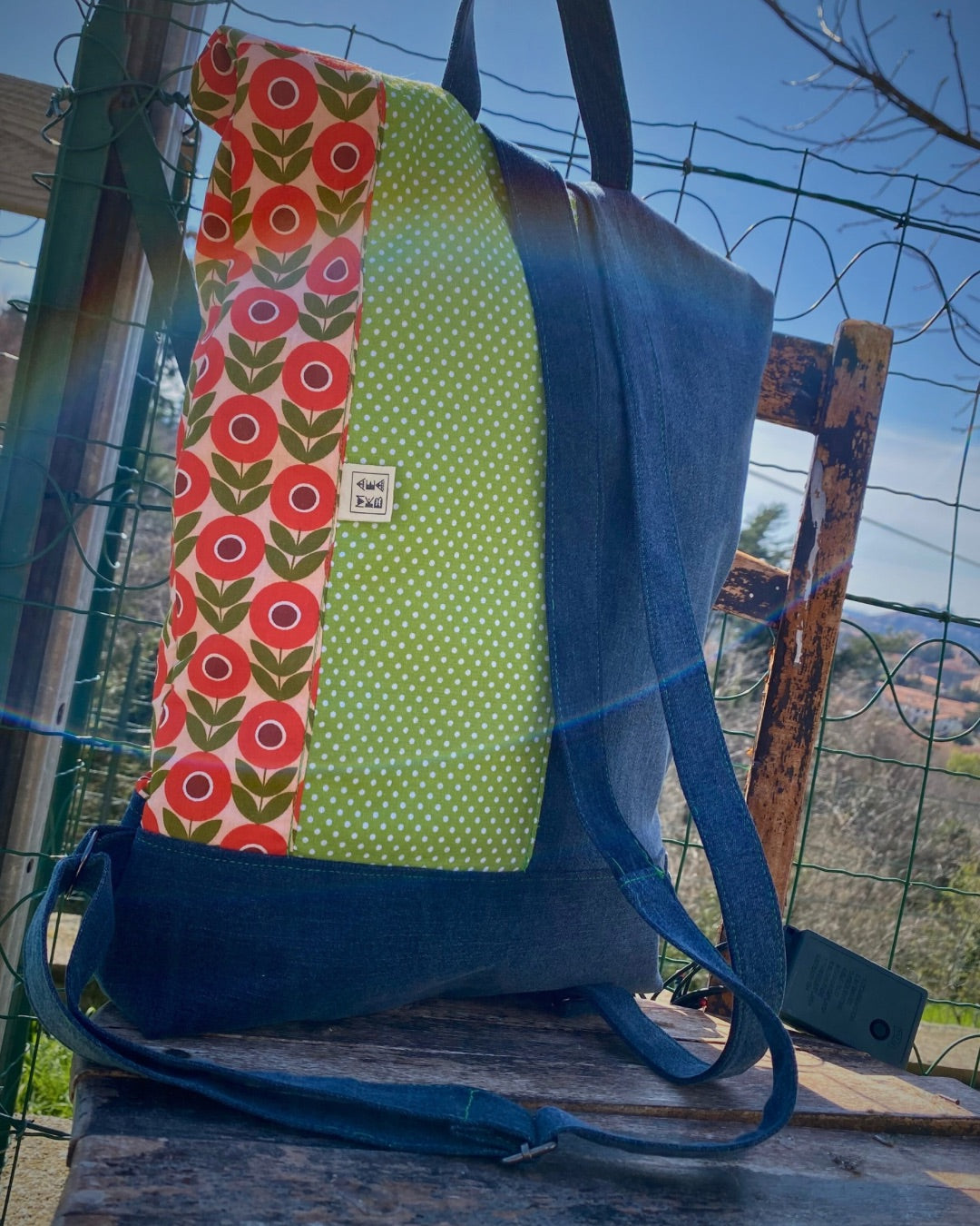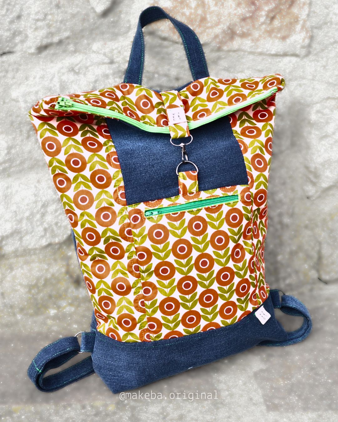 Zaino roll top realizzato con tessuti di recupero. Lo zaino si chiude con una zip. Ha una tasca frontale esterna, anch’essa chiude con zip ed una invece aperta interna, per contenere il tuo pc, libri o quello che vuoi.