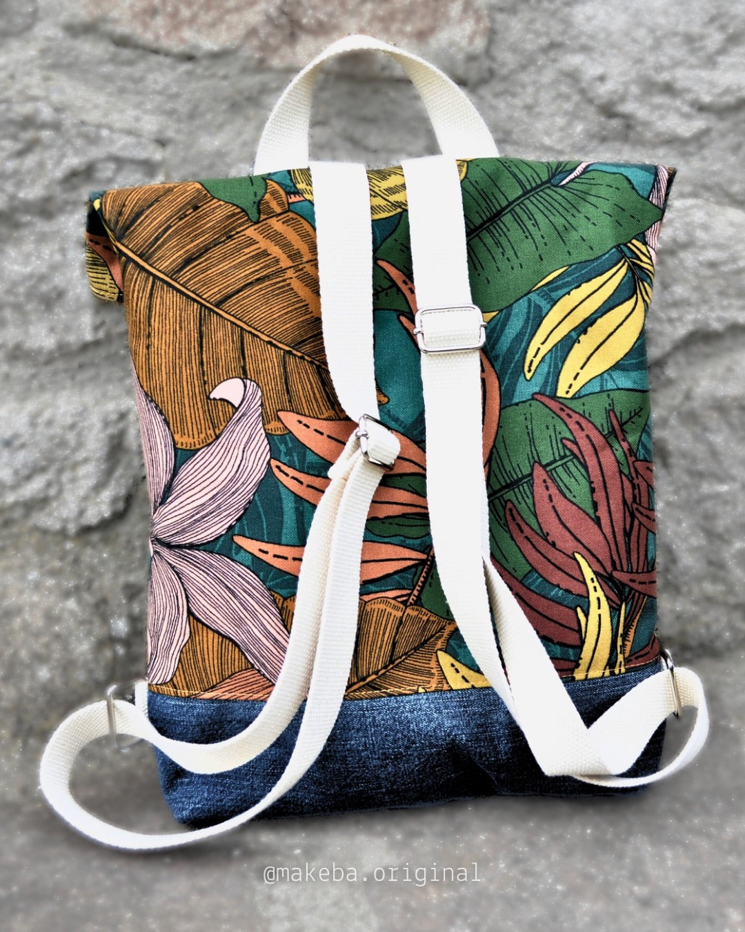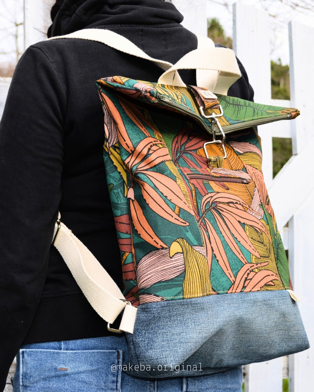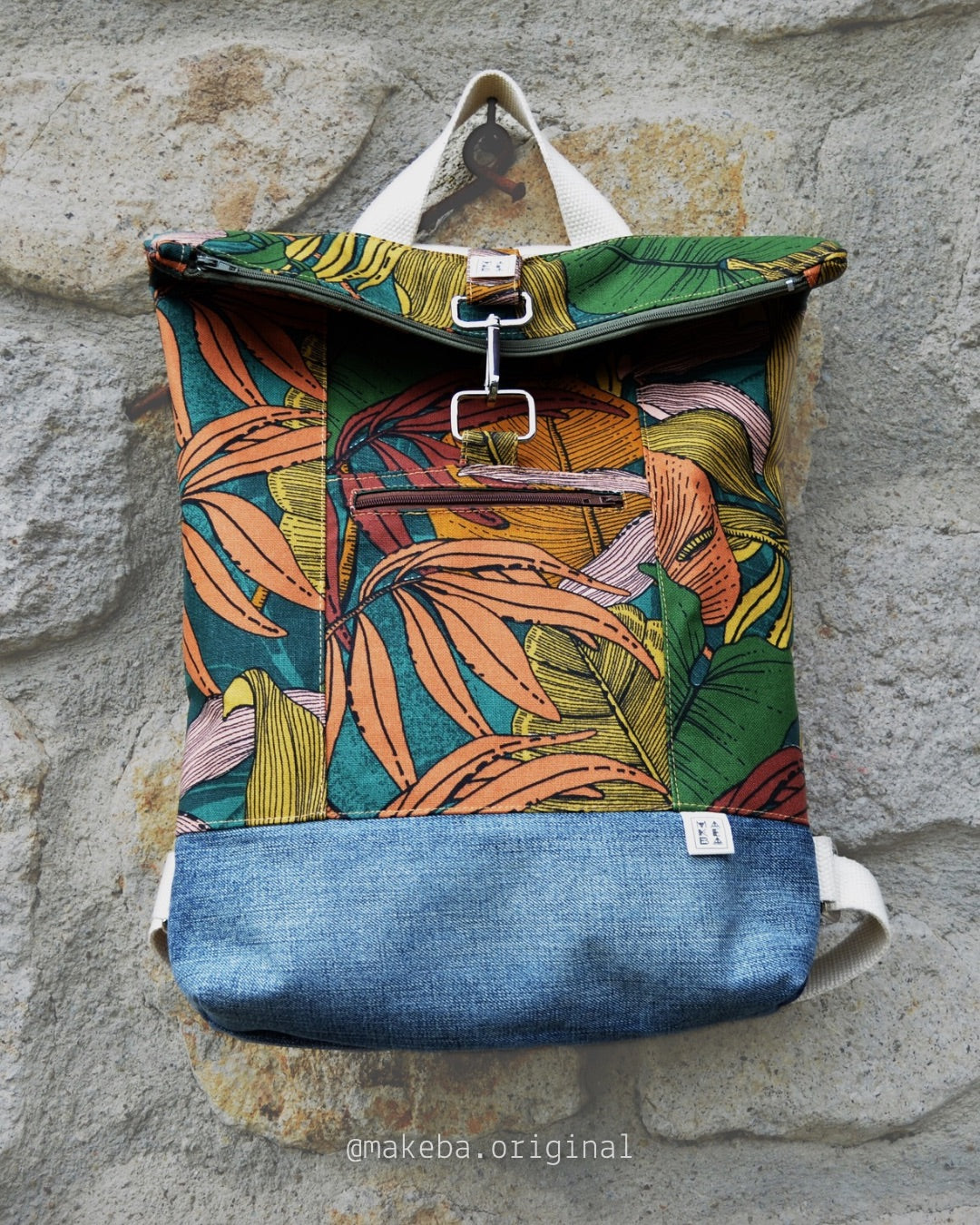 Zaino roll top realizzato con tessuti di recupero. Lo zaino si chiude con una zip. Ha una tasca frontale esterna, anch’essa chiude con zip ed una invece aperta interna, per contenere il tuo pc, libri o quello che vuoi.