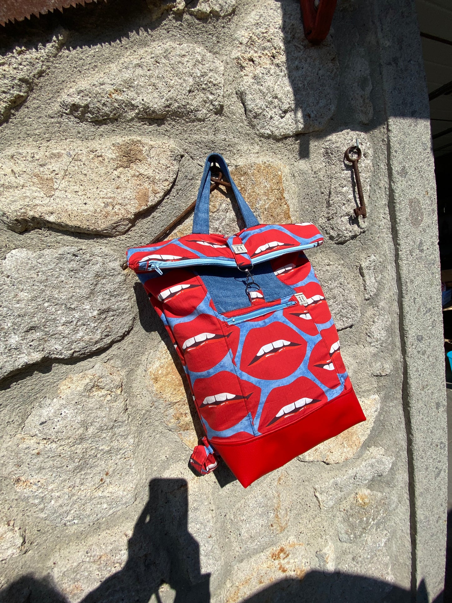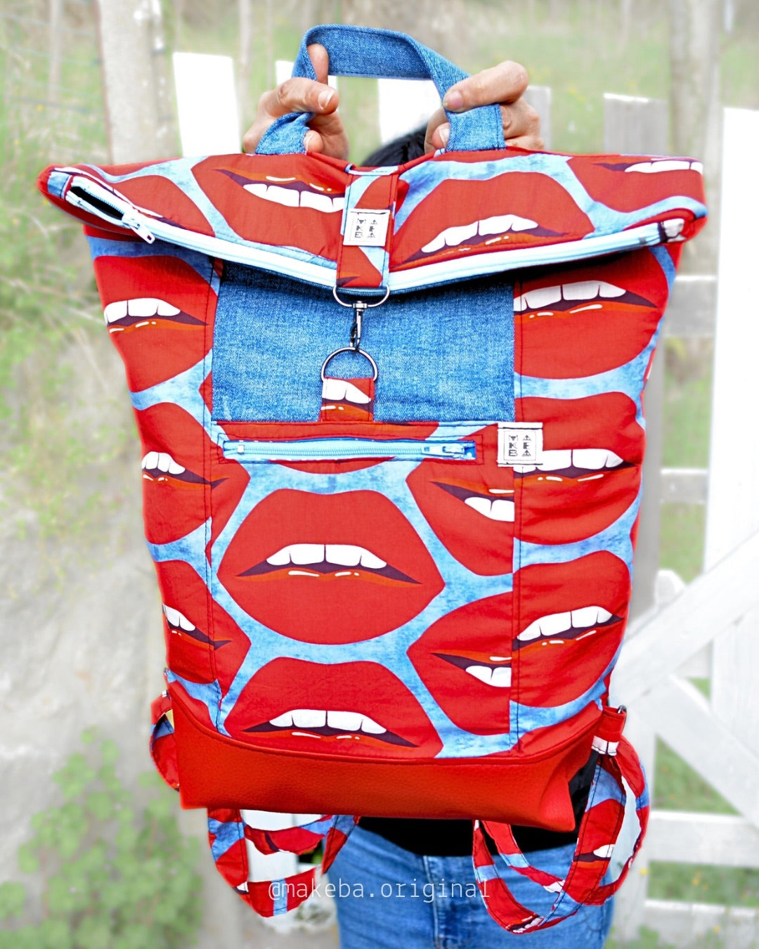 Zaino roll top realizzato con tessuti di recupero. Lo zaino si chiude con una zip. Ha una tasca frontale esterna, anch’essa chiude con zip. Puó contenere il tuo pc, libri o quello che vuoi.