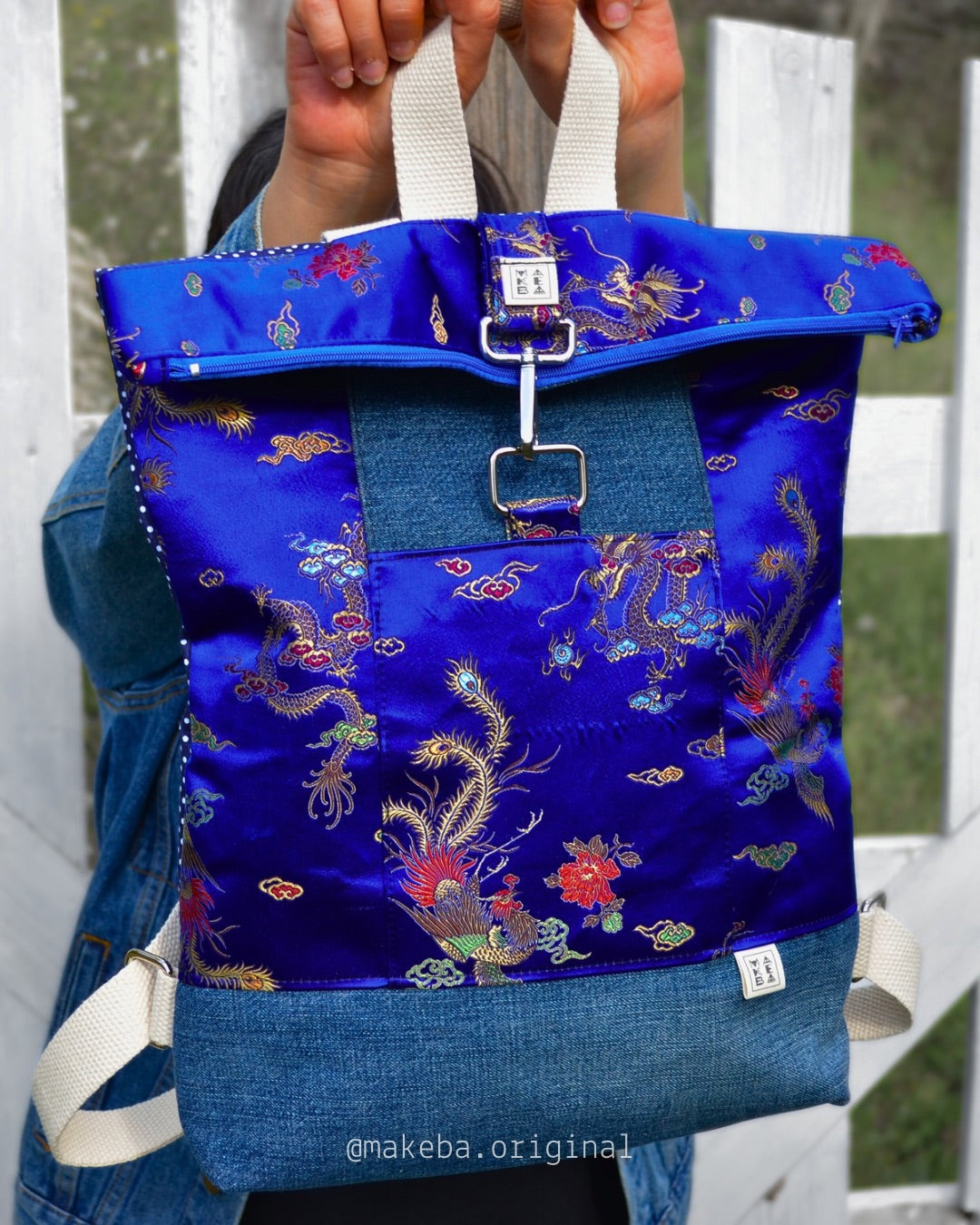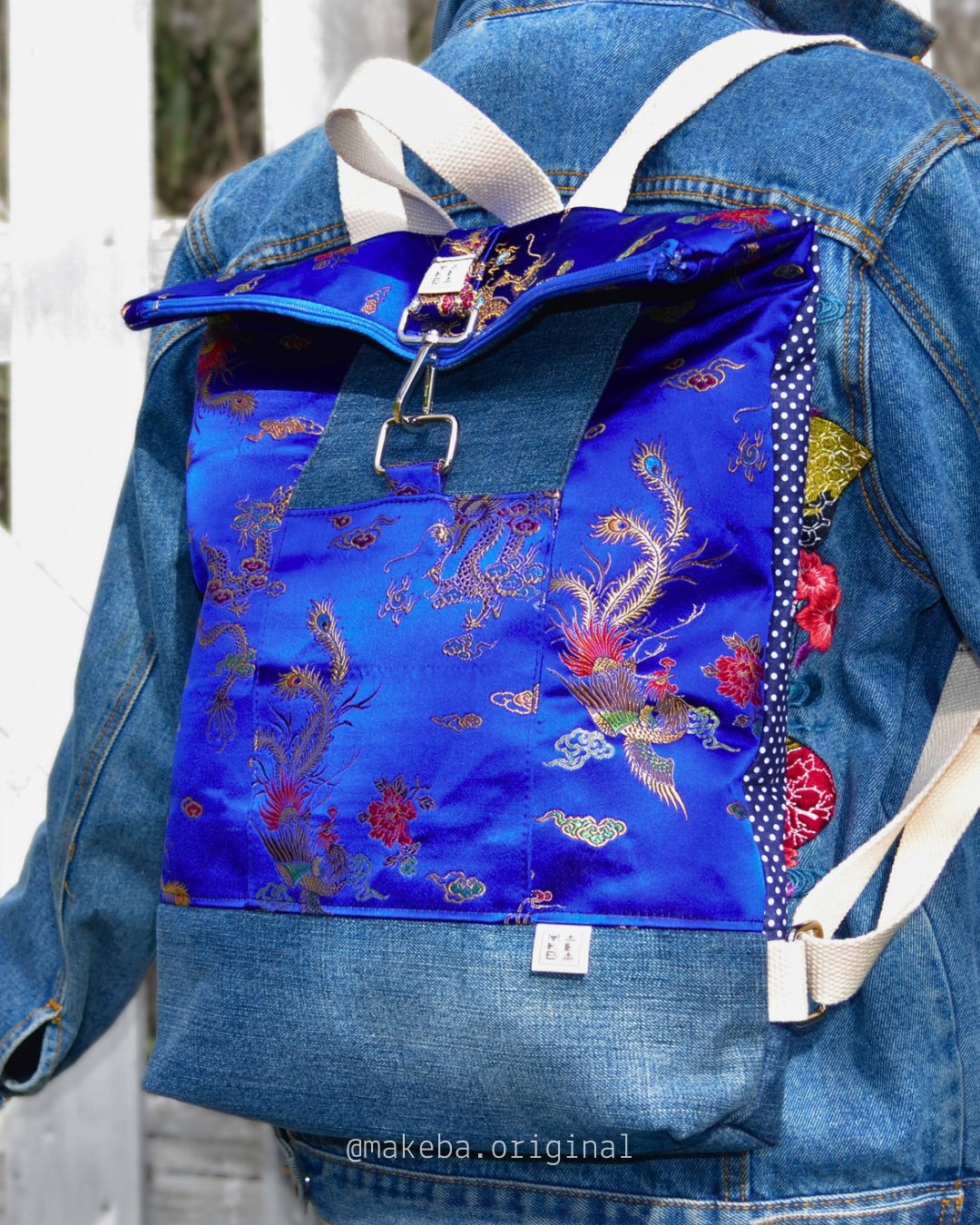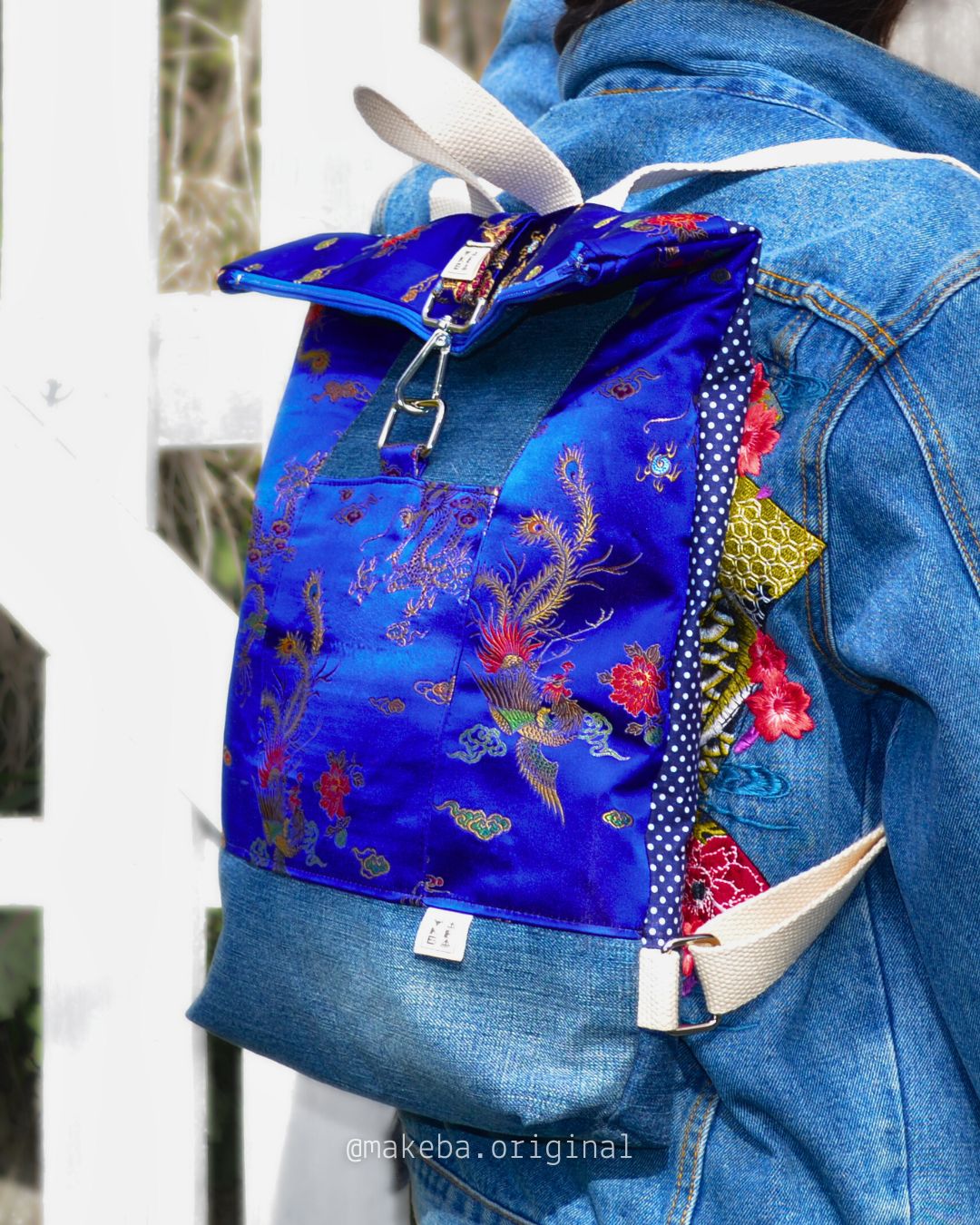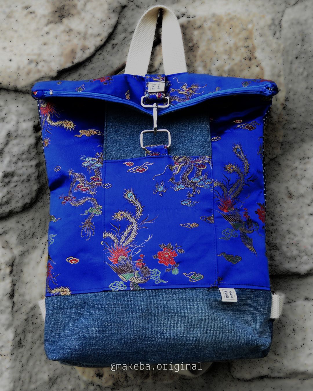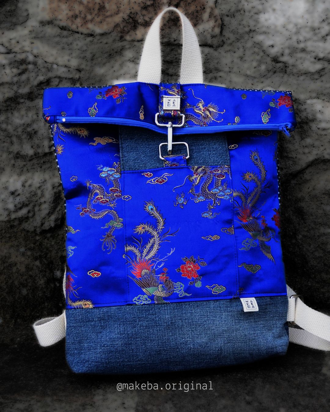 Zaino roll top realizzato con tessuti di recupero. Lo zaino si chiude con una zip. Ha una tasca frontale esterna, anch’essa chiude con zip ed una invece aperta interna, per contenere il tuo pc, libri o quello che vuoi.